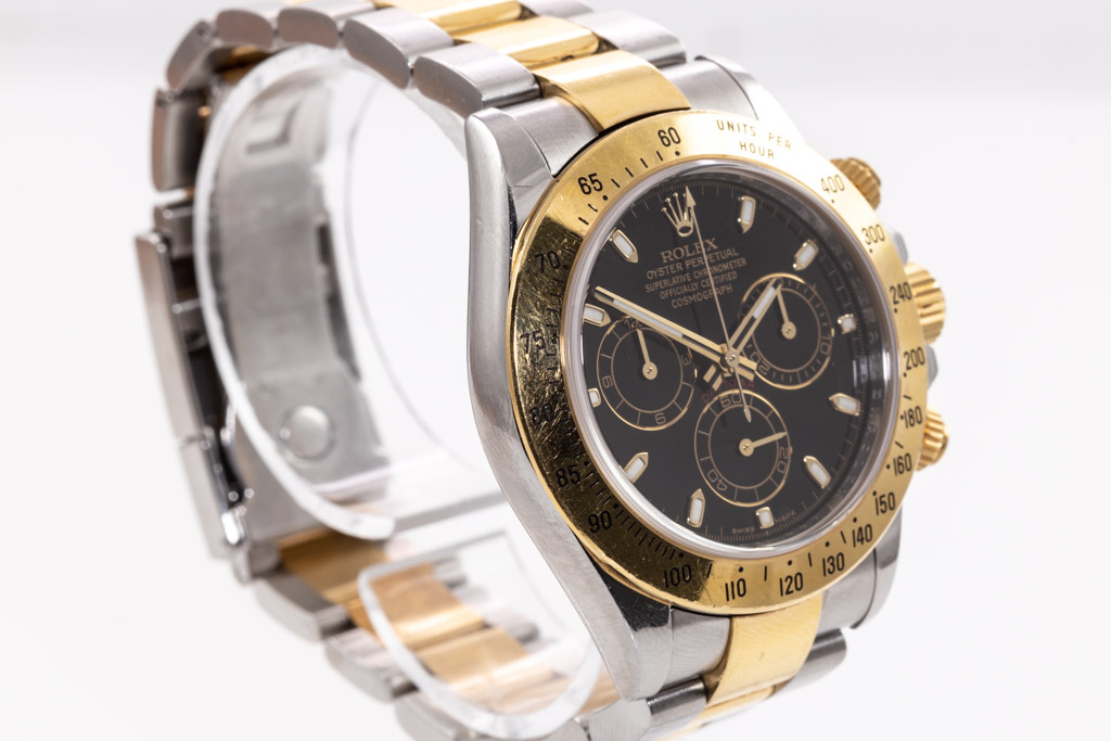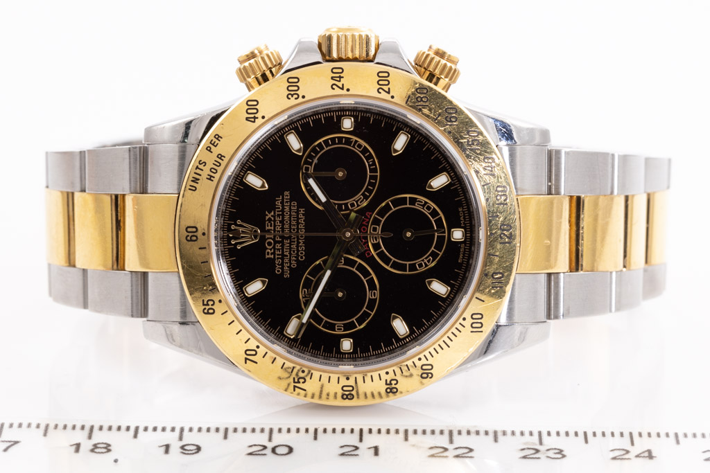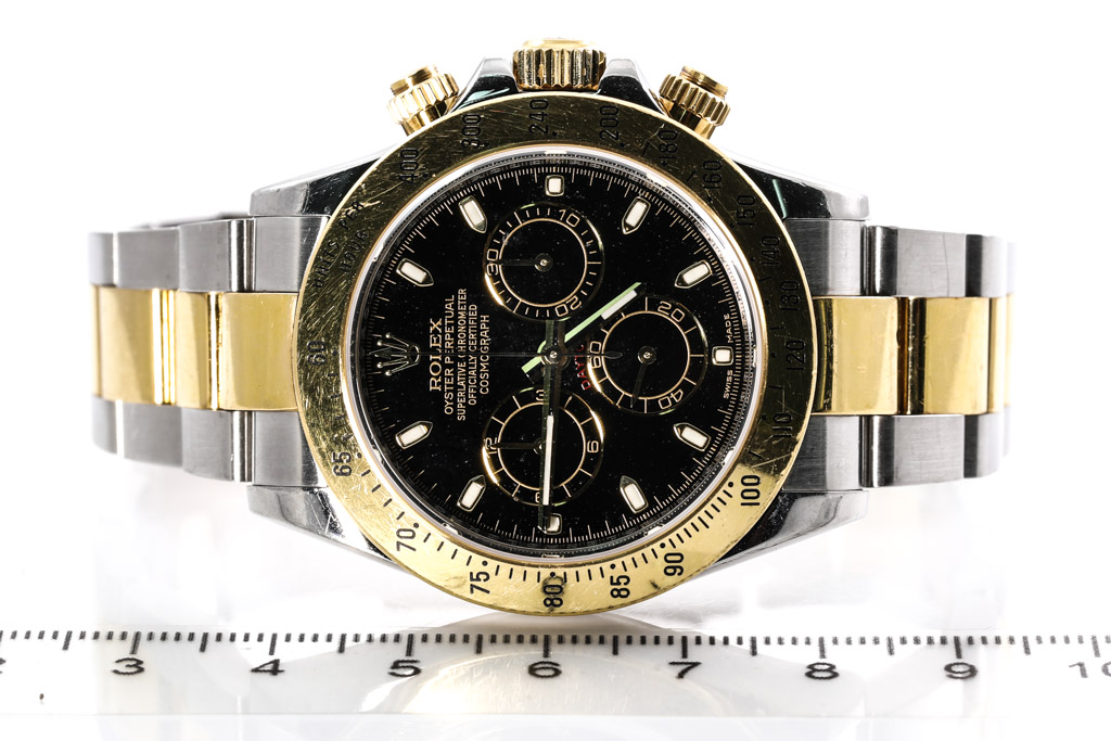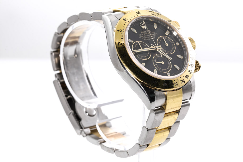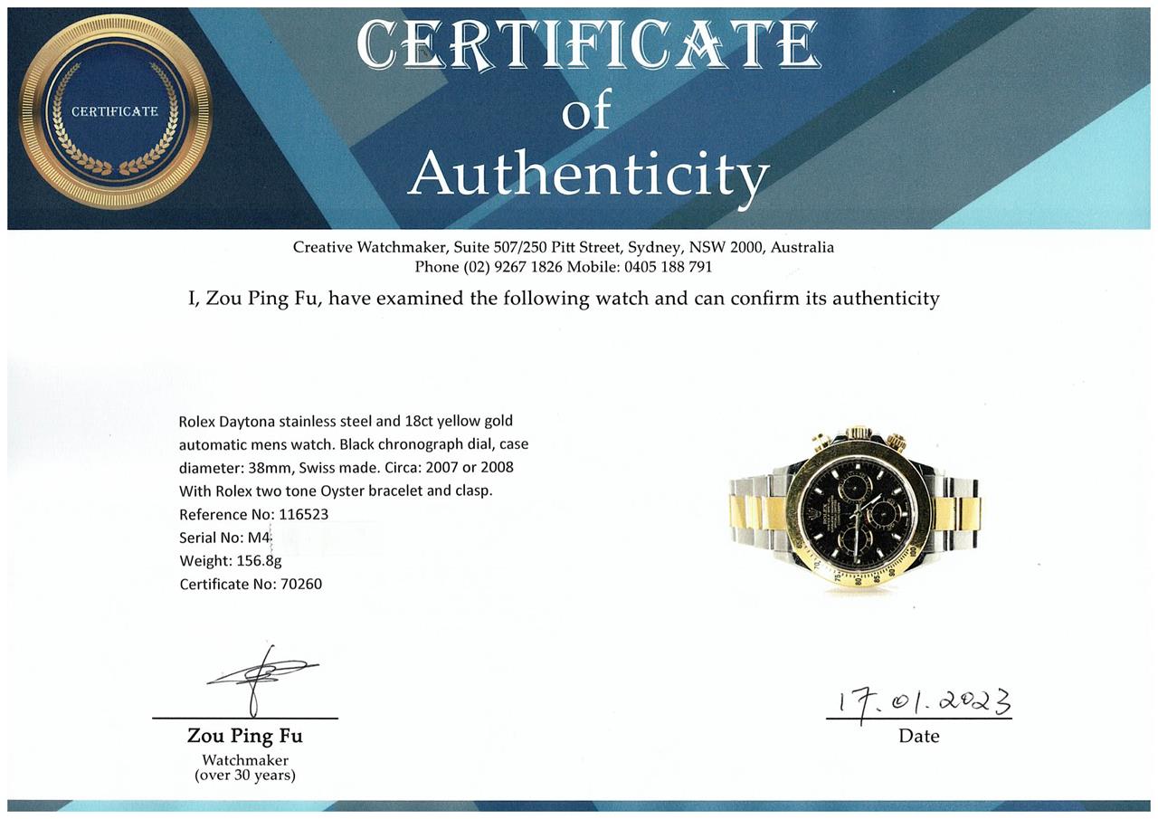 Rolex Daytona stainless steel and 18ct yellow gold automatic mens watch. Black chronograph dial, case diameter: 38mm, wrist size: 18.5cm, Swiss made. Ref# 116523. Circa: 2007 or 2008. With Rolex two tone Oyster bracelet and clasp. With Certificate of authenticity, Rolex box. 3 month FSA warranty. (Pre-owned)