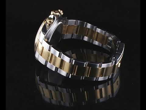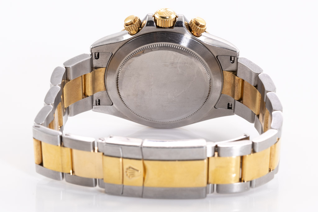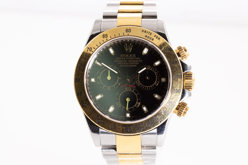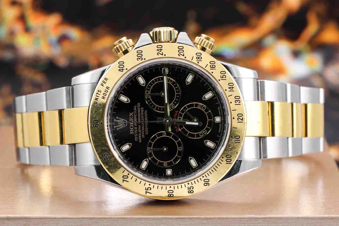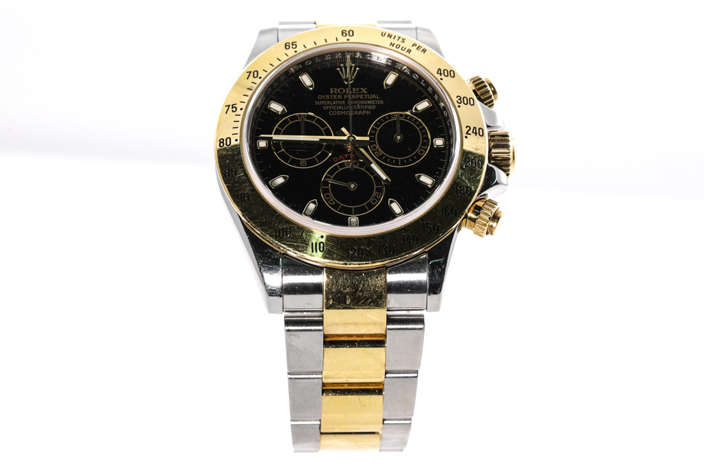 Rolex Daytona stainless steel and 18ct yellow gold automatic mens watch. Black chronograph dial, case diameter: 38mm, wrist size: 18.5cm, Swiss made. Ref# 116523. Circa: 2007 or 2008. With Rolex two tone Oyster bracelet and clasp. With Certificate of authenticity, Rolex box. 3 month FSA warranty. (Pre-owned)