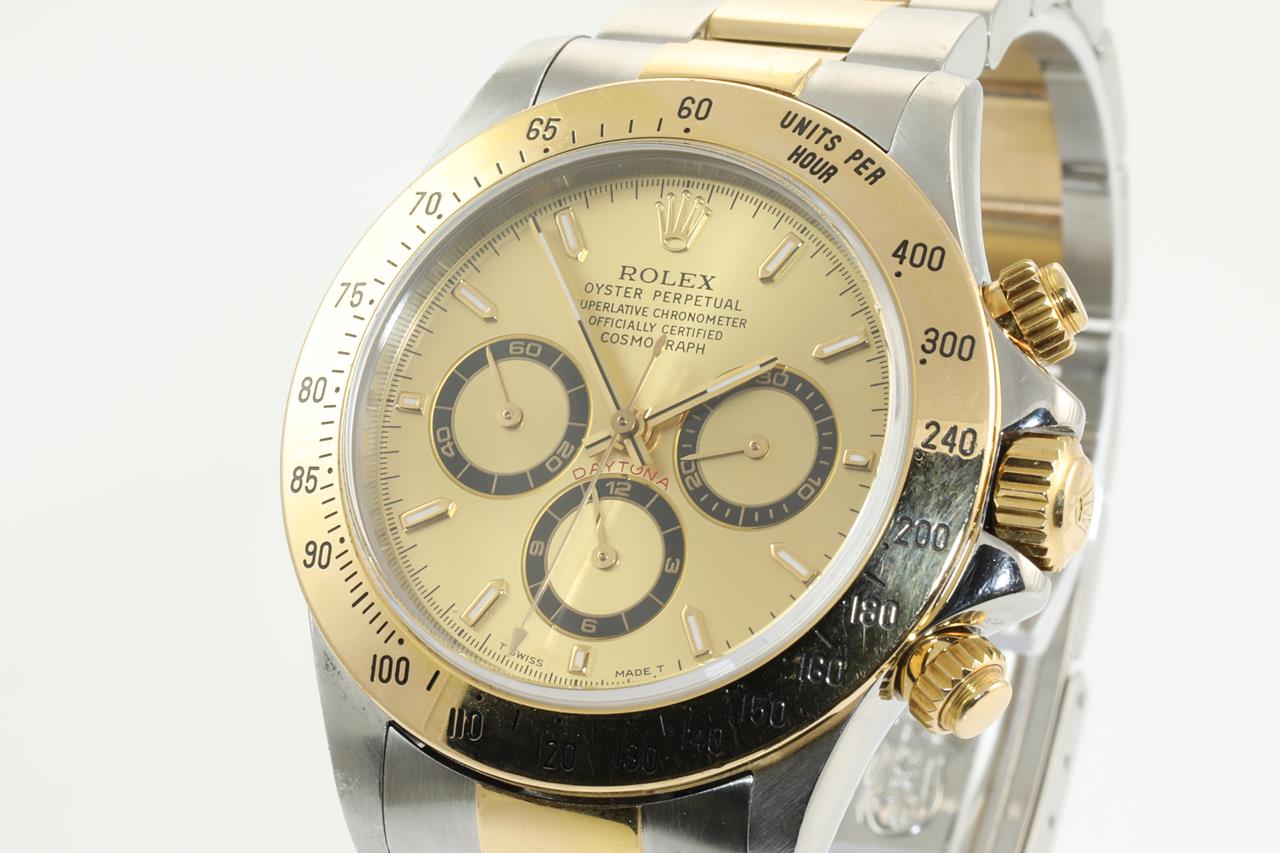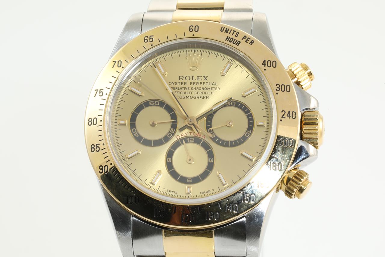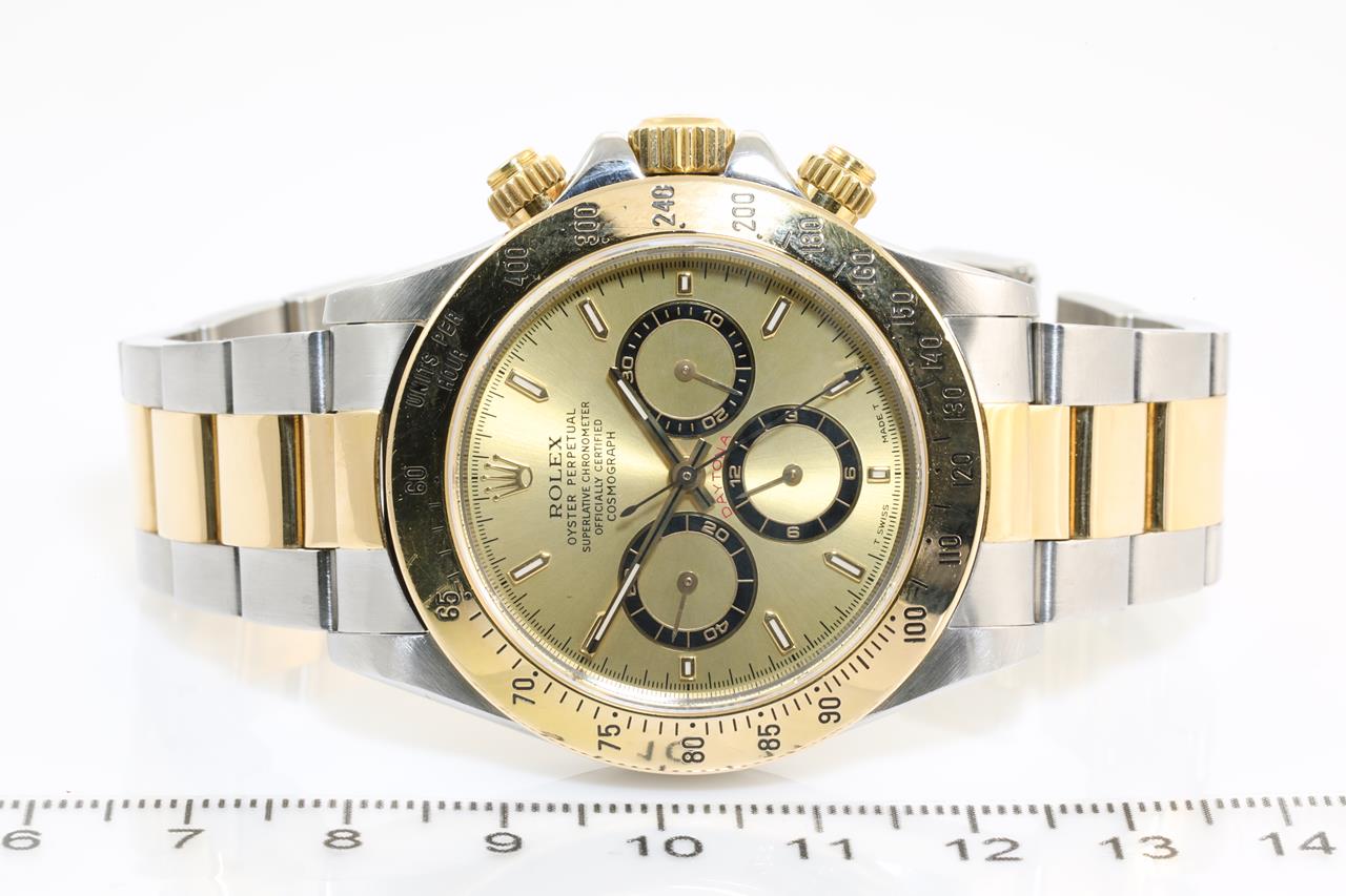 Rolex Oyster Perpetual Daytona 18ct yellow gold & stainless steel automatic mens watch. Gold dial, case diameter: 40mm, wrist size: 18cm, Swiss made. Ref# 16523, Circa: 1997. With Rolex two tone Oyster bracelet and clasp. With certificate of authenticity and Rolex box. 3 month FSA warranty. (Pre-owned)