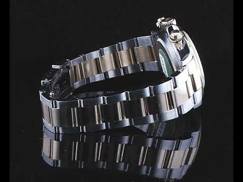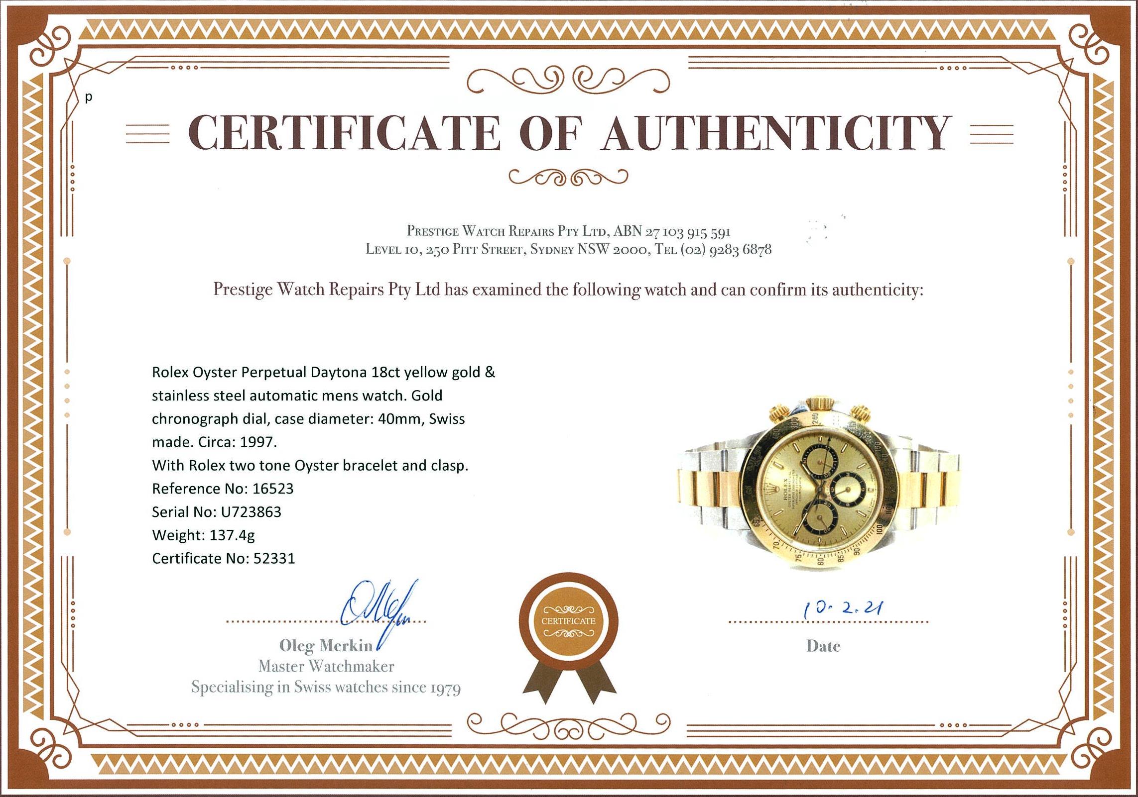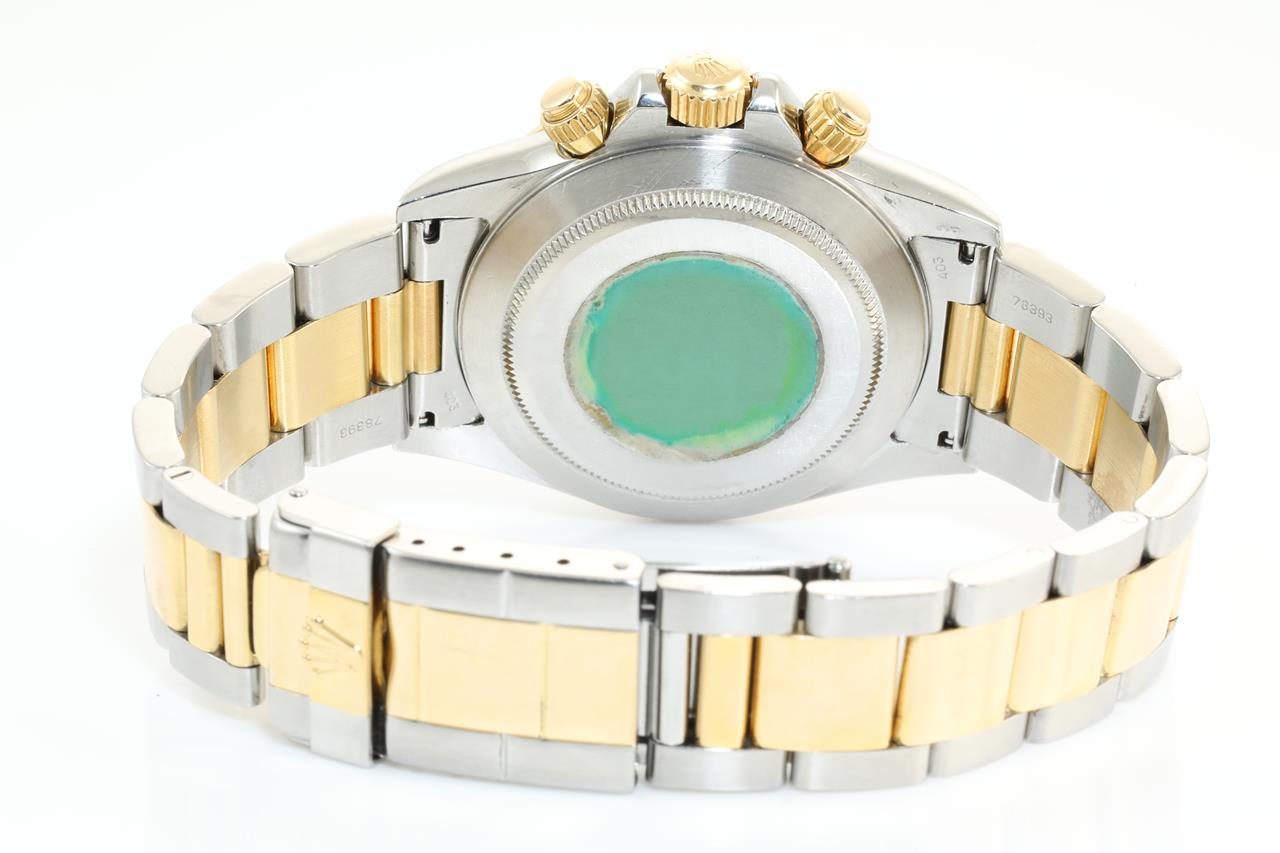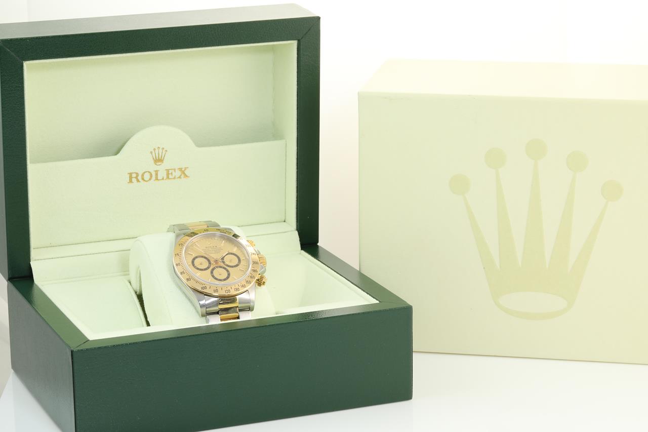 Rolex Oyster Perpetual Daytona 18ct yellow gold & stainless steel automatic mens watch. Gold dial, case diameter: 40mm, wrist size: 18cm, Swiss made. Ref# 16523, Circa: 1997. With Rolex two tone Oyster bracelet and clasp. With certificate of authenticity and Rolex box. 3 month FSA warranty. (Pre-owned)