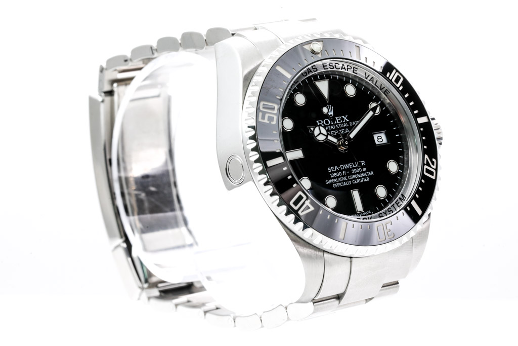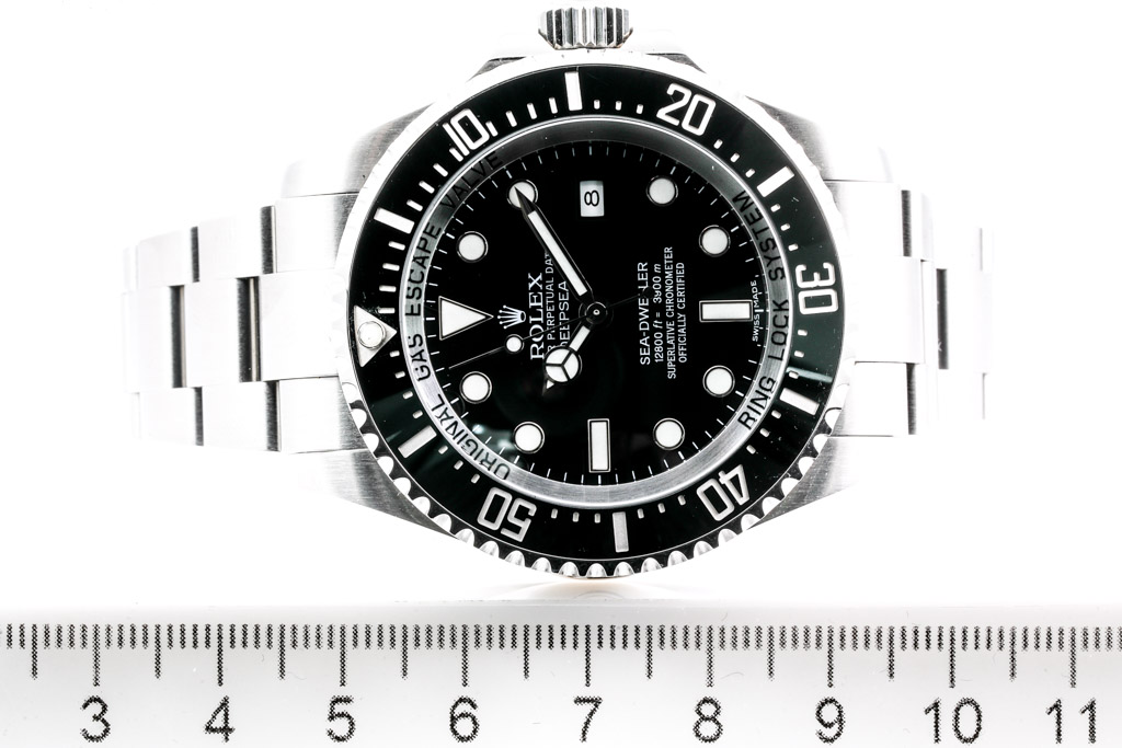 Rolex Oyster Perpetual Date Deepsea Sea-Dweller stainless steel automatic mens watch. Black dial, date, case diameter: 44mm, wrist size: 19cm, Swiss made. Ref# 116660, Circa: 2010. With Rolex stainless steel Oyster bracelet and clasp. With Certificate of Authenticity, Rolex International Guarantee Card dated 24/03/2013 and Rolex box. 3 month FSA Warranty. (Pre-owned)