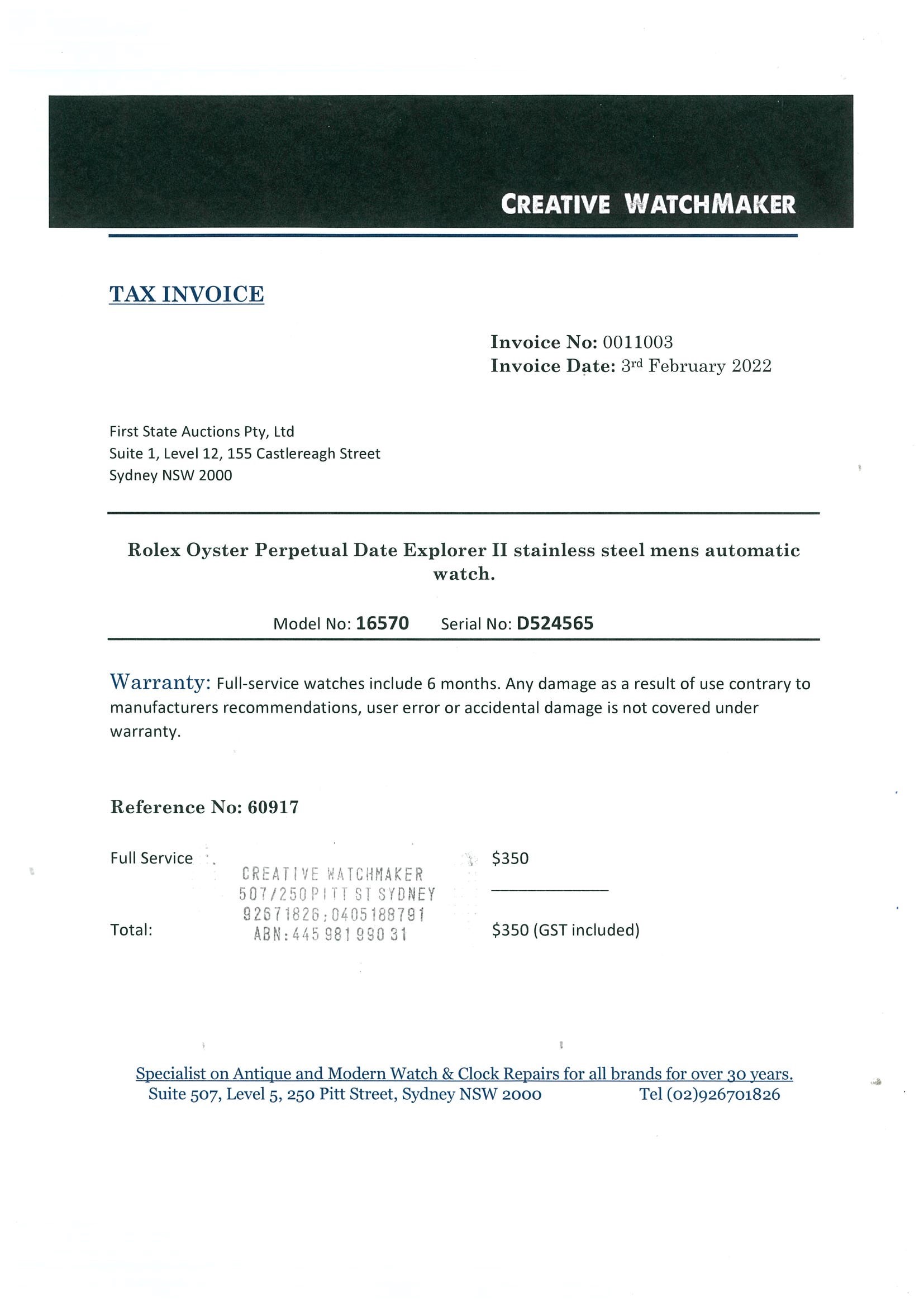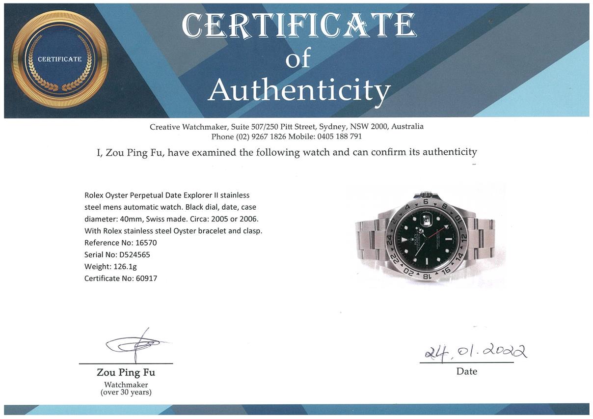 Rolex Oyster Perpetual Date Explorer II stainless steel mens automatic watch. Black dial, date, case diameter: 40mm, wrist size: 18cm, Swiss made. Ref# 16570, Circa: 2005 or 2006. With Rolex stainless steel Oyster bracelet and clasp. With Certificate of Authenticity, Rolex International Guarantee Card dated 29/02/2012 and Rolex box. 3 month FSA warranty. (Pre-owned)