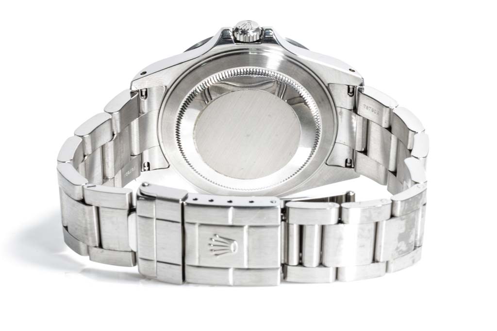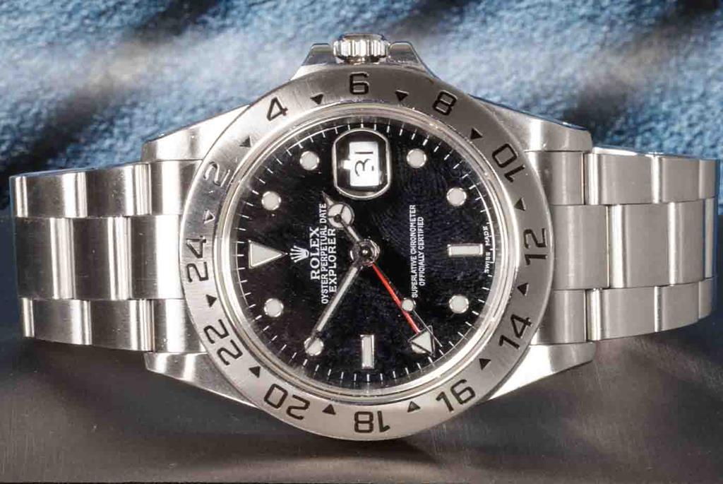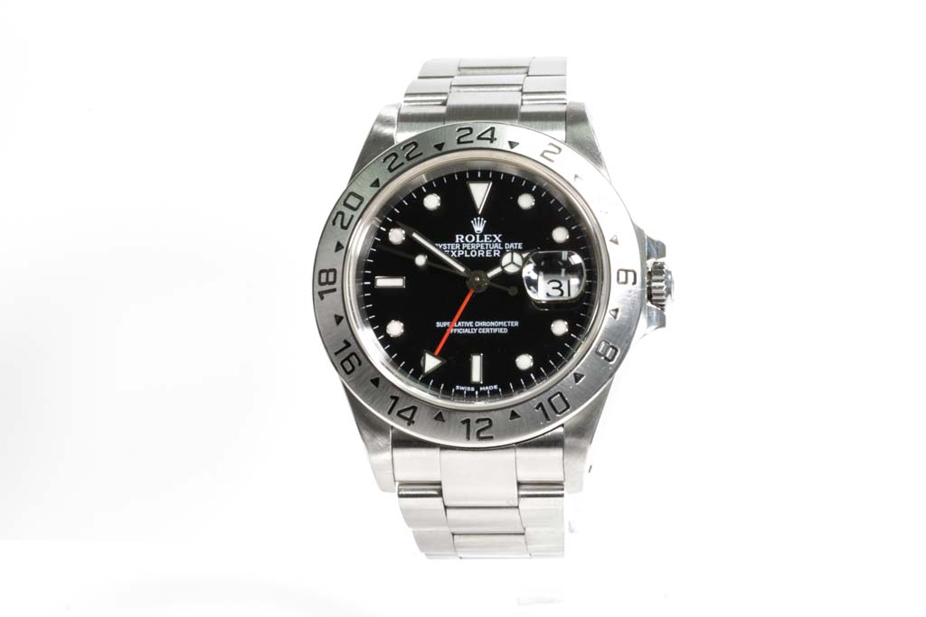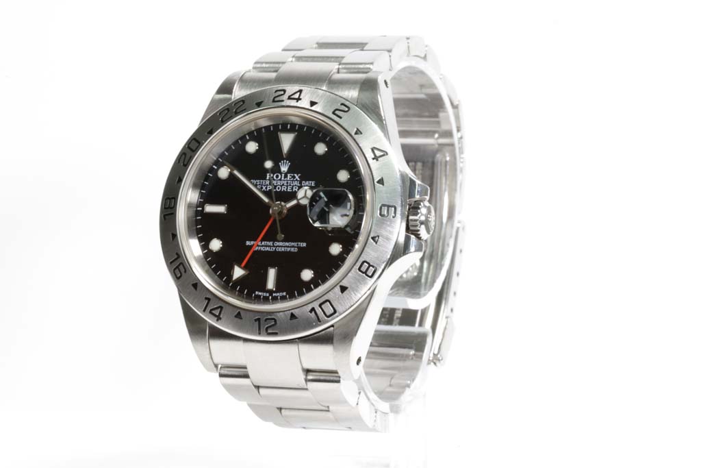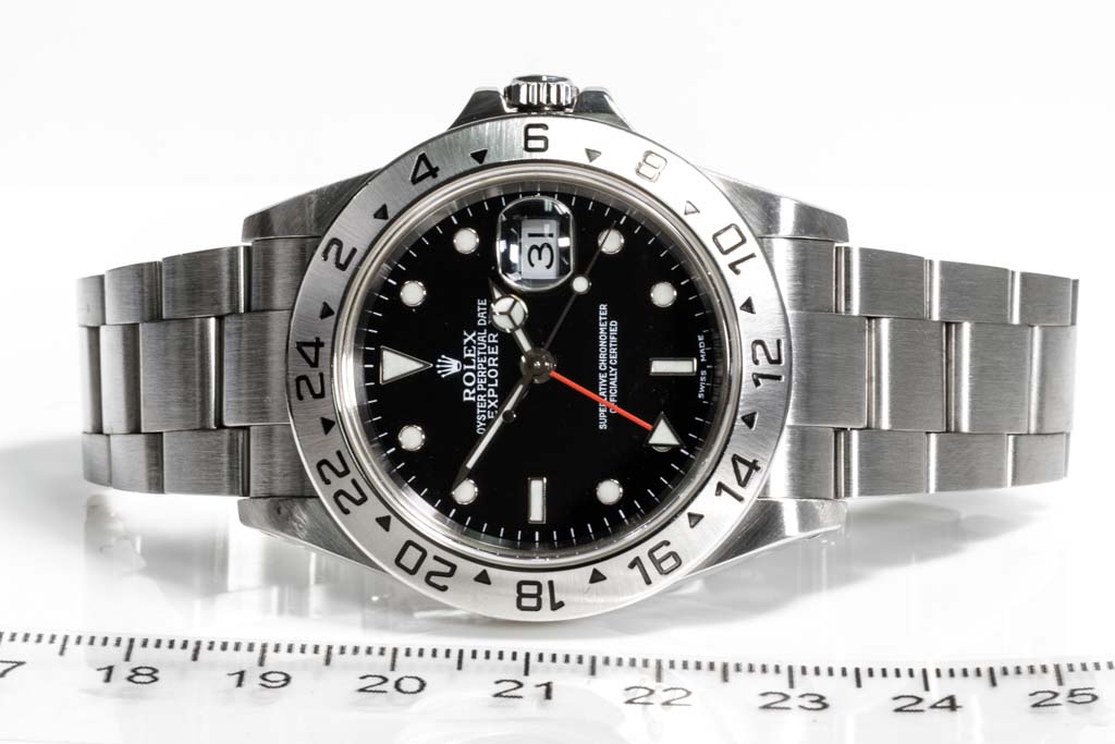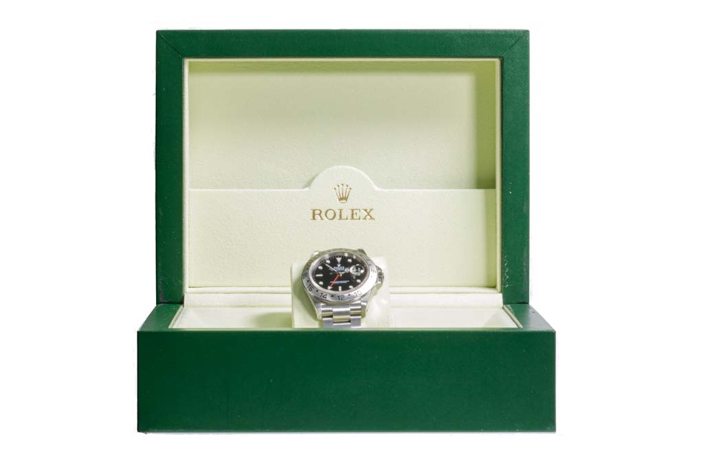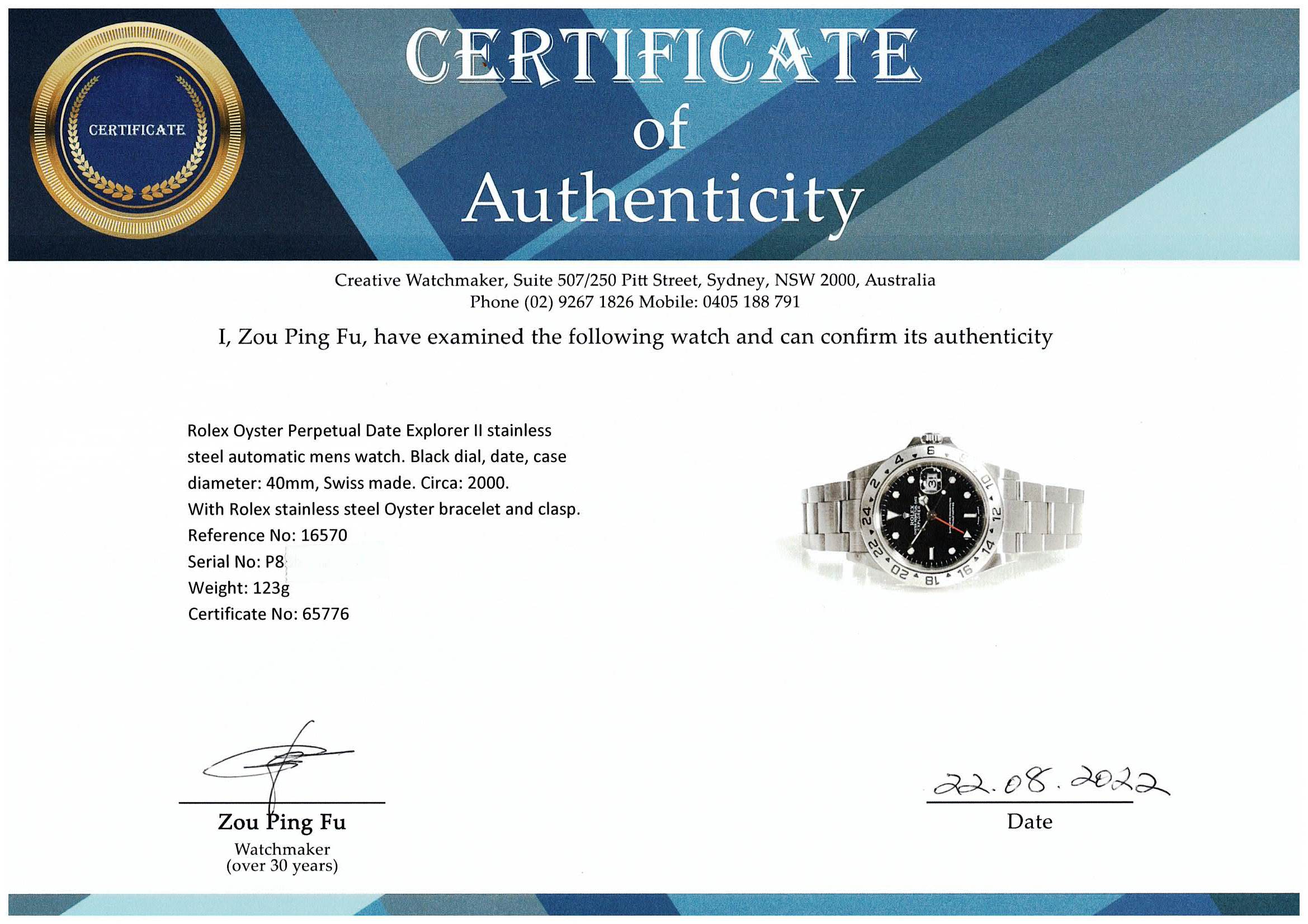 Rolex Oyster Perpetual Date Explorer II stainless steel automatic mens watch. Black dial, date, case diameter: 40mm, wrist size: 17.5cm, Swiss made. Ref# 16570, Circa: 2000. With Rolex stainless steel Oyster bracelet and clasp. With Certificate of Authenticity and Rolex box. 3 month FSA warranty. (Pre-owned)