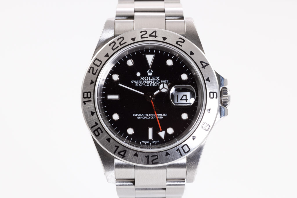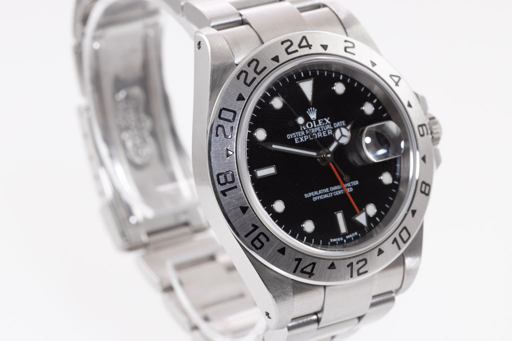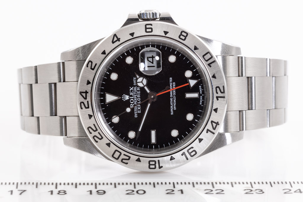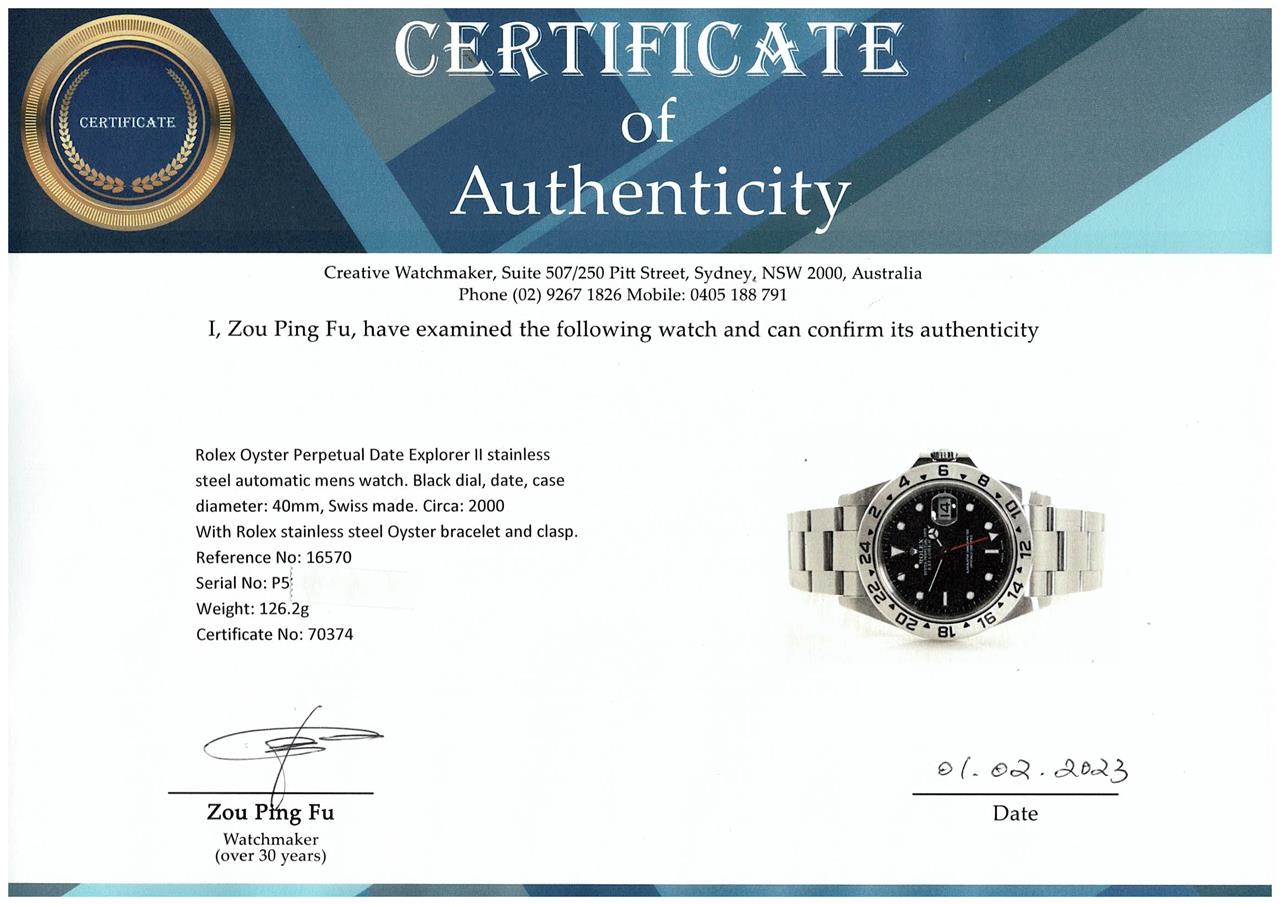 Rolex Oyster Perpetual Date Explorer II stainless steel automatic mens watch. Black dial, date, case diameter: 40mm, wrist size: 19cm, Swiss made. Ref# 16570, Circa: 2000. With Rolex stainless steel Oyster bracelet and clasp. With Certificate of Authenticity, Rolex Guarantee Certificate dated 10/03/2001 and Rolex box. 3 month FSA warranty. (Pre-owned)