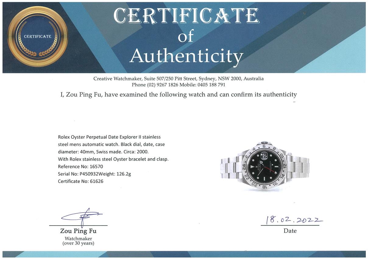 Rolex Oyster Perpetual Date Explorer II stainless steel mens automatic watch. Black dial, date, case diameter: 40mm, wrist size: 18cm, Swiss made. Ref# 16570, Circa: 2000. With Rolex stainless steel Oyster bracelet and clasp. With Certificate of Authenticity, Rolex Guarantee Certificate dated 5/11/2000 and Rolex box. 3 month FSA warranty. (Pre-owned)