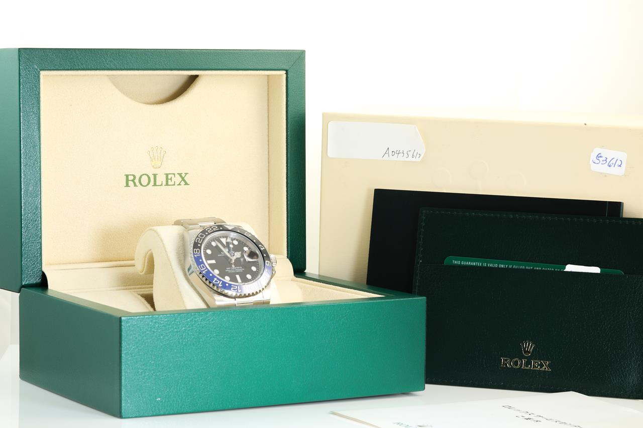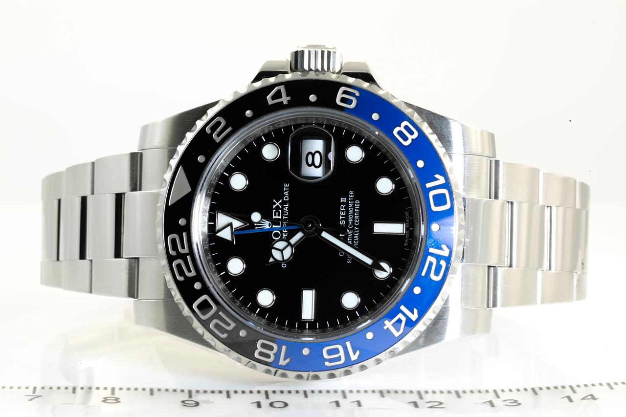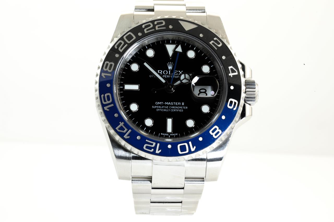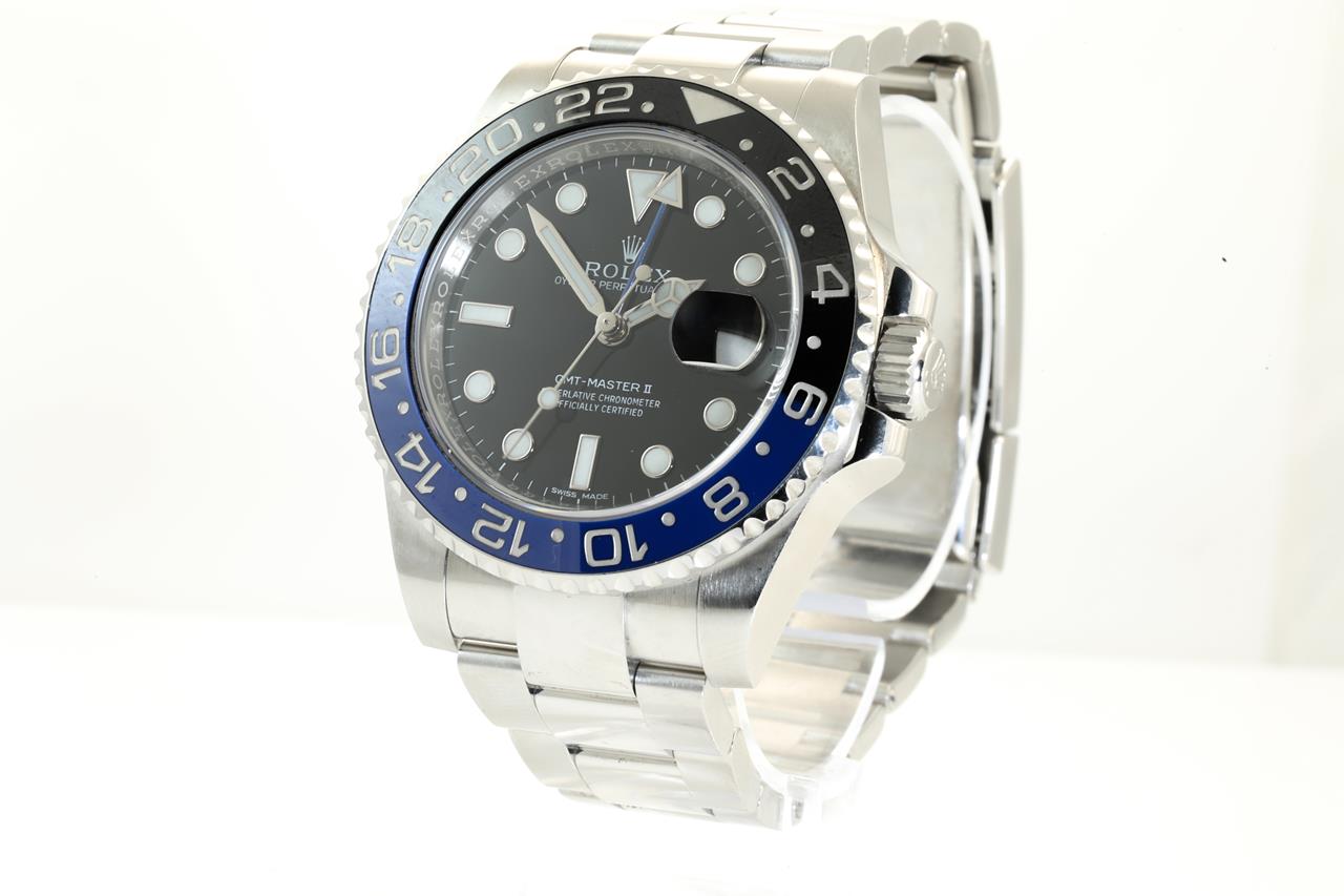 Rolex GMT Master II Batman stainless steel automatic mens watch. Black dial, date, case diameter: 40mm, wrist size: 19cm, Swiss made. Ref# 116710BLNR, Circa: 2011-2021. With Rolex Oyster stainless steel bracelet and clasp. With certificate of Authenticity. With Rolex Guarantee Certificate card dated 3 Sept 2014 inside Rolex box. 3 month FSA warranty. (Pre-owned)