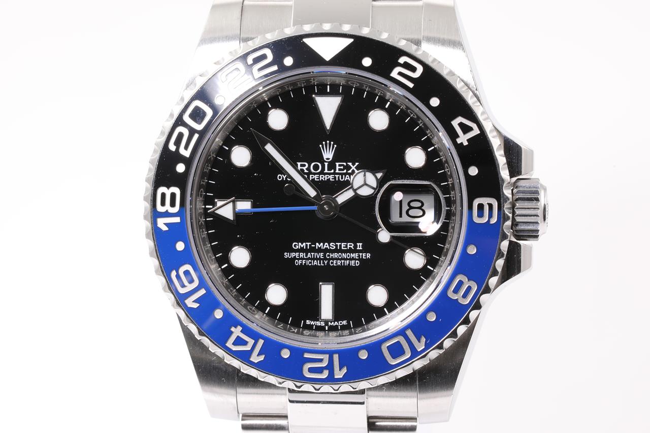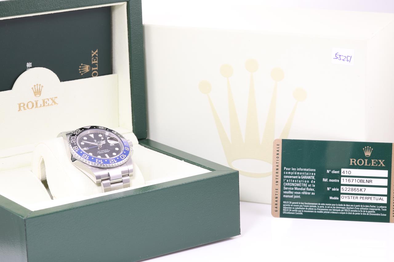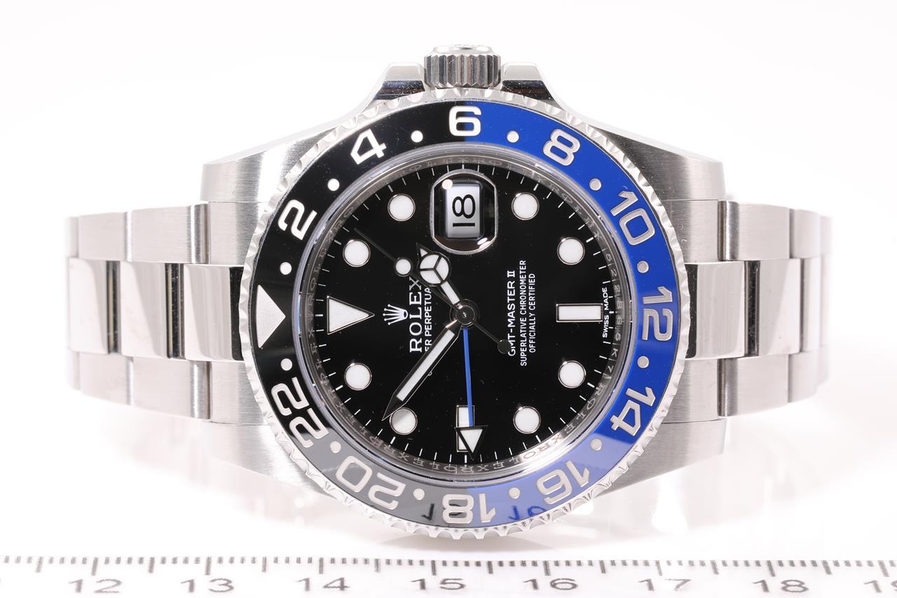 Rolex GMT Master II Batman stainless steel automatic mens watch. Black dial, date, case diameter: 40mm, wrist size: 19cm, Swiss made. Ref# 116710BLNR, Circa: 2011-2021. With Rolex Oyster stainless steel bracelet and clasp. With certificate of authenticity, Rolex international guarantee card dated 01/11/2013 and Rolex box. 3 month FSA warranty. (Pre-owned)