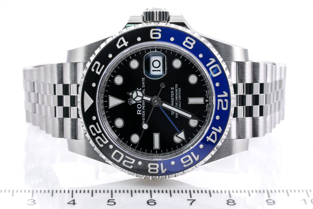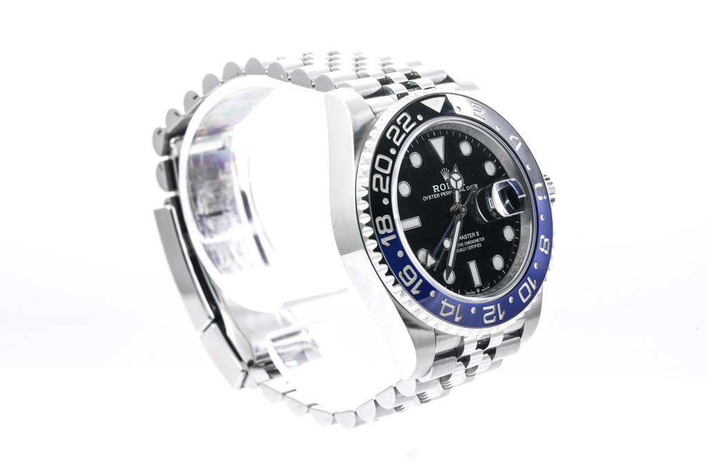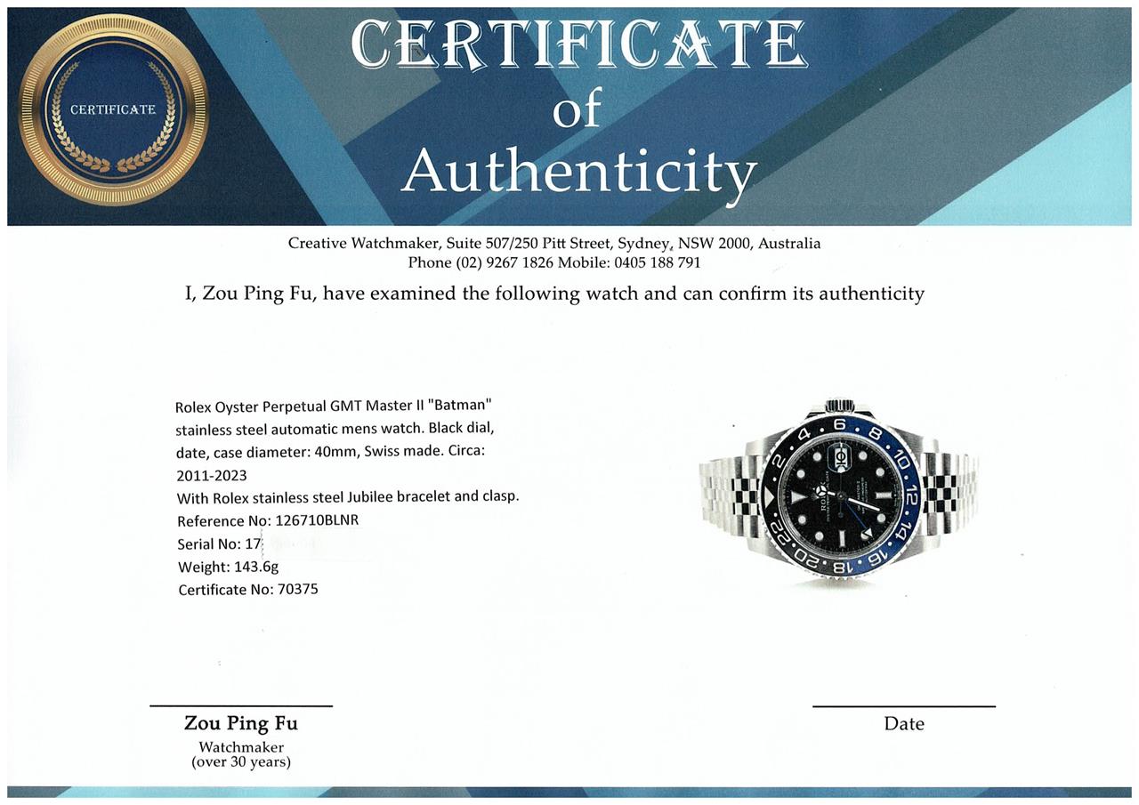 Rolex Oyster Perpetual GMT Master II Batman stainless steel automatic mens watch. Black dial, date, case diameter: 40mm, wrist size: 18.5cm, Swiss made. Ref# 126710BLNR. Circa: 2011-2023. With Rolex stainless steel Jubilee bracelet and clasp. With Certificate of Authenticity, Rolex International Guarantee card dated 14/10/2021 and Rolex box. Balance of 5 year Rolex manufacturer warranty applies. (Pre-owned)
