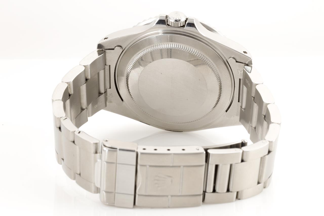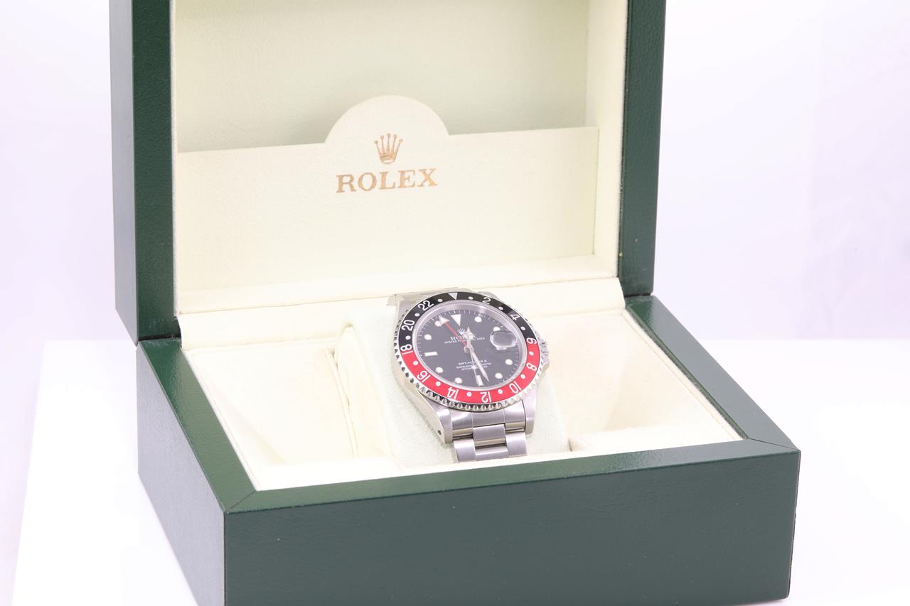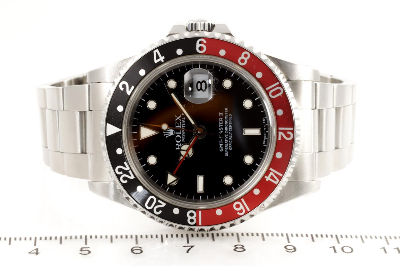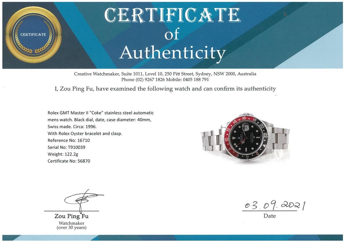 Rolex GMT Master II Coke stainless steel automatic mens watch. Black dial, date, case diameter: 40mm, wrist size: 17.5cm, Swiss made. Ref# 16710, Circa: 1996. With Rolex Oyster bracelet and clasp. With certificate of authenticity and Rolex box. 3 month FSA warranty. (Pre-owned)