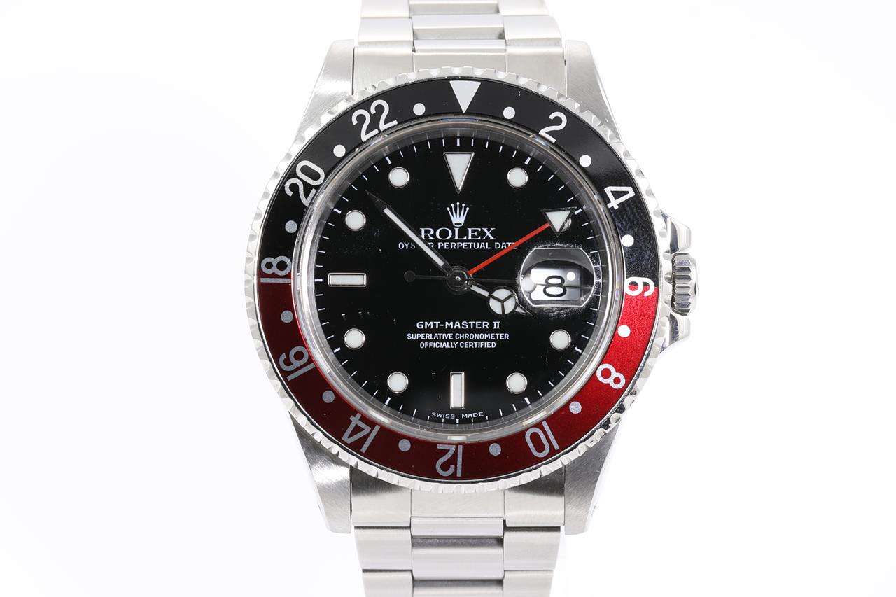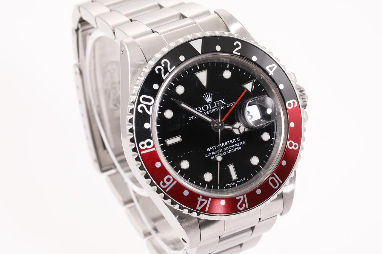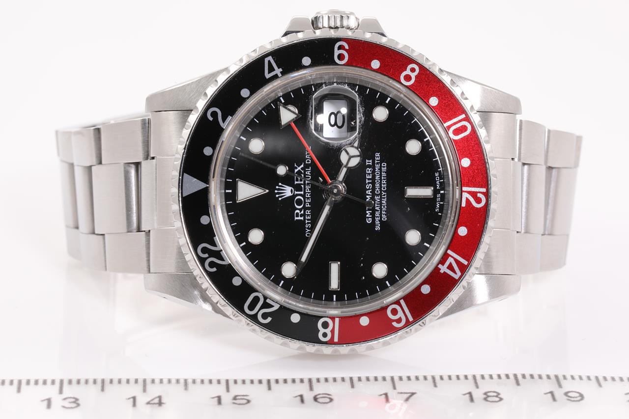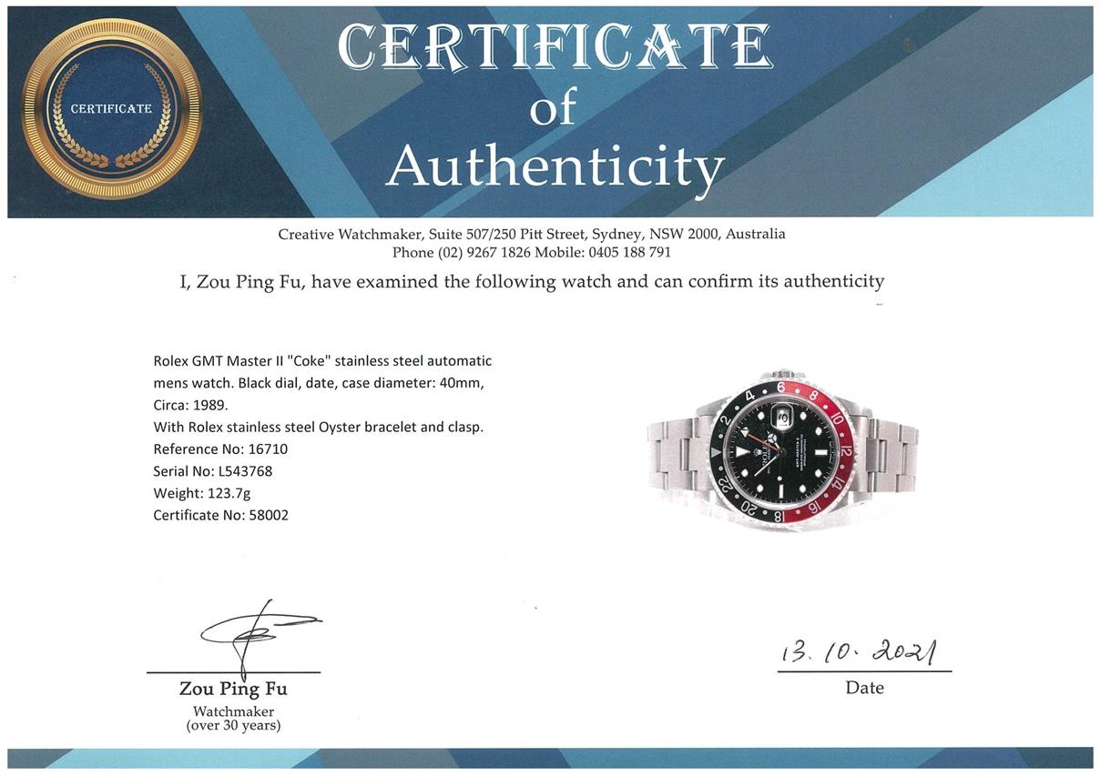 Rolex GMT Master II Coke stainless steel automatic mens watch. Black dial, date, case diameter: 40mm, wrist size: 19cm, Swiss made. Ref# 16710, Circa: 1989. With Rolex Oyster bracelet and clasp. With certificate of authenticity and Rolex box. 6 month Creative watchmaker warranty from the date of full service. (Pre-owned)