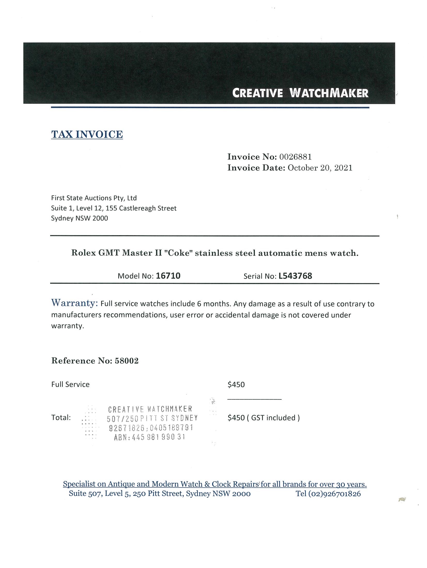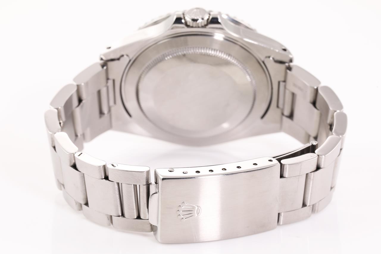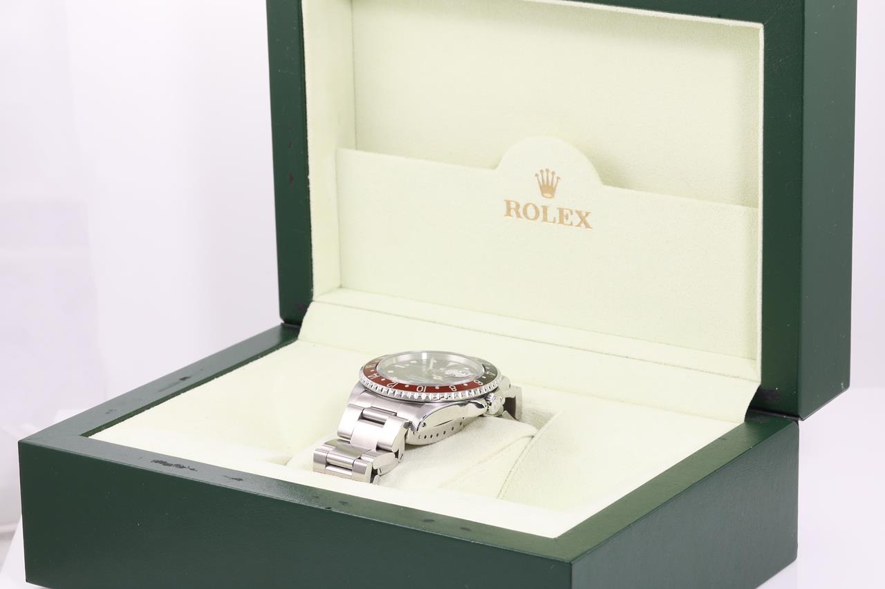 Rolex GMT Master II Coke stainless steel automatic mens watch. Black dial, date, case diameter: 40mm, wrist size: 19cm, Swiss made. Ref# 16710, Circa: 1989. With Rolex Oyster bracelet and clasp. With certificate of authenticity and Rolex box. 6 month Creative watchmaker warranty from the date of full service. (Pre-owned)