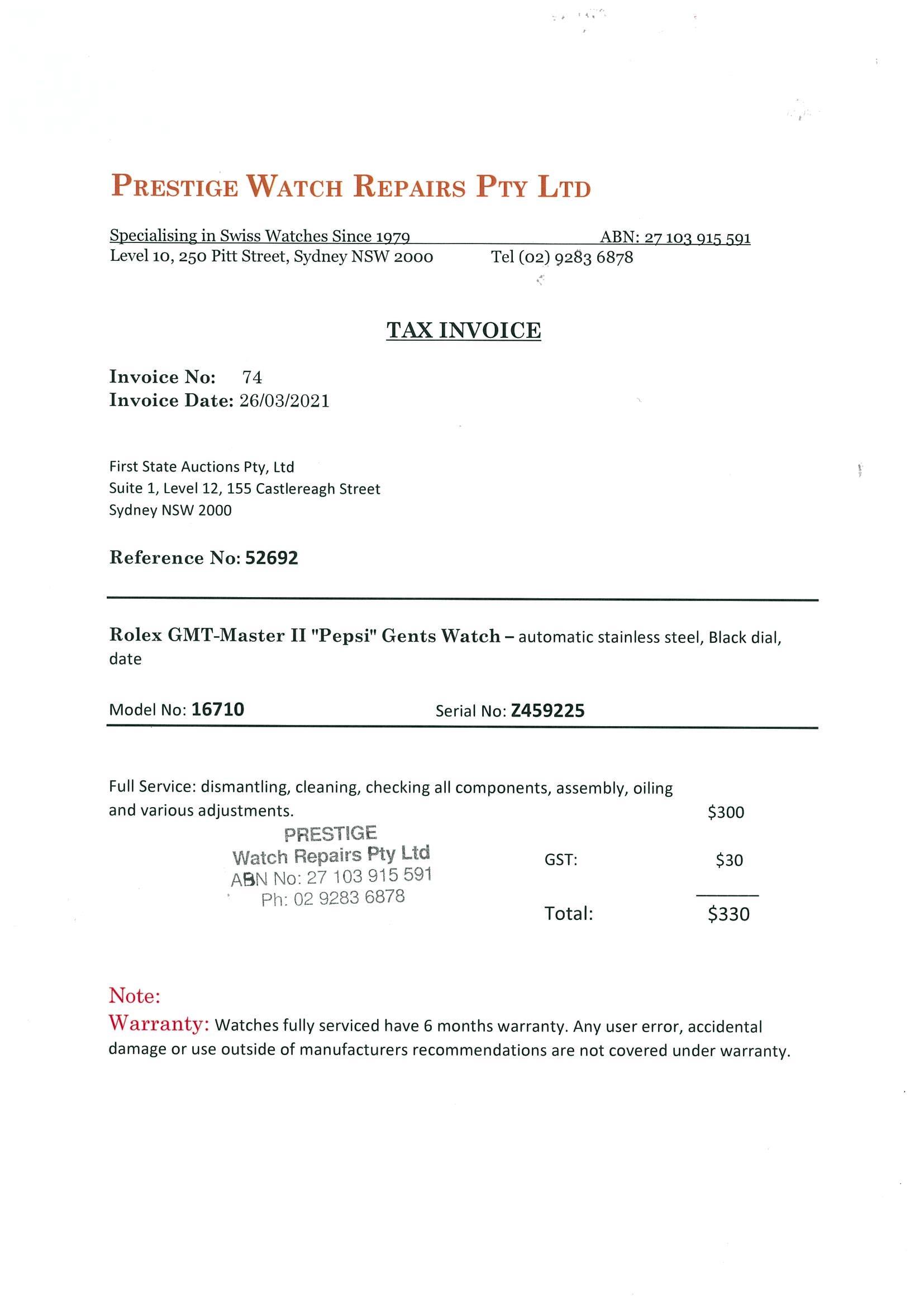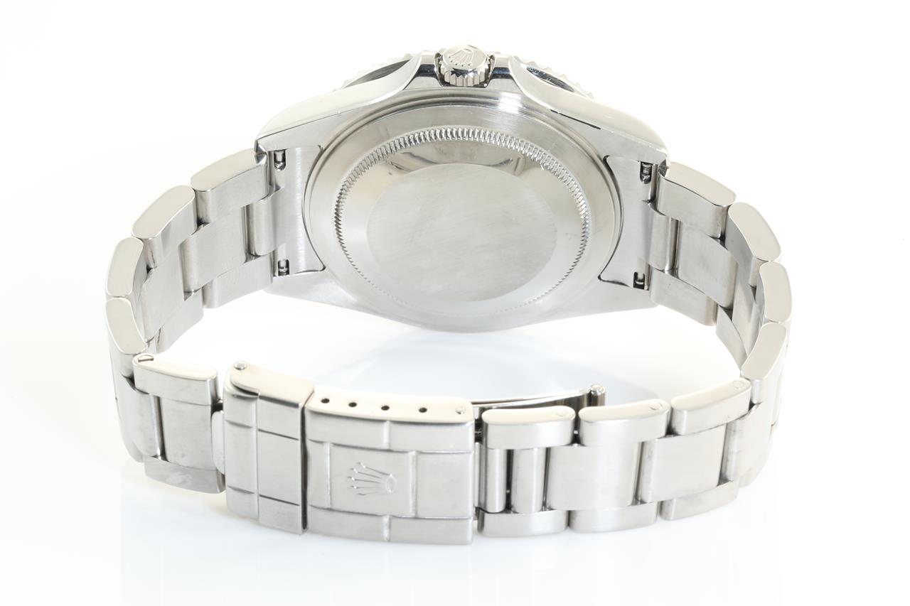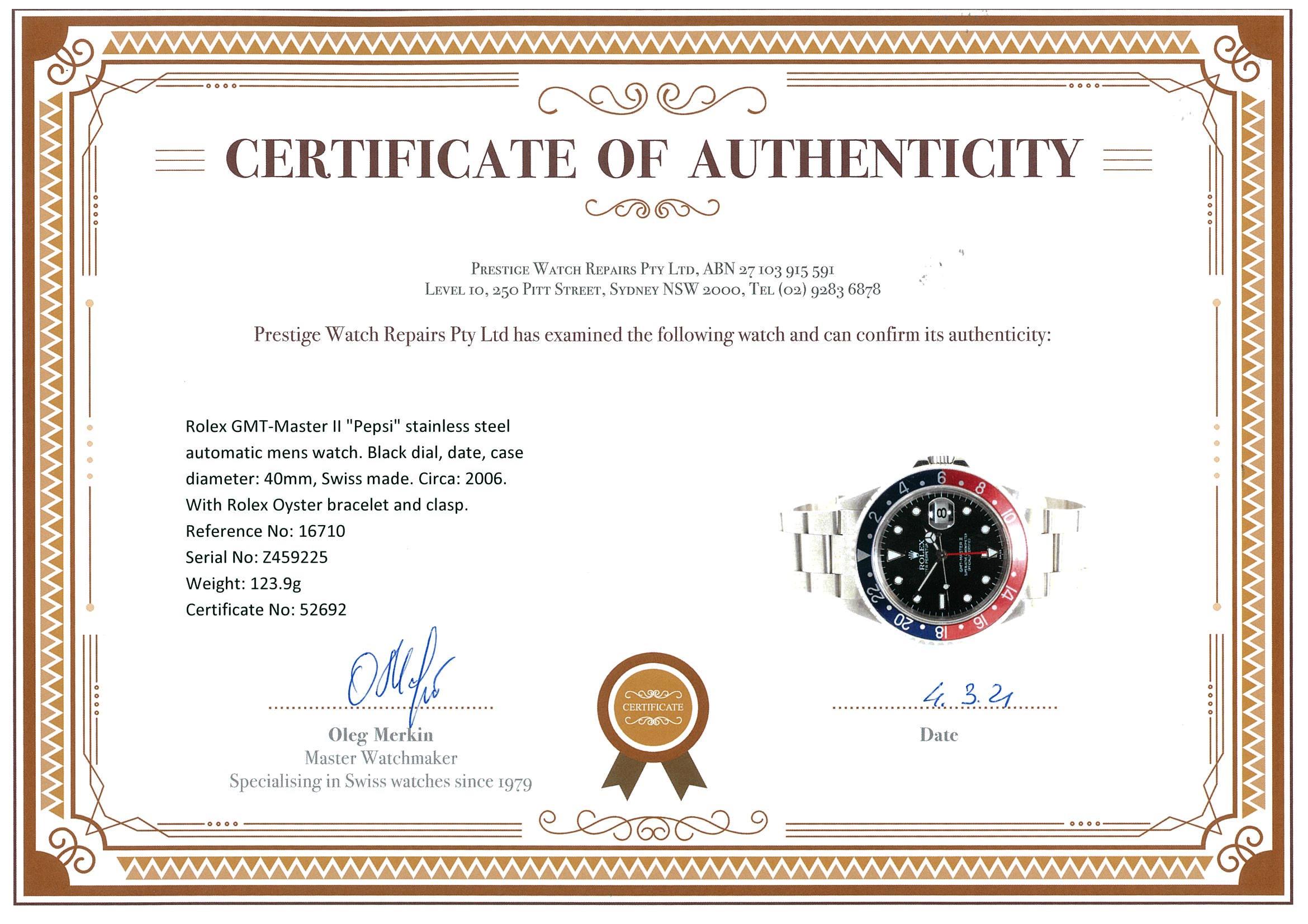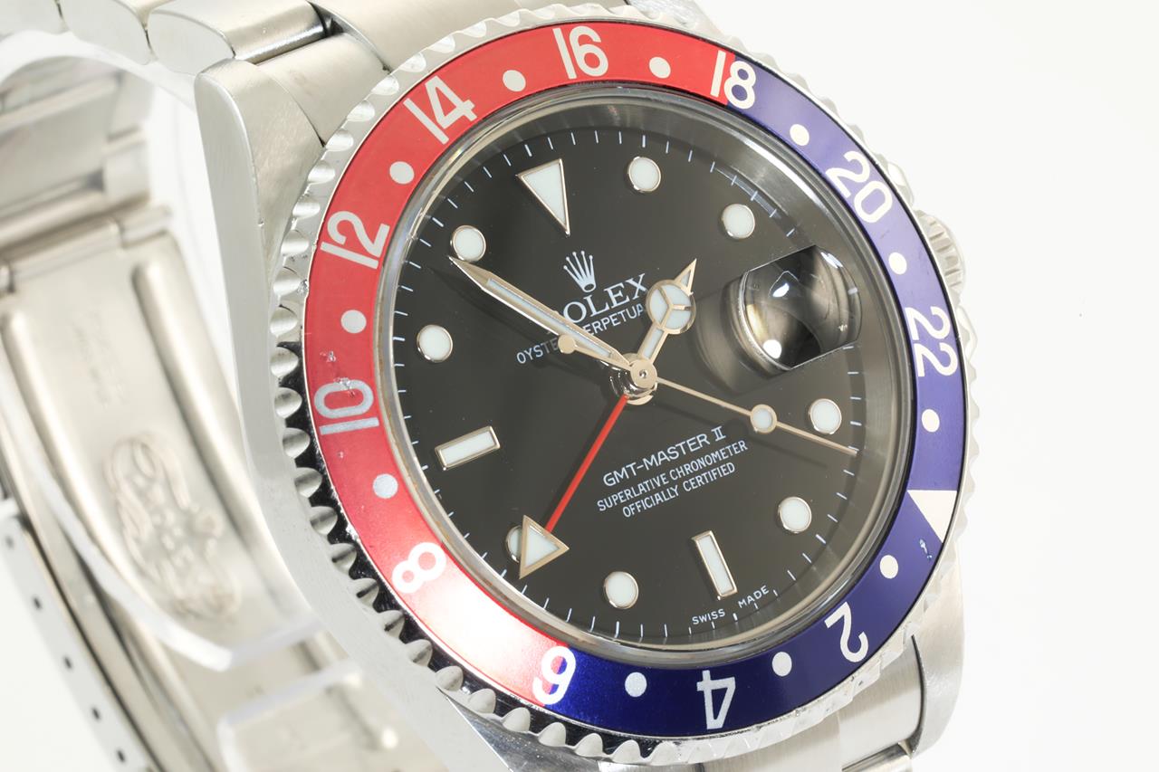 Rolex GMT-Master II Pepsi stainless steel automatic mens watch. Black dial, date, case diameter: 40mm, wrist size: 17cm, Swiss made. Ref# 16710, Circa: 2006. With Rolex Oyster bracelet and clasp. With certificate of authenticity, 6 months Prestige watchmaker warranty from the date of full service and Rolex box. 3 month FSA warranty. (Pre-owned)