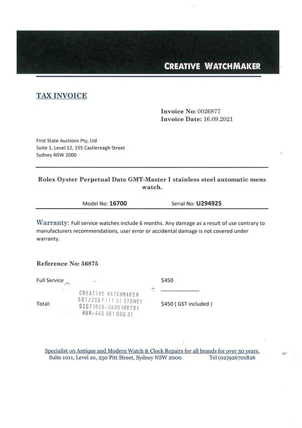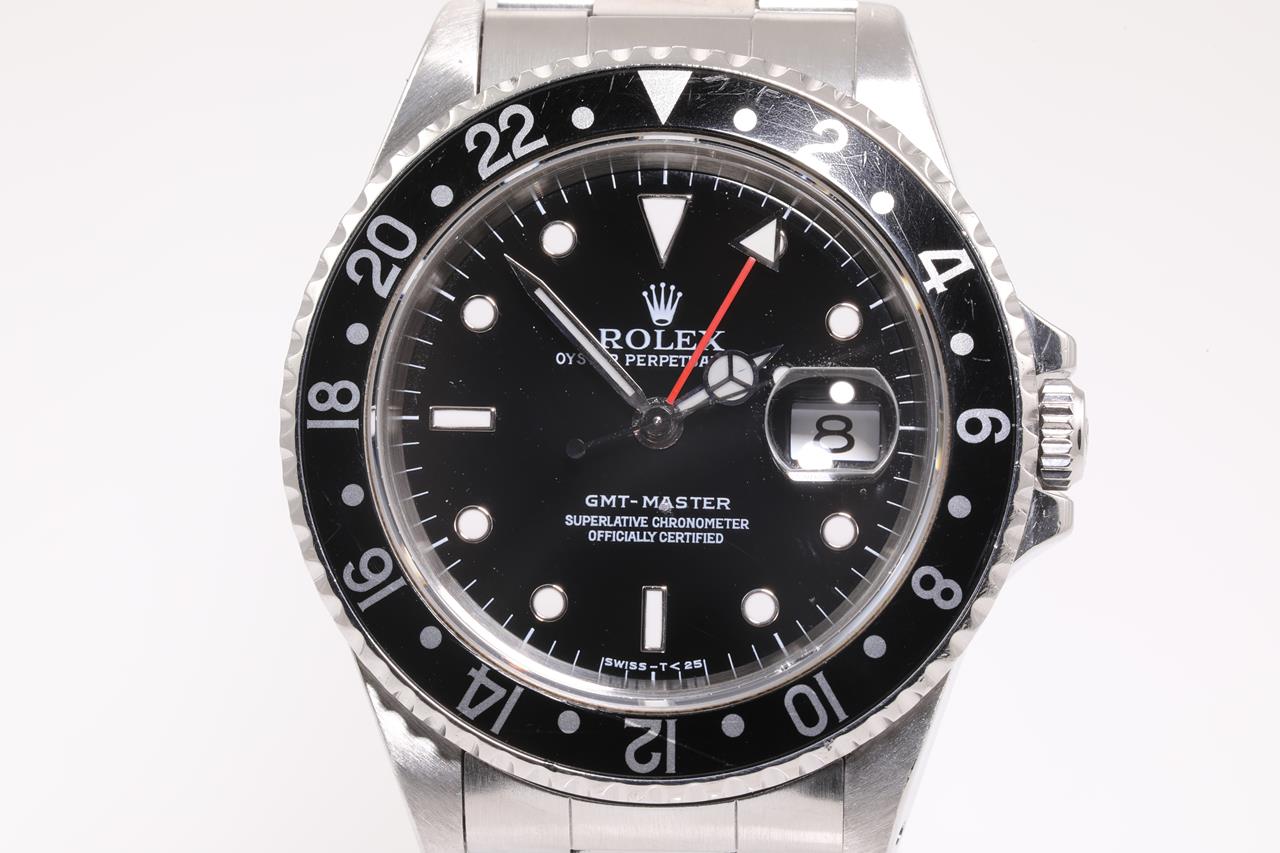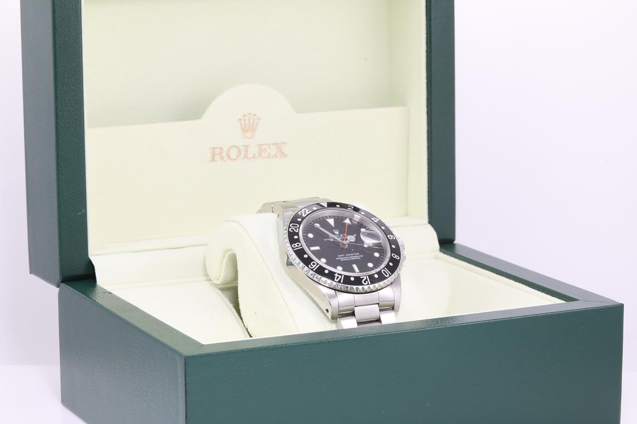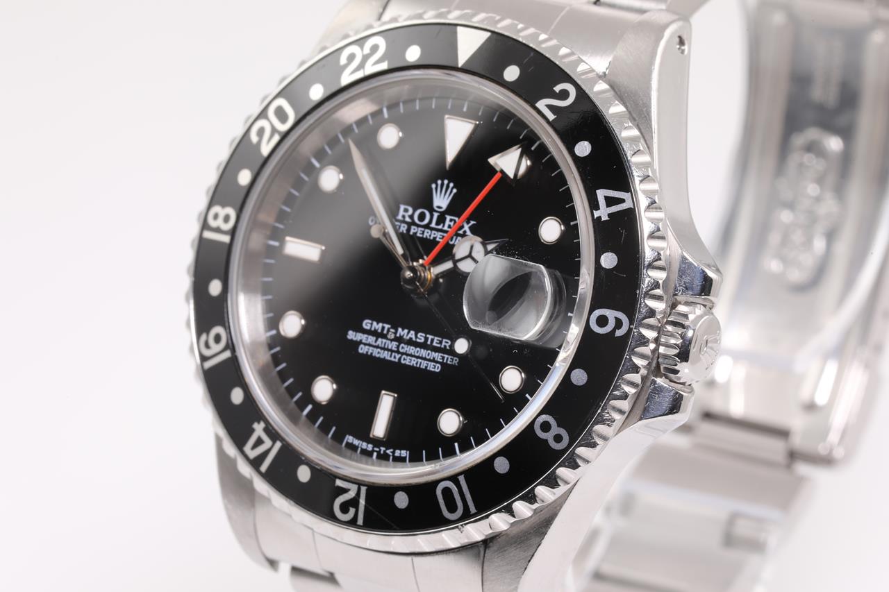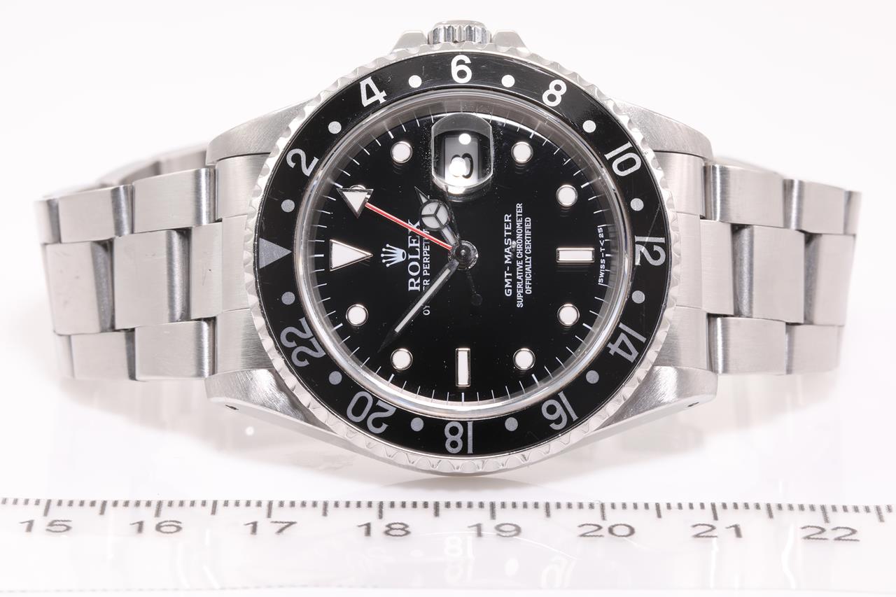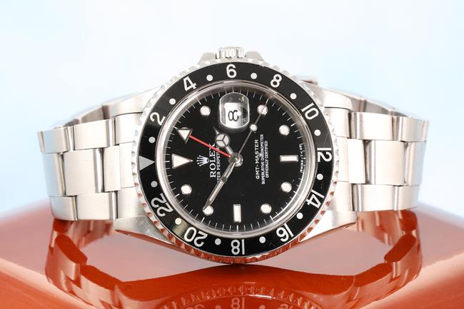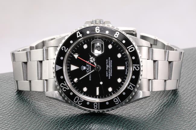Rolex Oyster Perpetual Date GMT-Master stainless steel automatic mens watch. Black dial, date, case diameter: 40mm, wrist size: 17.5cm, Swiss made. Ref# 16700, Circa: 1997. With Rolex Oyster bracelet and clasp. With certificate of authenticity and Rolex box. 6 month Creative watchmaker warranty from the date of full service. (Pre-owned)
