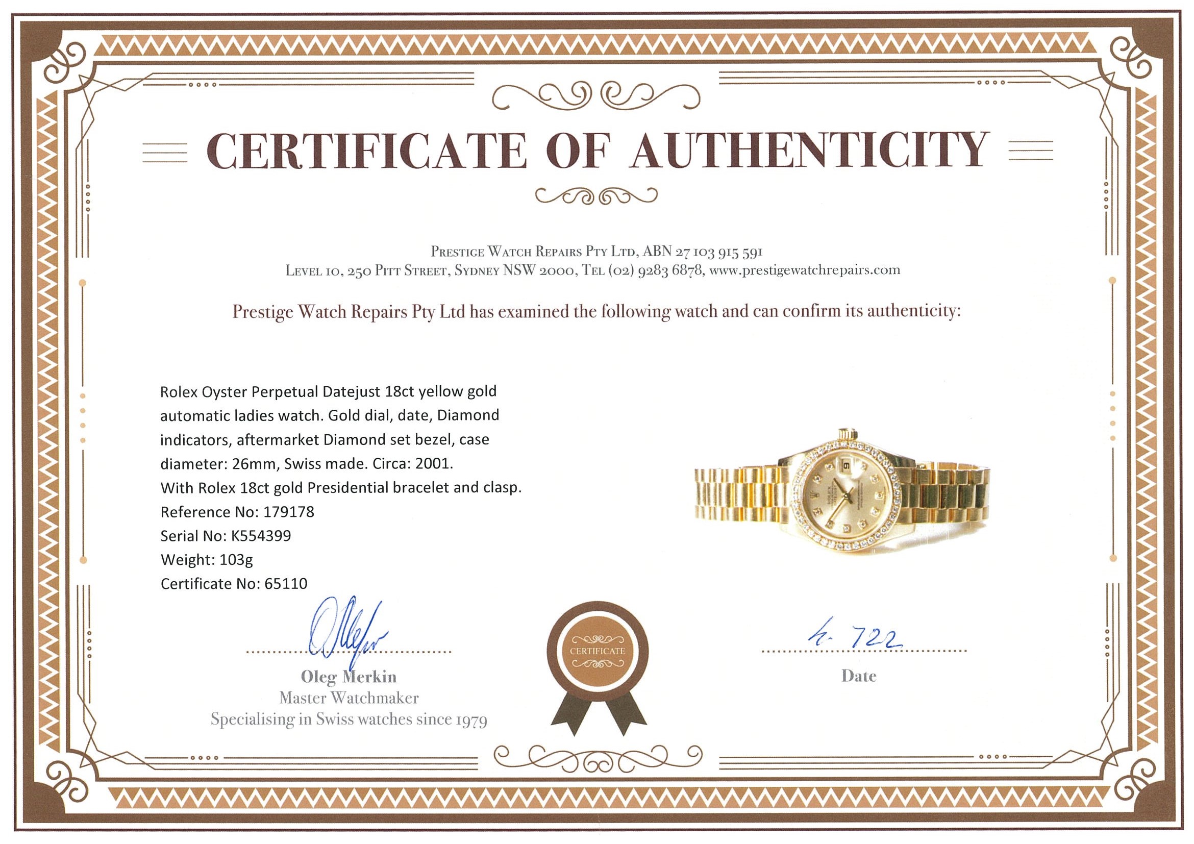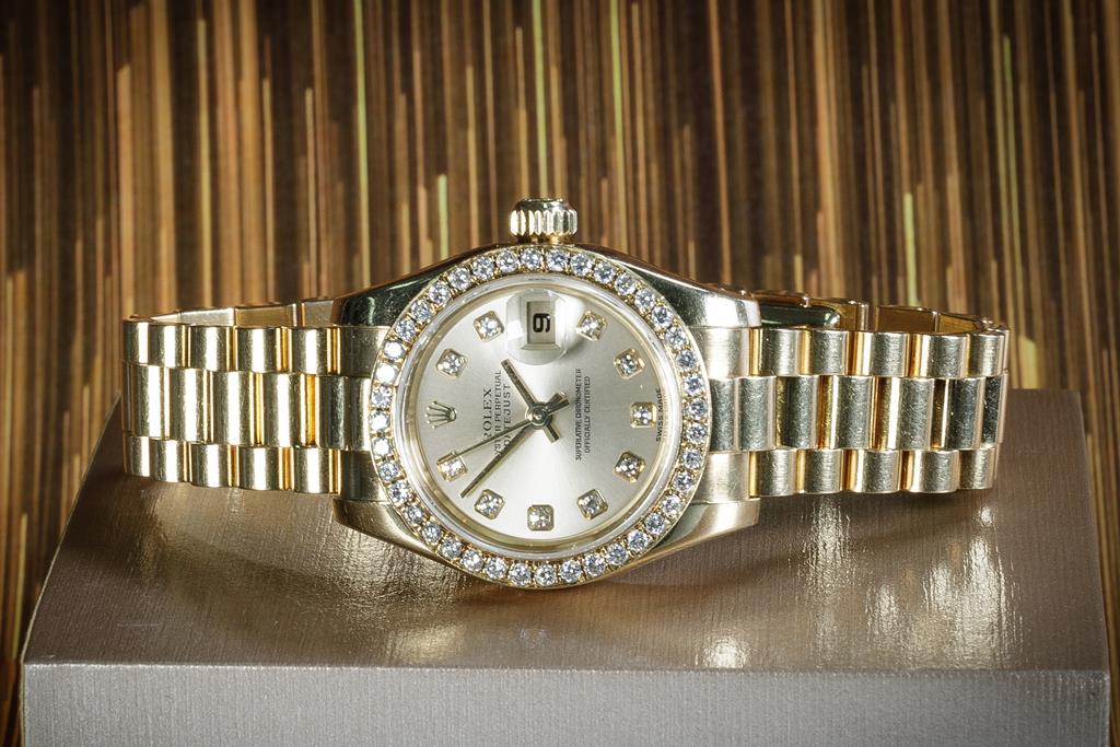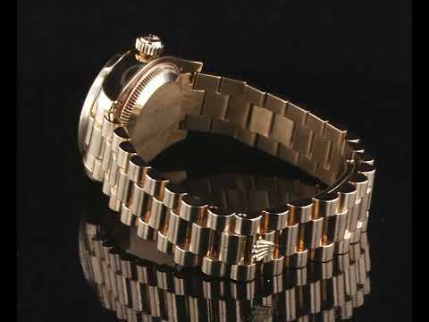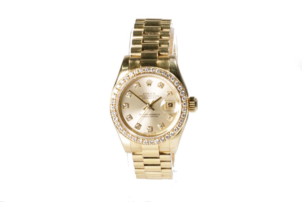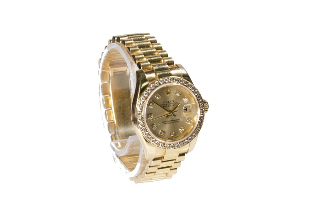 Rolex Oyster Perpetual Datejust 18ct yellow gold automatic ladies watch. Gold dial, date, Diamond indicators, aftermarket Diamond set bezel, case diameter: 26mm, wrist size: 15cm, Swiss made. Ref #179138, Circa: 2001. With Rolex 18ct gold Presidential bracelet and clasp. With Certificate of Authenticity. 3 month FSA warranty. (Pre-owned)