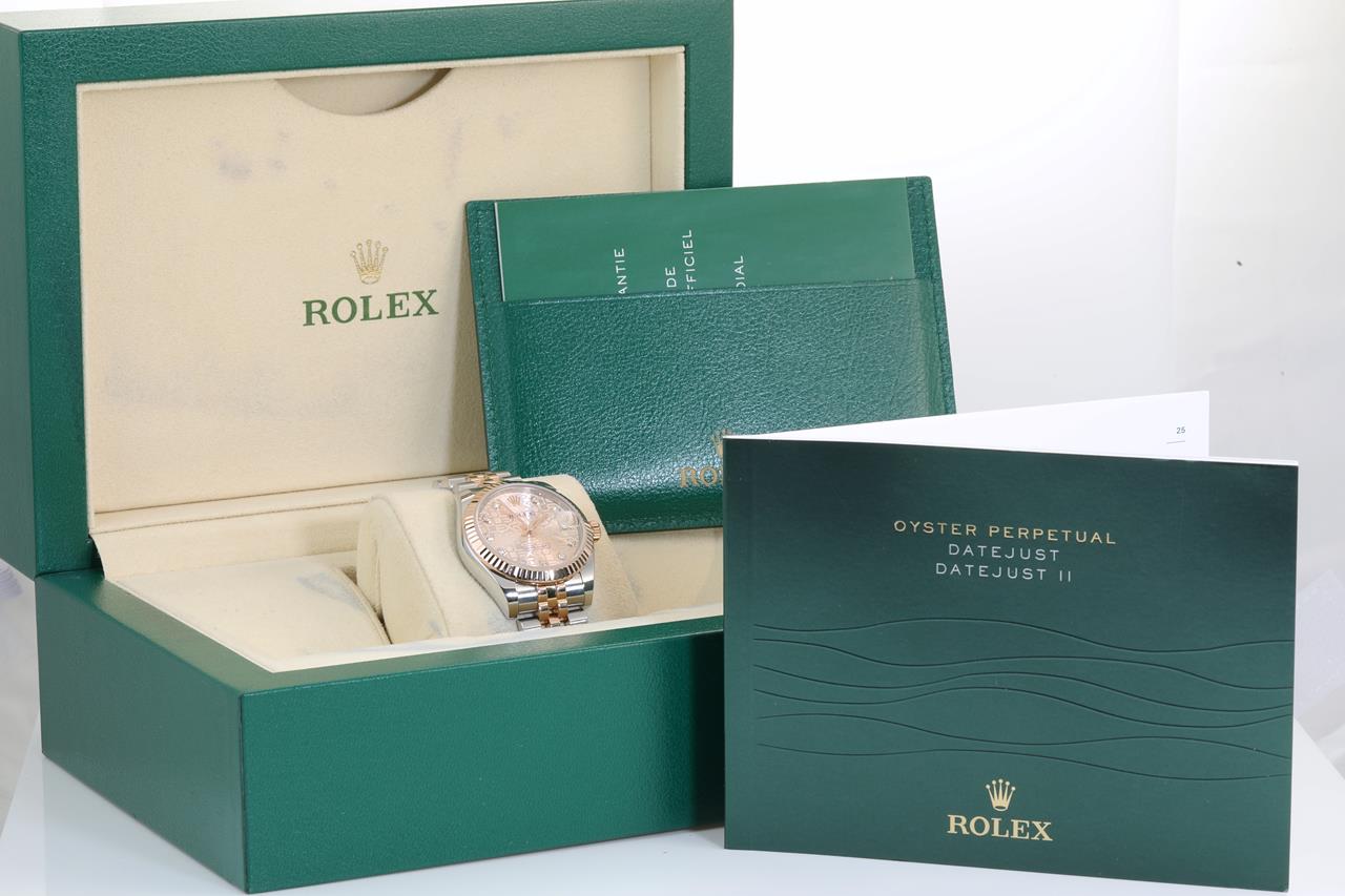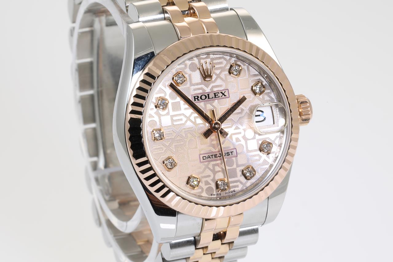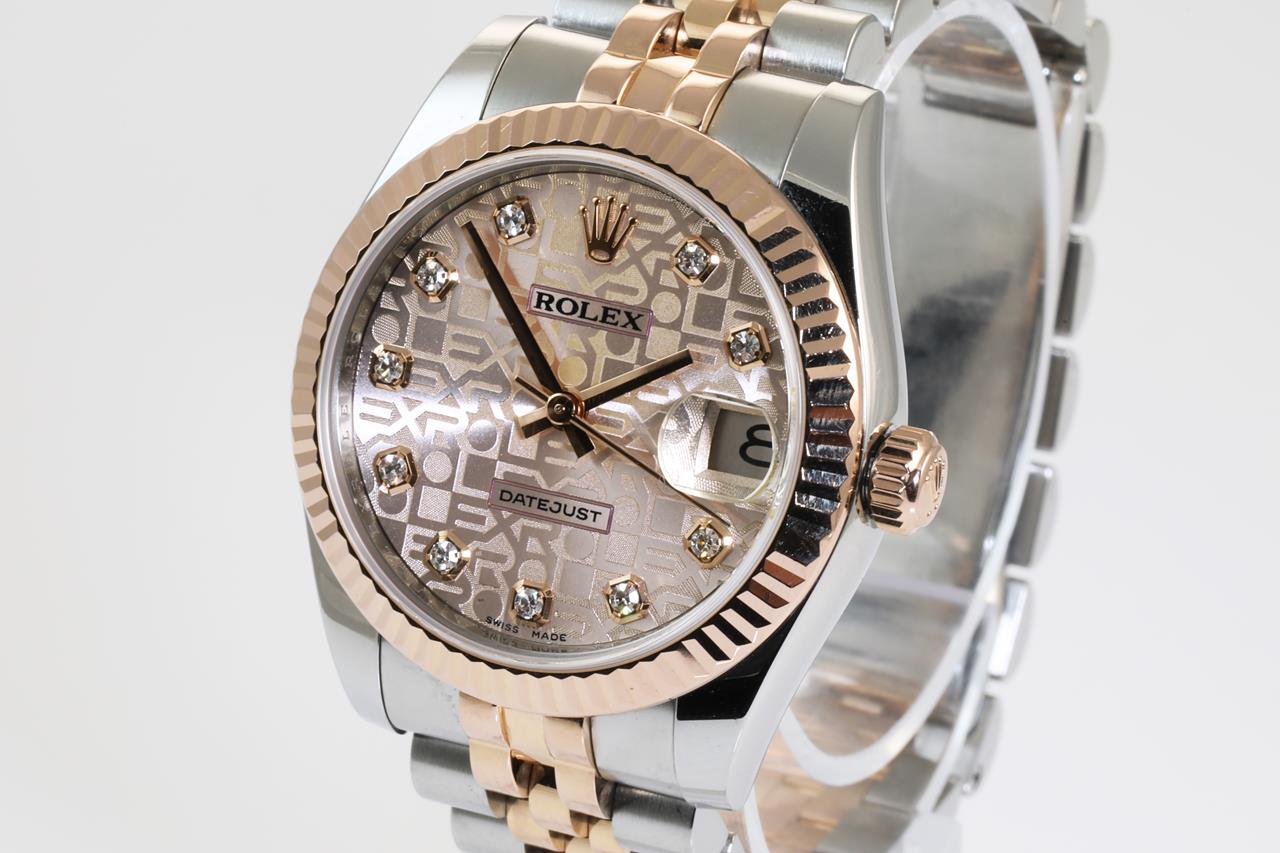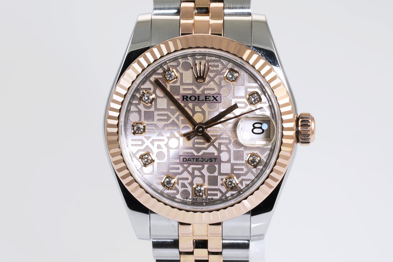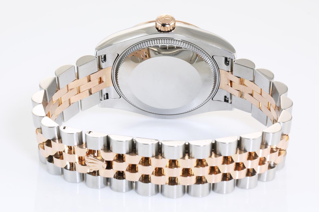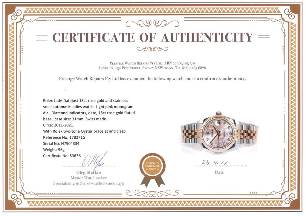 Rolex Lady-Datejust 18ct rose gold and stainless steel automatic ladies watch. Light pink monogram dial, Diamond indicators, date, 18ct rose gold fluted bezel, case size: 31mm, wrist size: 15cm, Swiss made. , Ref# 178271G, Circa: 2011-2021. With Rolex two-tone Oyster bracelet and clasp. With Certificate of Authenticity. With Rolex International Guarantee card dated 26/11/2014 inside Rolex box. 3 month FSA warranty. (Pre-owned)
