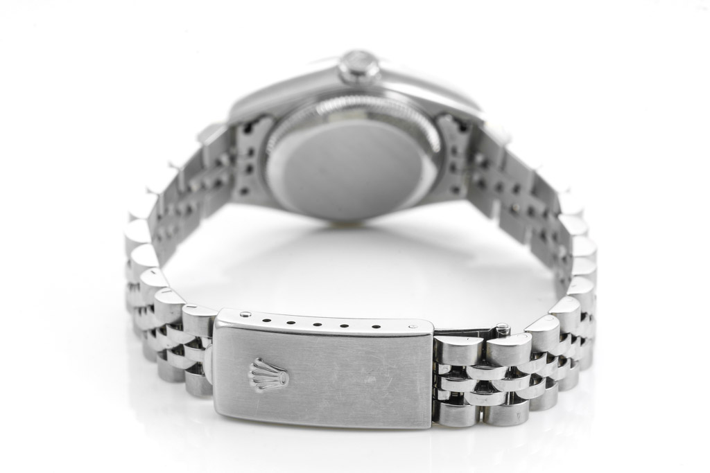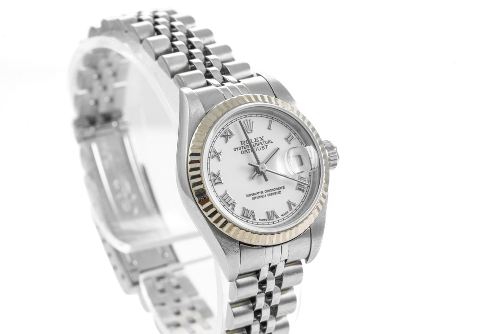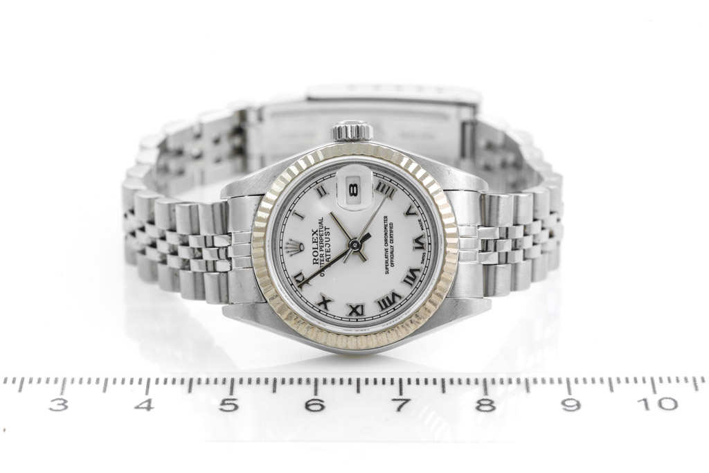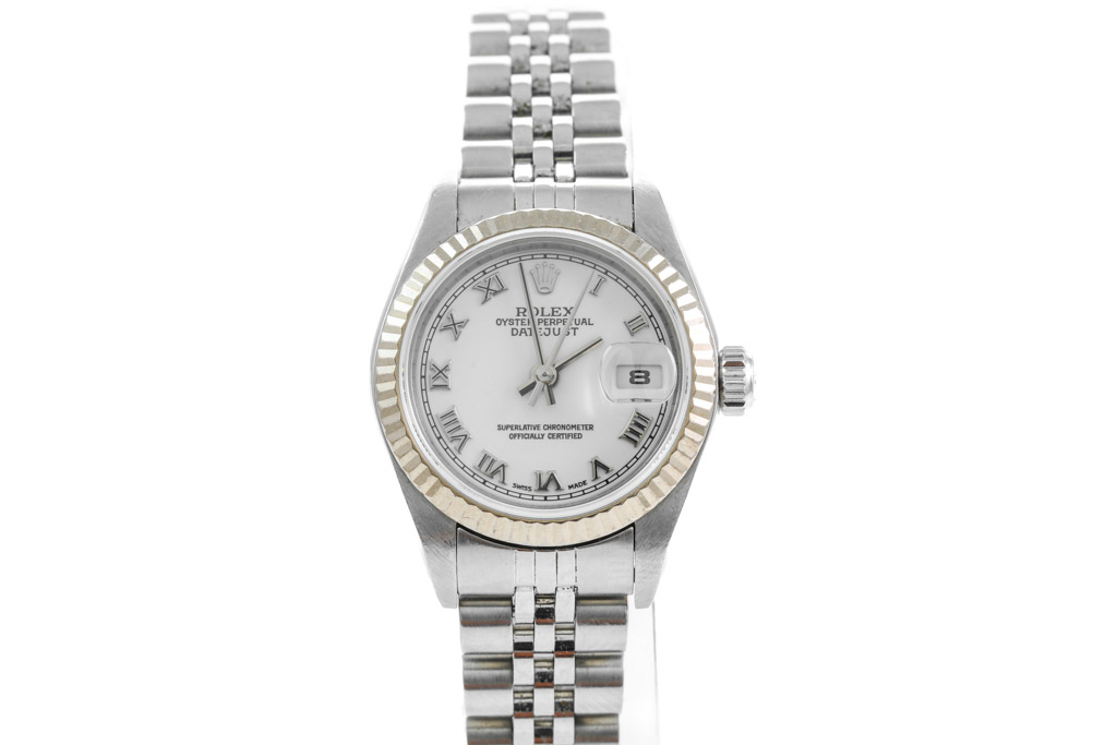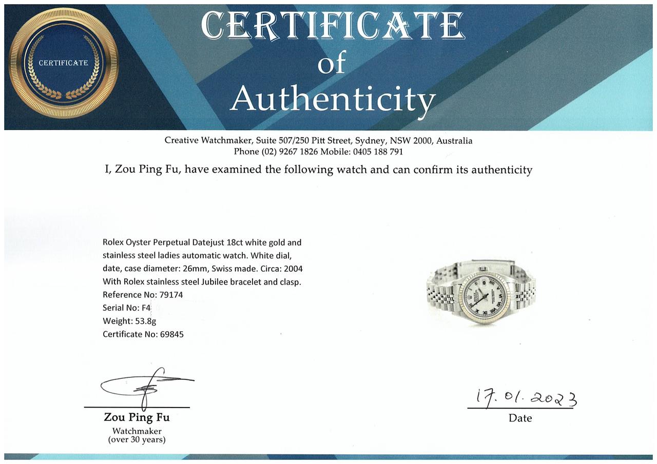 Rolex Oyster Perpetual Datejust 18ct white gold and stainless steel ladies automatic watch. White dial, date, case diameter: 26mm, wrist size: 16cm, Swiss made. Ref# 79174, Circa: 2004. With Rolex stainless steel Jubilee bracelet and clasp. With Certificate of Authenticity and Rolex box. 3 month FSA warranty. (Pre-owned)