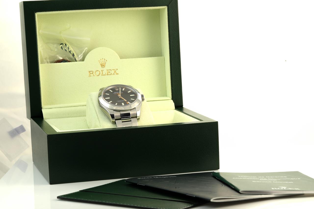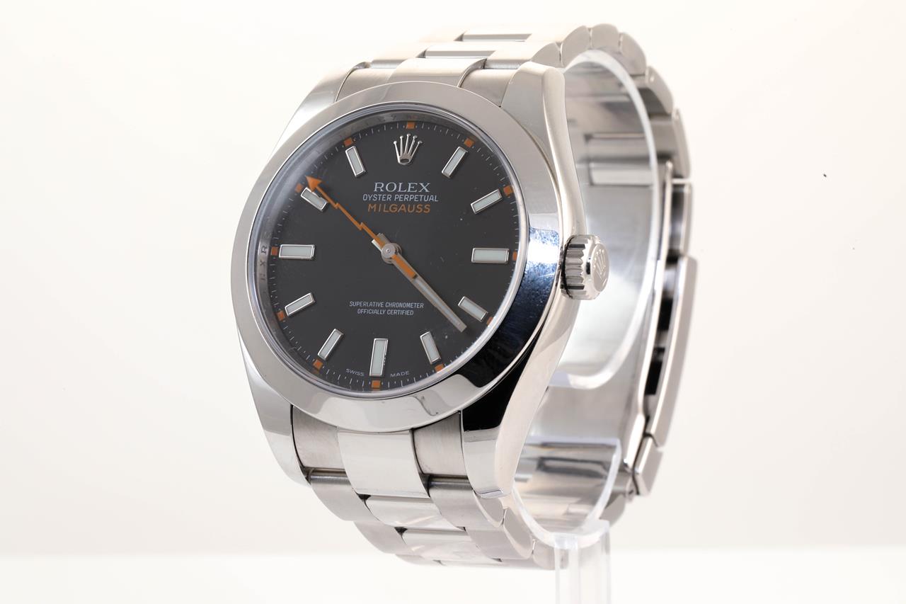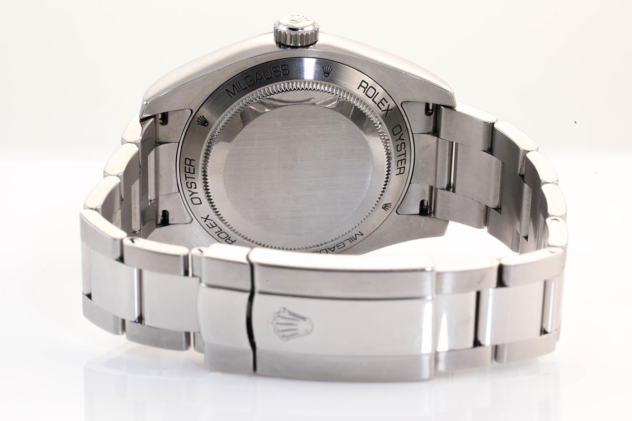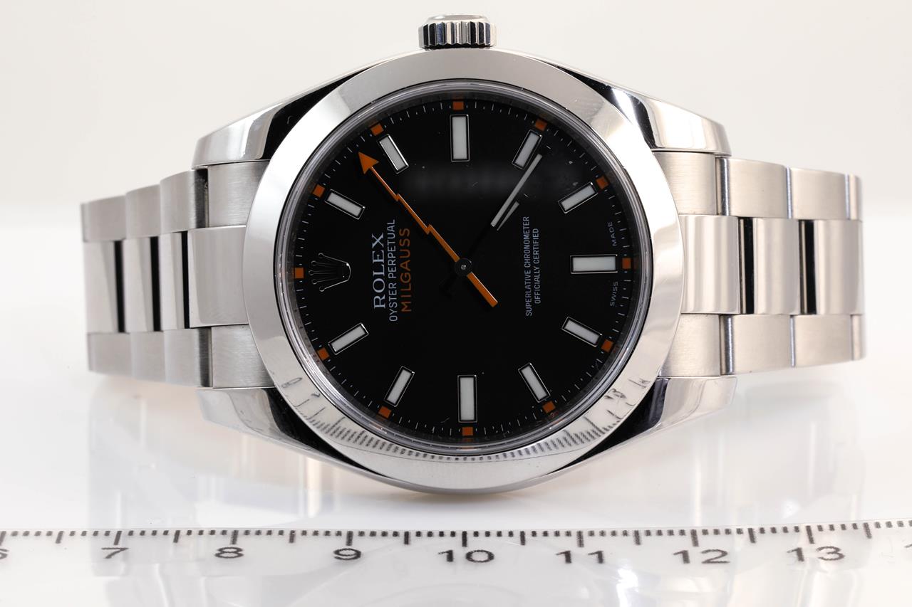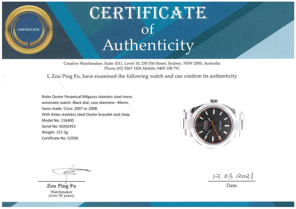 Rolex Oyster Perpetual Milgauss stainless steel mens automatic watch. Black dial, case diameter: 40mm, wrist size: 18cm, Swiss made. Ref #116400, Circa: 2007 or 2008. With Rolex stainless steel Oyster bracelet and clasp. With Certificate of Authenticity. With Rolex Guarantee certificate card dated 1 Nov 2007 inside Rolex box. 3 month FSA warranty. (Pre-owned)