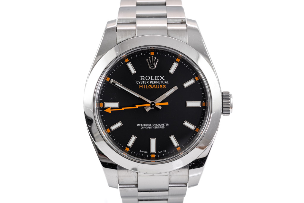 Rolex Oyster Perpetual Milgauss stainless steel mens automatic watch. Black dial, case diameter: 40mm, wrist size: 18cm, Swiss made. Ref# 116400, Circa: 2008 or 2009. With Rolex stainless steel Oyster bracelet and clasp. With Certificate of Authenticity and Rolex box. 3 month FSA warranty. (Pre-owned)