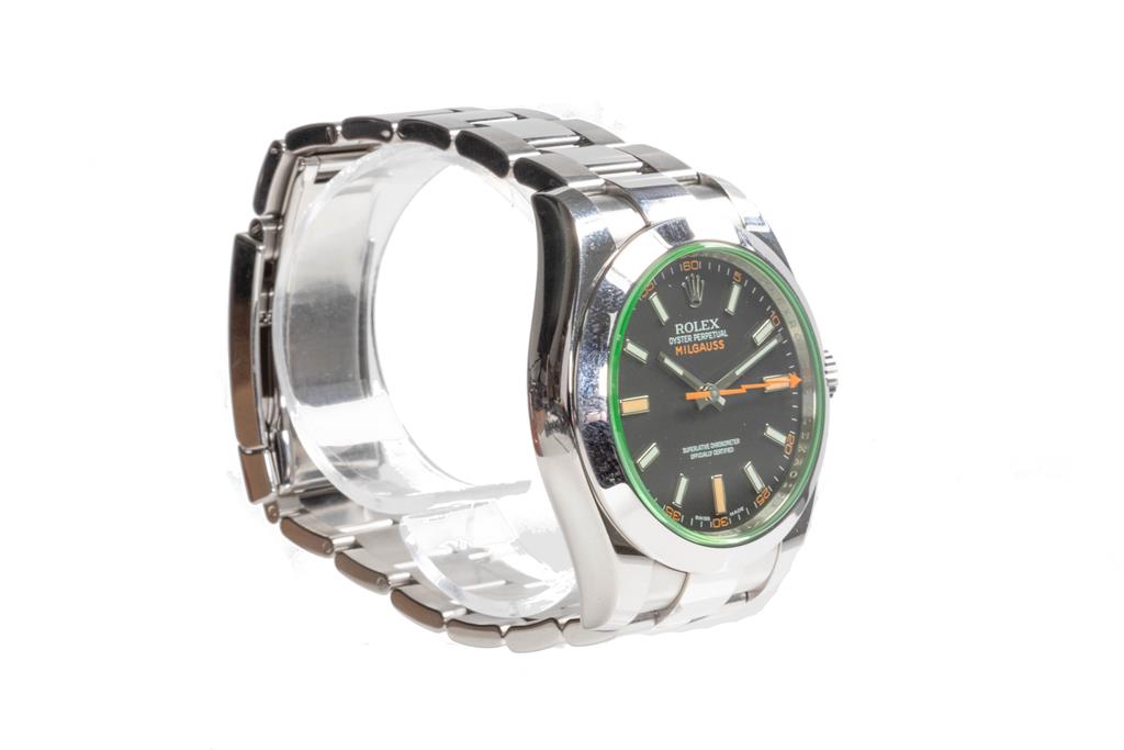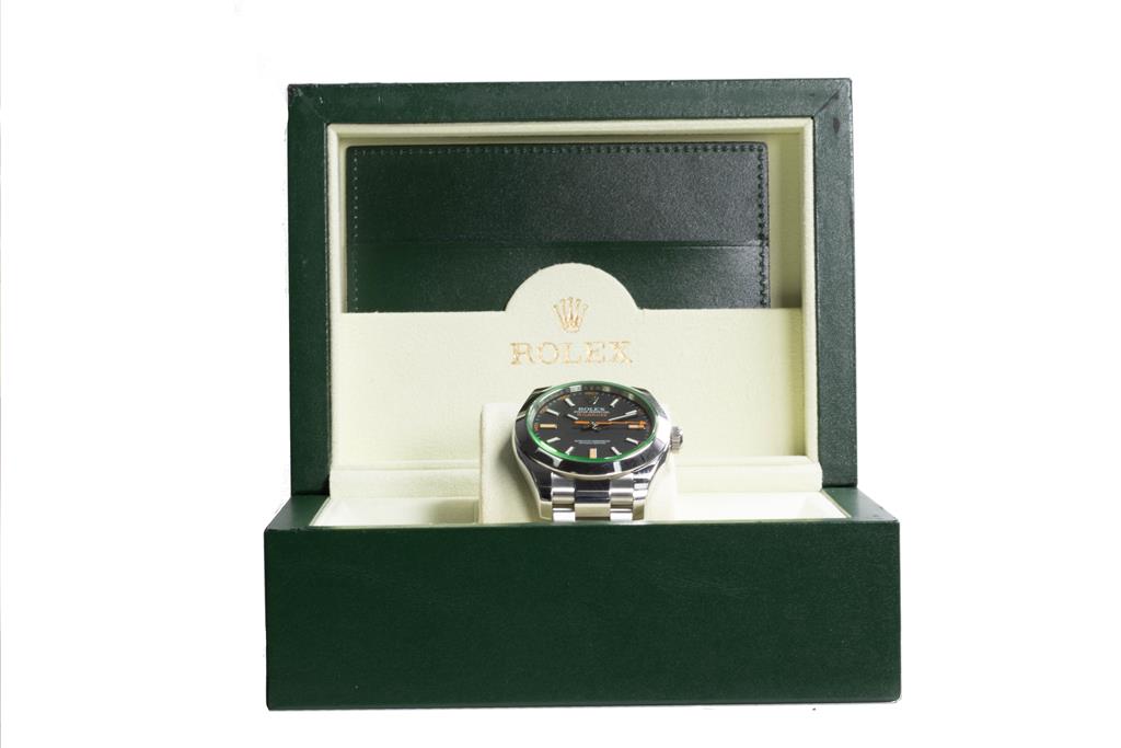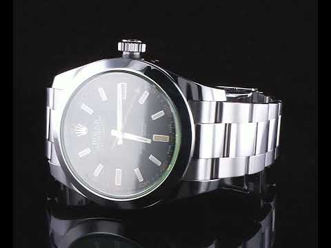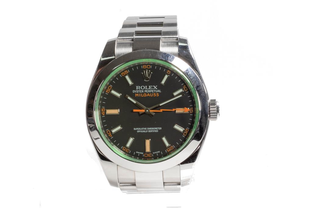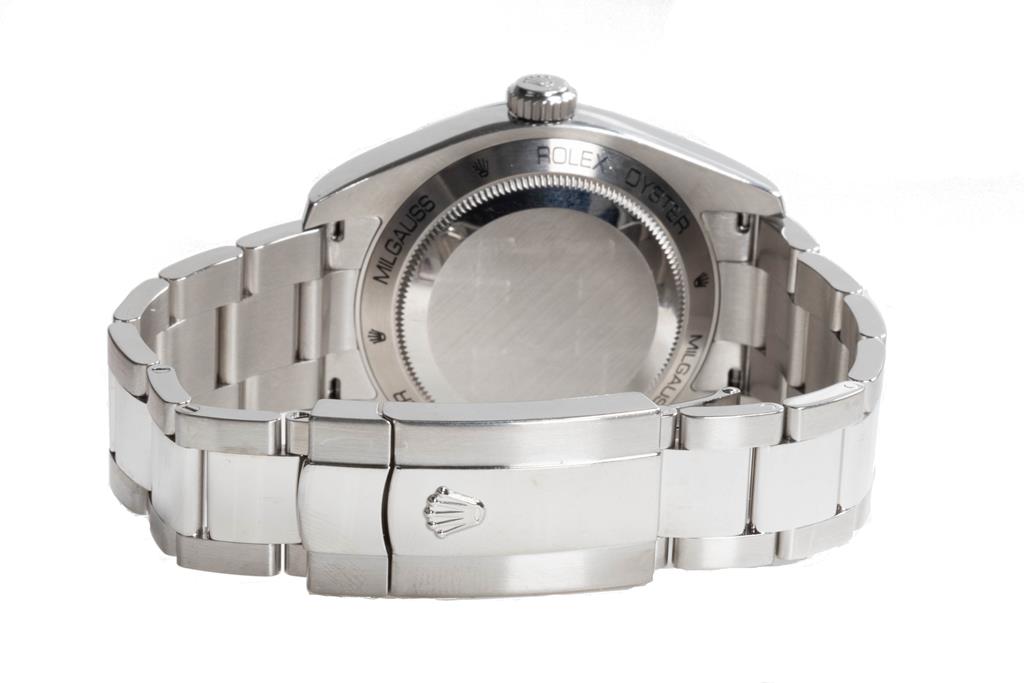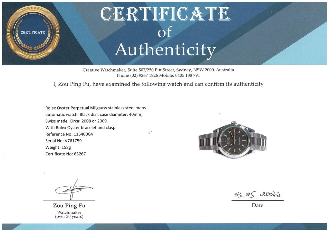 Rolex Oyster Perpetual Milgauss stainless steel mens automatic watch. Black dial, case diameter: 40mm, wrist size: 18.5cm, Swiss made. Ref# 116400GV, Circa: 2008 or 2009. With Rolex Oyster bracelet and clasp. With Certificate of Authenticity, Rolex International warranty card dated 06/06/2010 and Rolex box. 3 Month FSA warranty. (Pre-owned)
