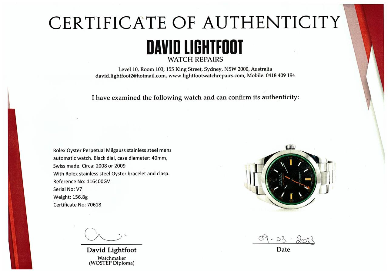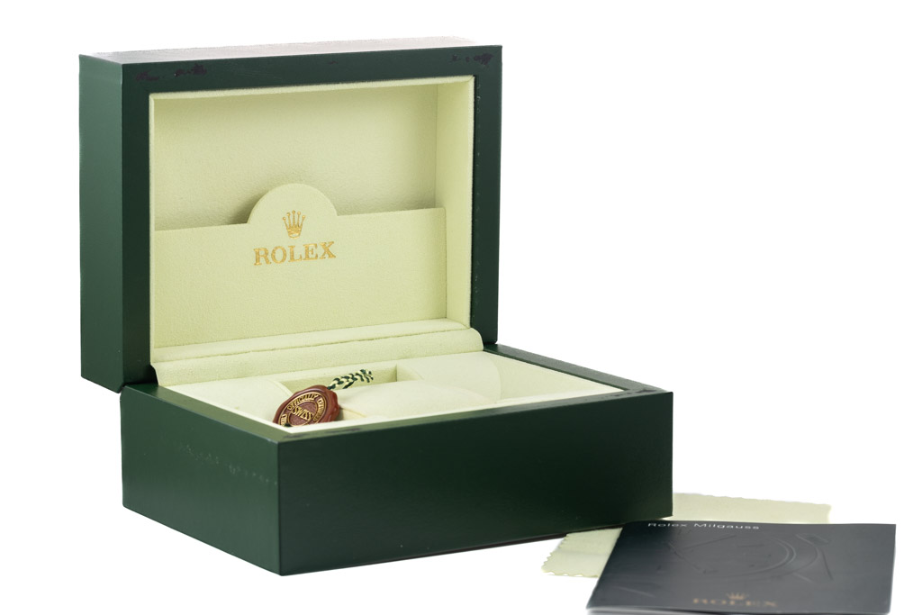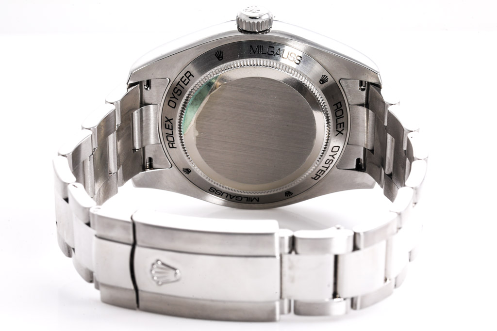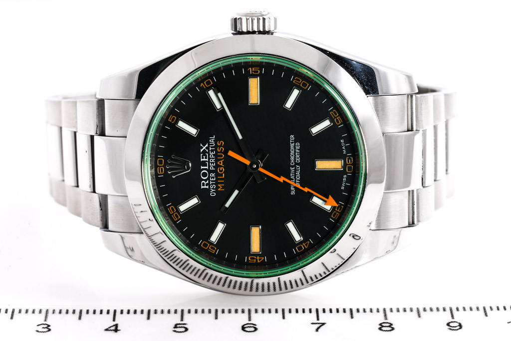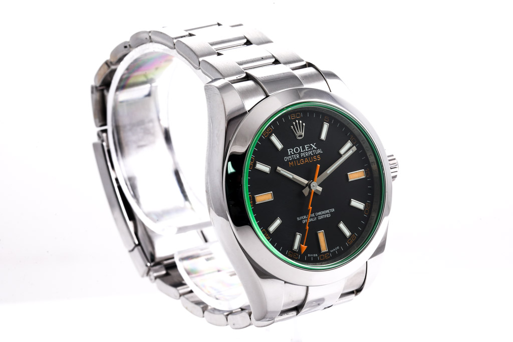Rolex Oyster Perpetual Milgauss stainless steel men's automatic watch. Black dial, case diameter: 40mm, wrist size: 18.5cm, Swiss made. Ref# 116400GV, Circa: 2008 or 2009. With Rolex stainless steel Oyster bracelet and clasp. With Certificate of Authenticity and Rolex box. 3 month FSA warranty. (Pre-owned)