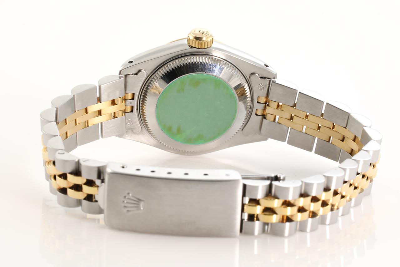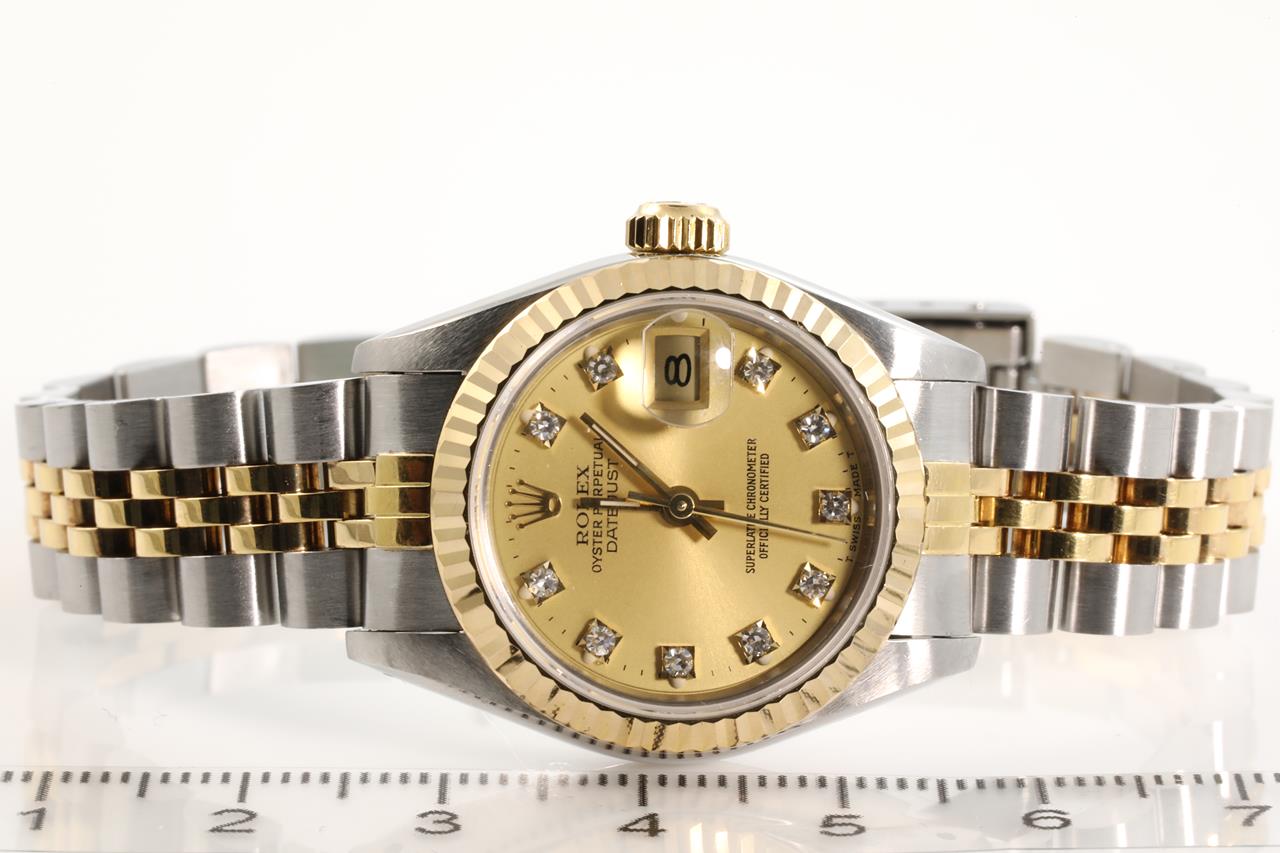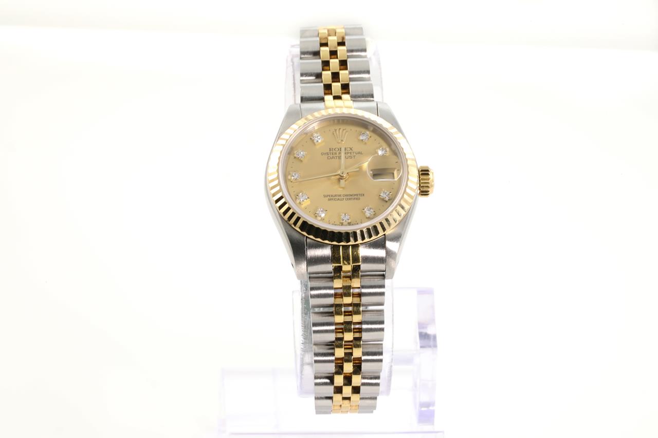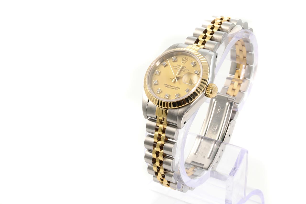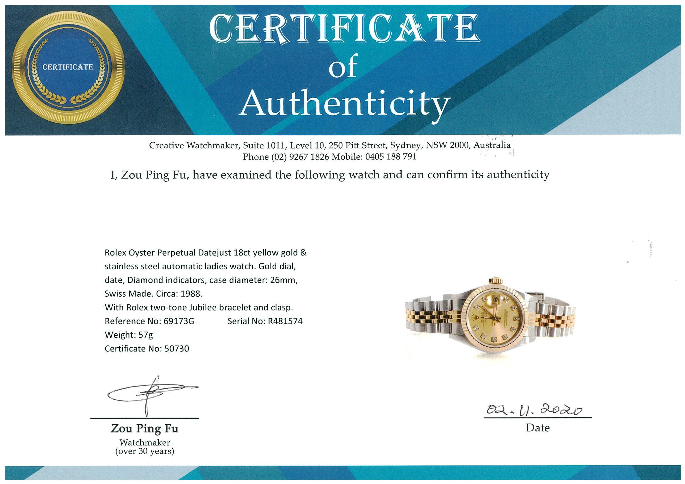 Rolex Oyster Perpetual Datejust 18ct yellow gold & stainless steel automatic ladies watch. Gold dial, date, Diamond indicators, case diameter: 26mm, wrist size: 16cm, Swiss Made. Ref# 69173G, Circa: 1988. With Rolex two-tone Jubilee bracelet and clasp. With certificate of authenticity and Rolex box. 3 month FSA warranty. (Pre-owned)