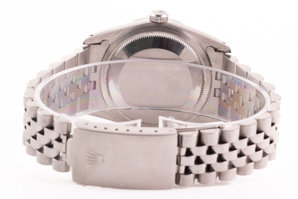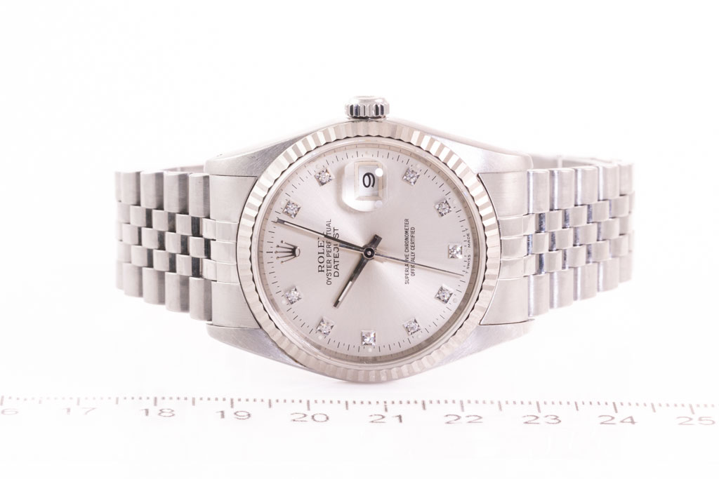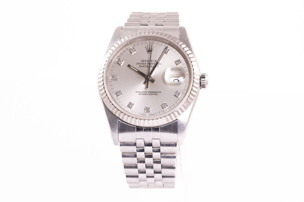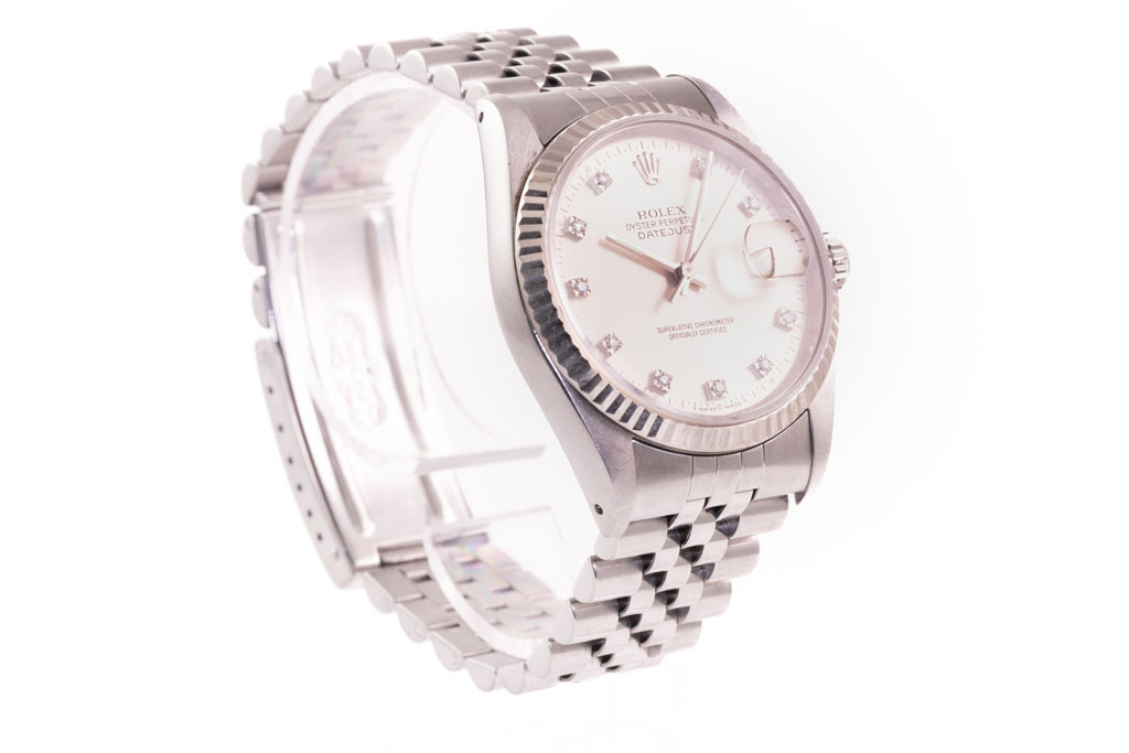 Rolex Oyster Perpetual Datejust 18ct white gold and stainless steel automatic mens watch. Silver dial, Diamond indicators, date, case diameter: 36mm, wrist size: 18.5cm, Swiss made. Ref# 16234G, Circa: 1989. With Rolex stainless steel Jubilee bracelet and clasp. With Certificate of Authenticity and Rolex box. 3 month FSA warranty. (Pre-owned)