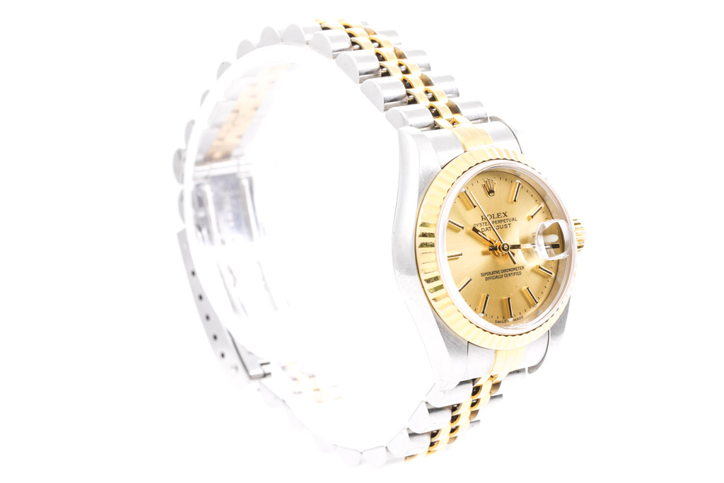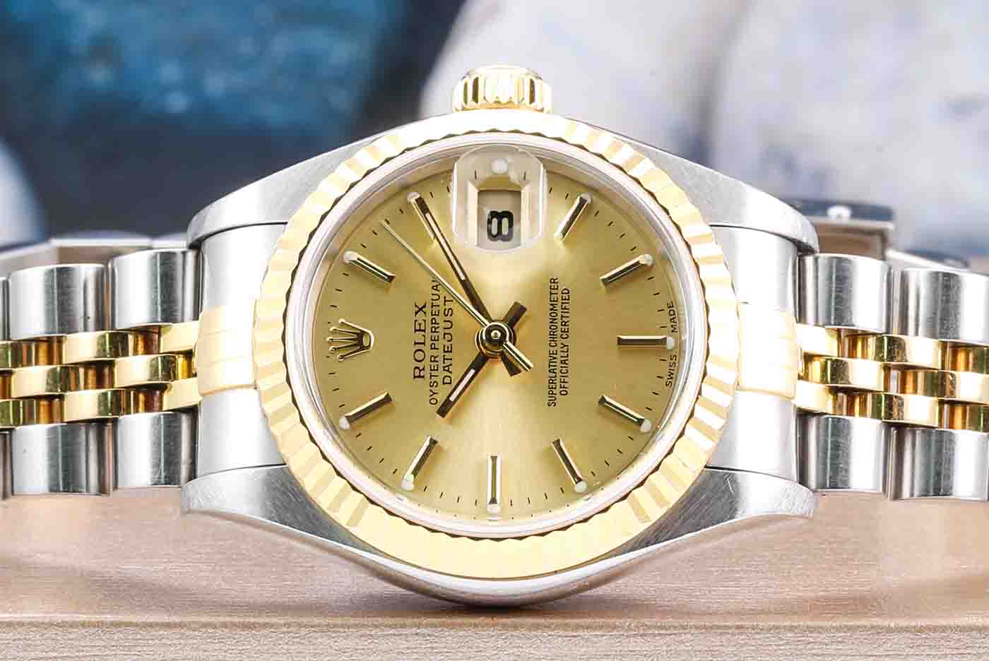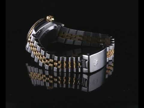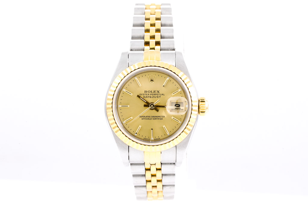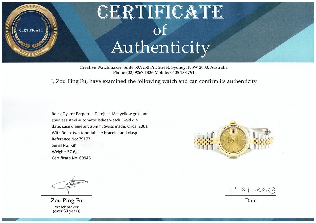 Rolex Oyster Perpetual Datejust 18ct yellow gold and stainless steel automatic ladies watch. Gold dial, date, case diameter: 26mm, wrist size: 16cm, Swiss made. Ref# 79173. Circa: 2001. With Rolex two tone Jubilee bracelet and clasp. With Certificate and Authenticity and Rolex box. 3 month FSA warranty (Pre-Owned)