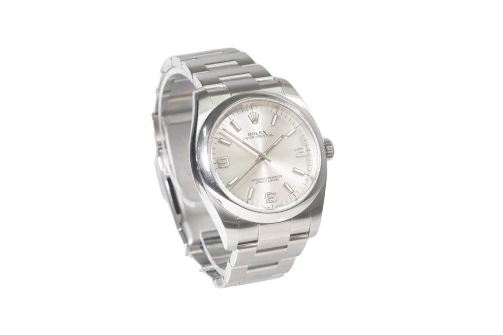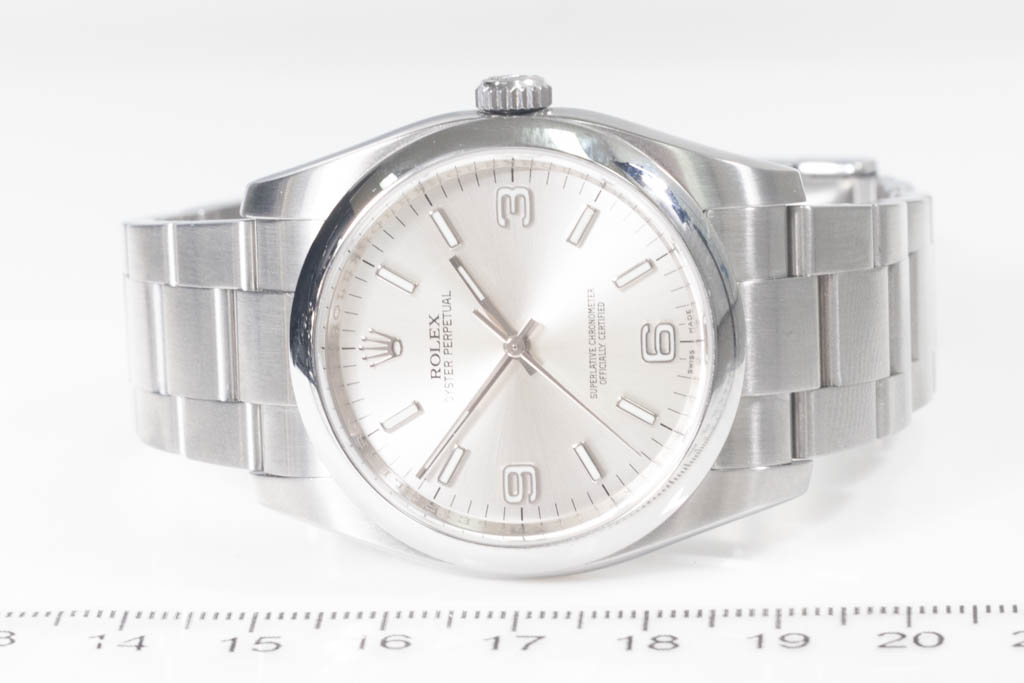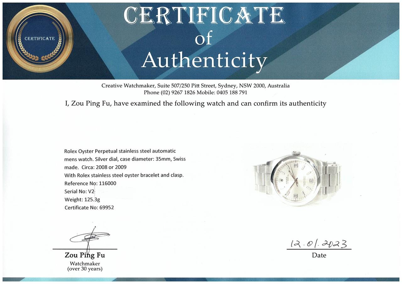 Rolex Oyster Perpetual stainless steel automatic mens watch. Silver dial, case diameter: 35mm, wrist size: 18cm, Swiss made. Ref# 116000, Circa: 2008 or 2009. With Rolex stainless steel oyster bracelet and clasp. With Certificate of Authenticity and Rolex box. 3 month FSA warranty (Pre-owned)