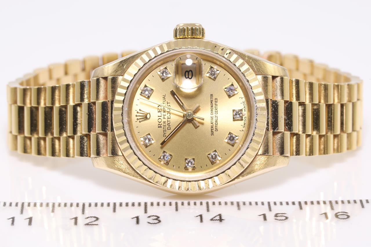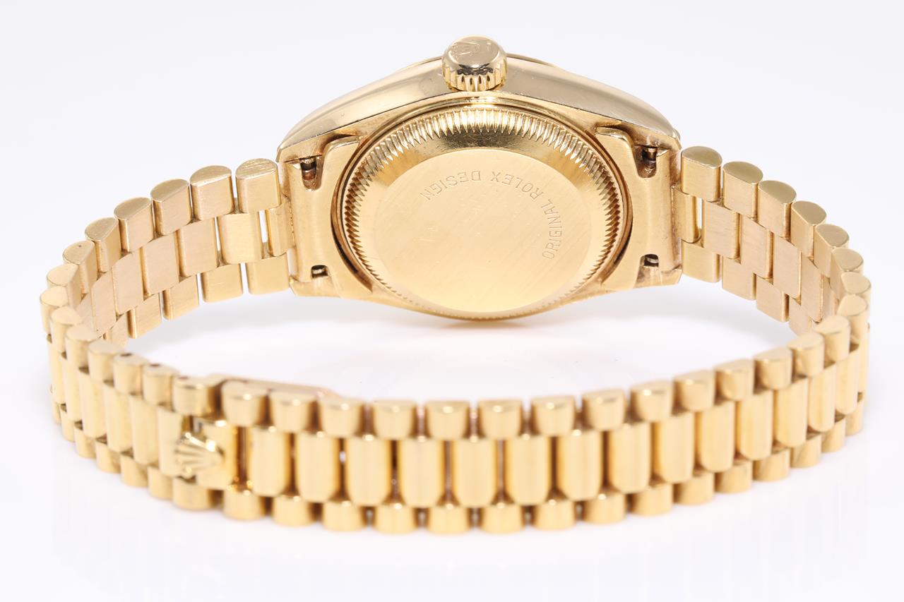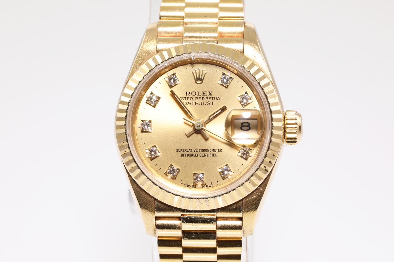 Rolex Oyster Perpetual Datejust 18ct yellow gold automatic ladies watch. Gold dial, Diamond indicators, date, wrist size: 15.5cm, case diameter 26mm, Swiss made. Ref# 69178G, Circa: 1991. With Rolex 18ct yellow gold Presidential bracelet & clasp. With certificate of authenticity and Rolex box with Rolex gift shopping bag. 3 month FSA warranty. (Pre-owned)