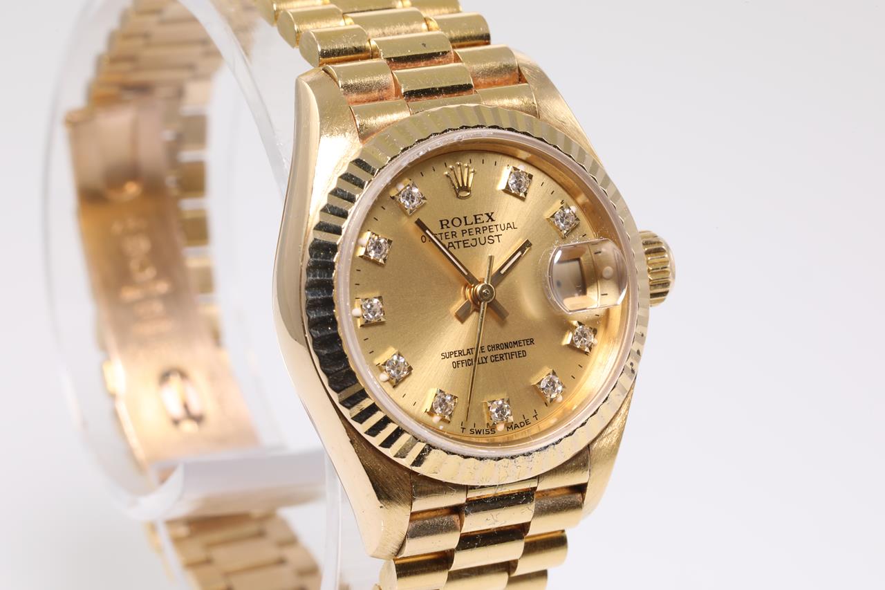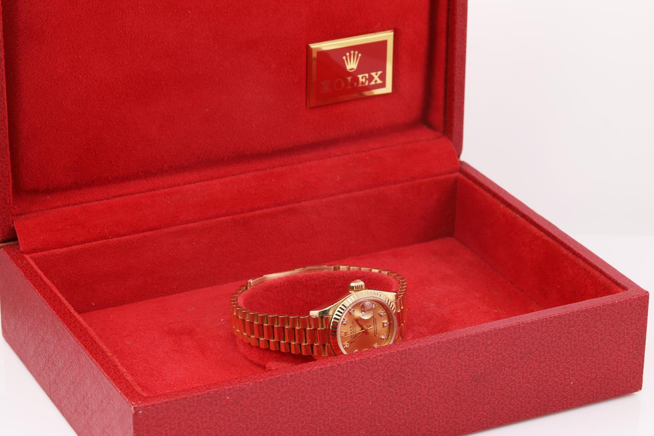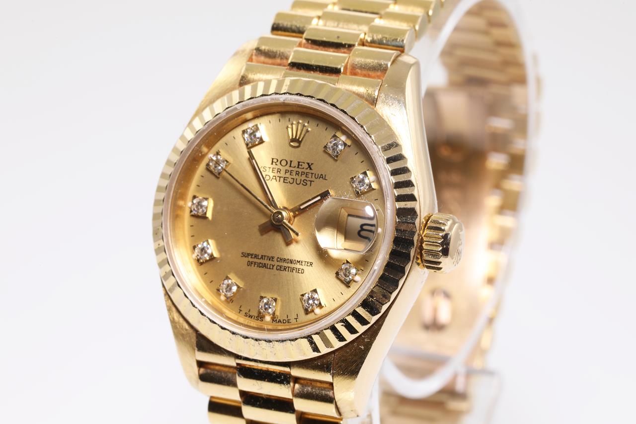 Rolex Oyster Perpetual Datejust 18ct yellow gold automatic ladies watch. Gold dial, Diamond indicators, date, wrist size: 15.5cm, case diameter 26mm, Swiss made. Ref# 69178G, Circa: 1991. With Rolex 18ct yellow gold Presidential bracelet & clasp. With certificate of authenticity and Rolex box with Rolex gift shopping bag. 3 month FSA warranty. (Pre-owned)