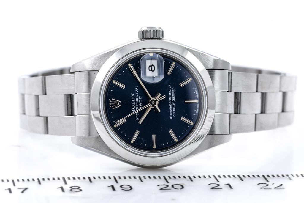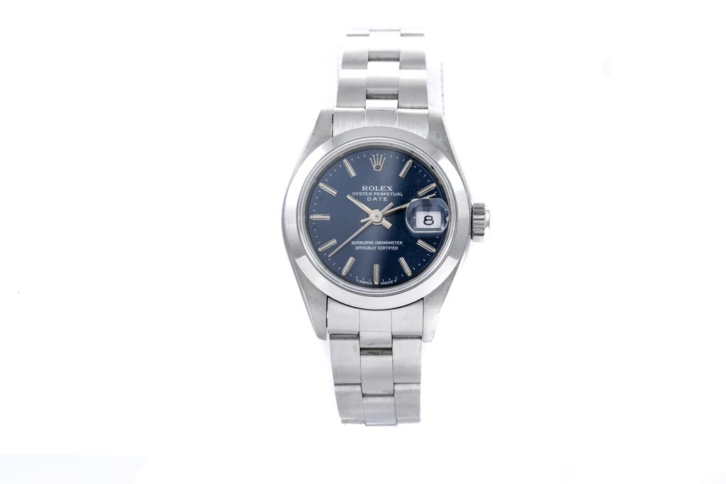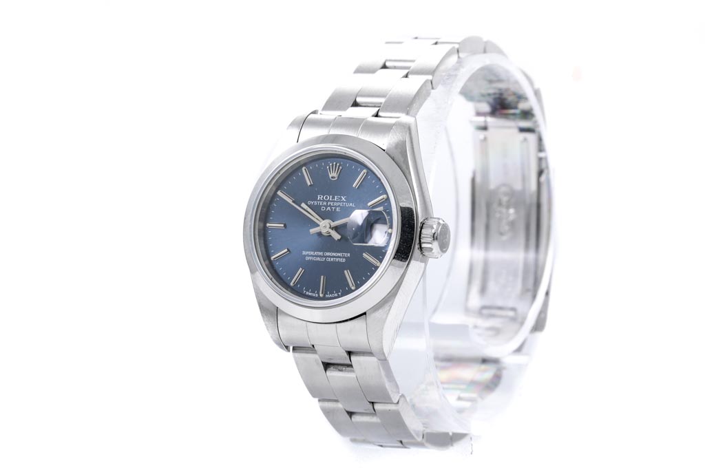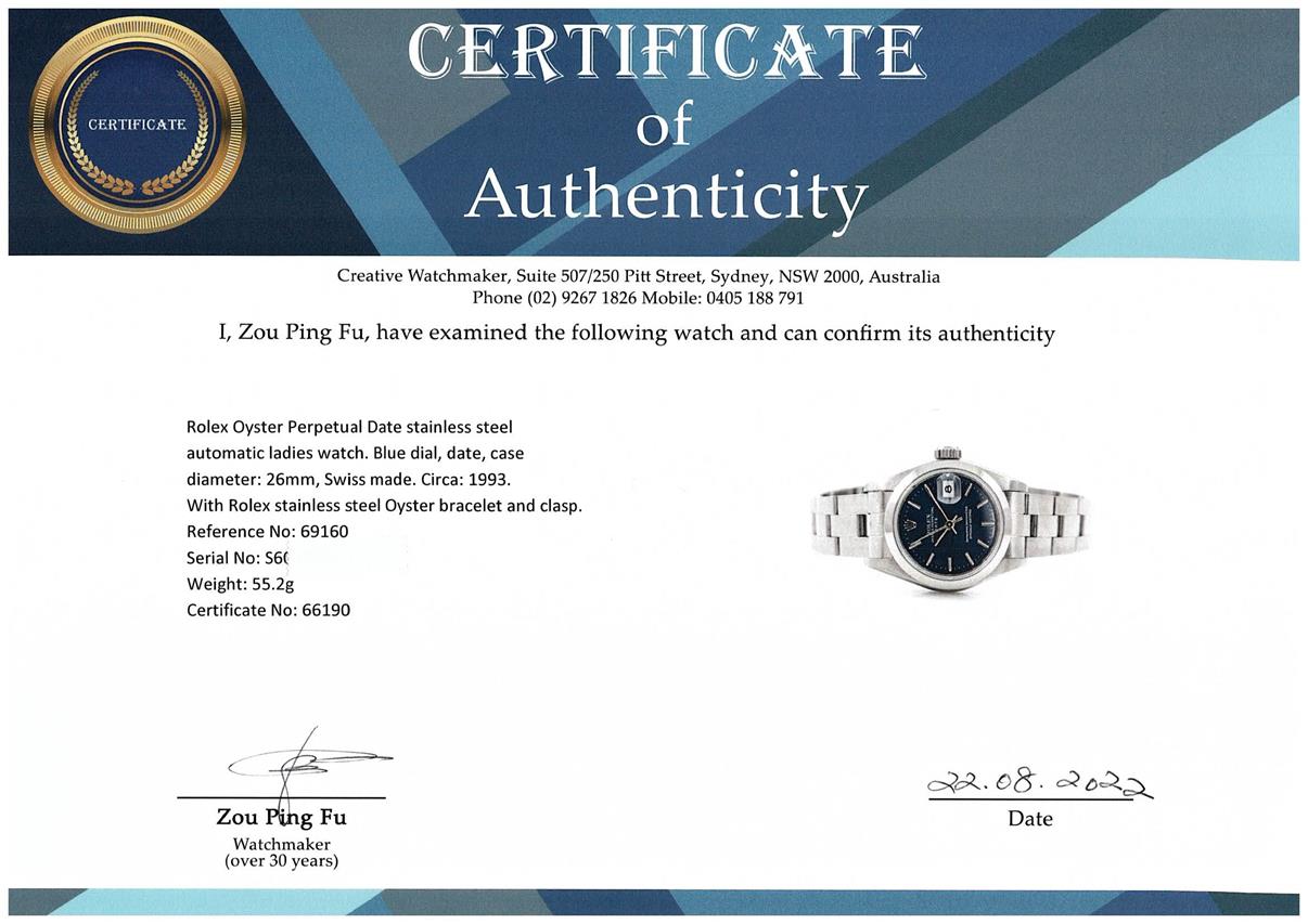 Rolex Oyster Perpetual Date stainless steel automatic ladies watch. Blue dial, date, case diameter: 26mm, wrist size: 17cm, Swiss made. Ref #69160, Circa: 1993. With Rolex stainless steel Oyster bracelet and clasp. With Certificate of Authenticity. 3 month FSA warranty. (Pre-owned)