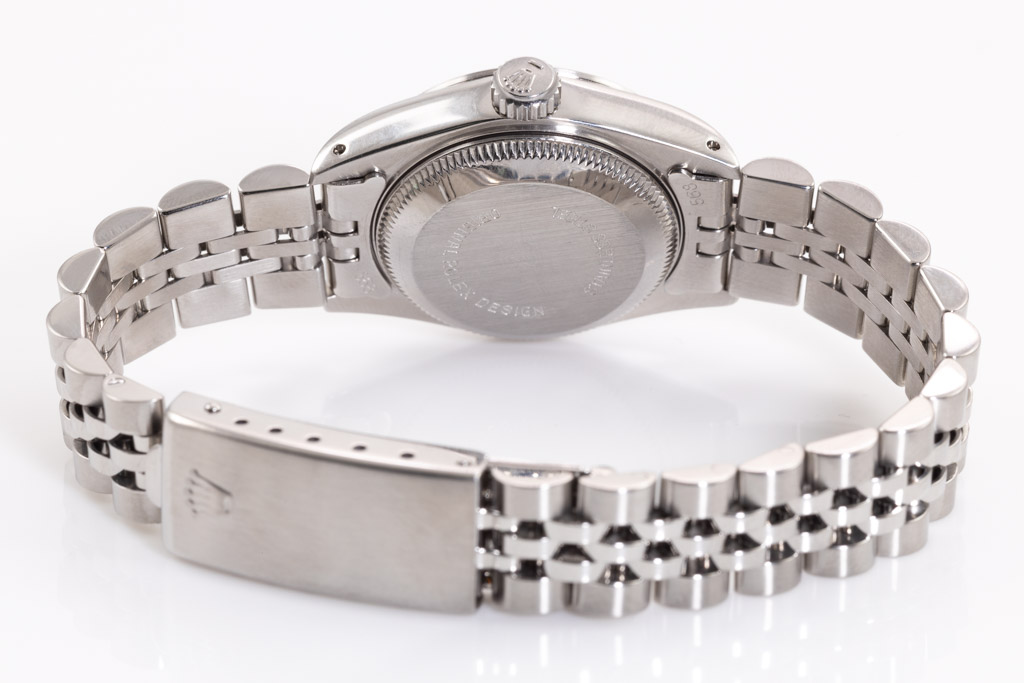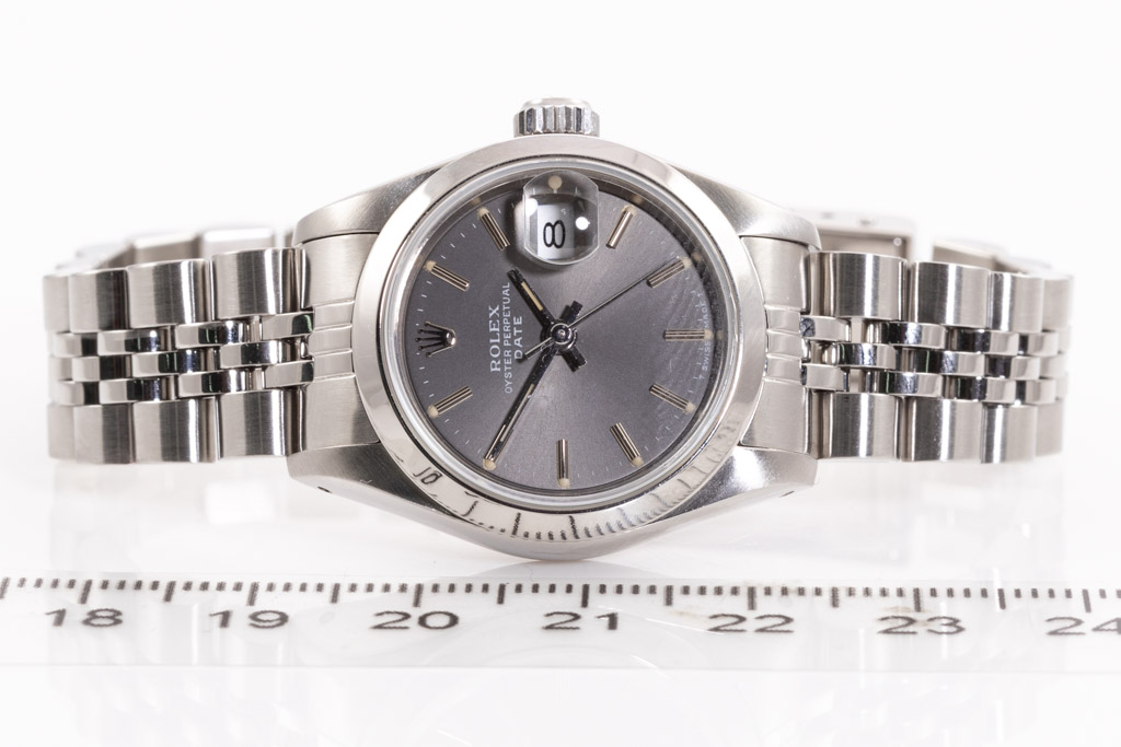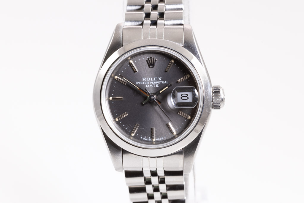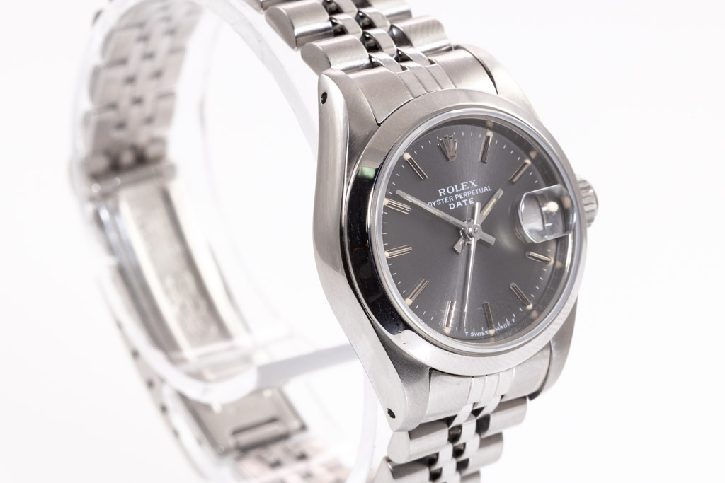 Rolex Oyster Perpetual Date stainless steel automatic ladies watch. Dark grey dial, date, case diameter: 26mm, wrist size: 16cm, Swiss made. Ref# 69160, Circa: 1988. With Rolex stainless steel Jubilee bracelet and clasp. With Certificate of Authenticity. 3 month FSA warranty. (Pre-owned)