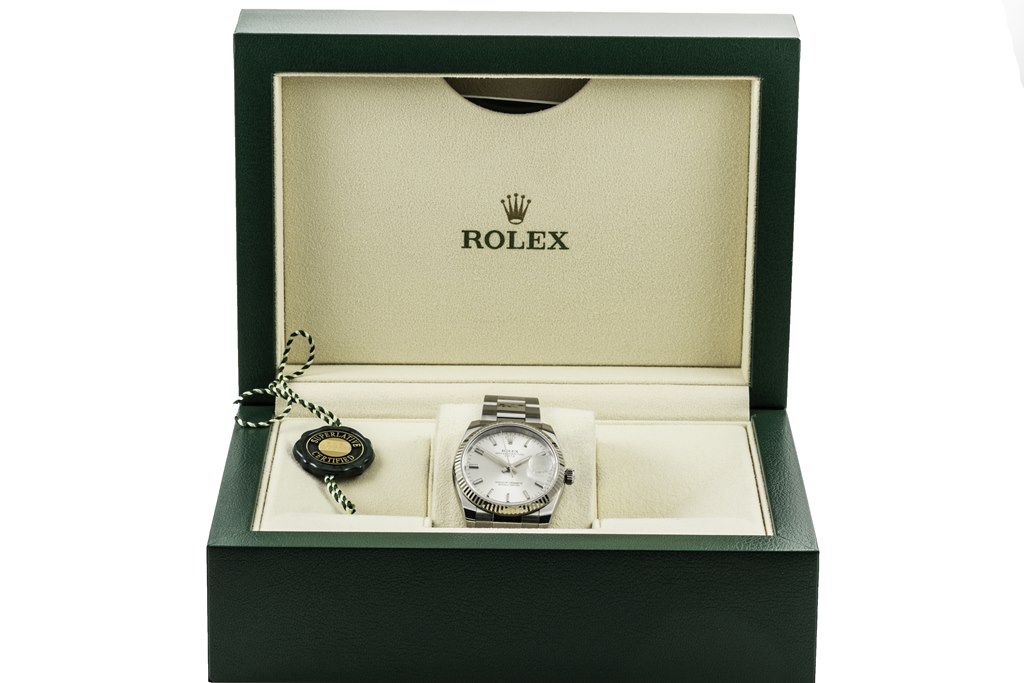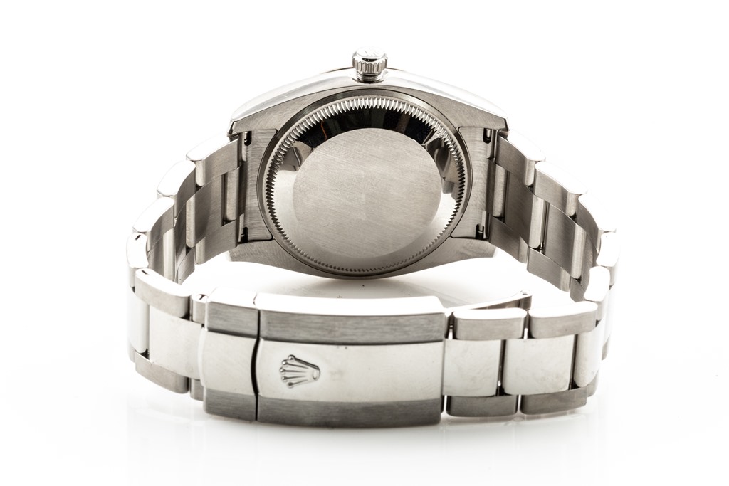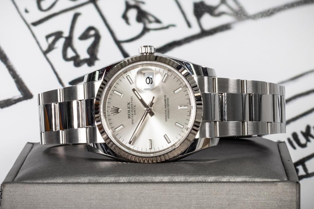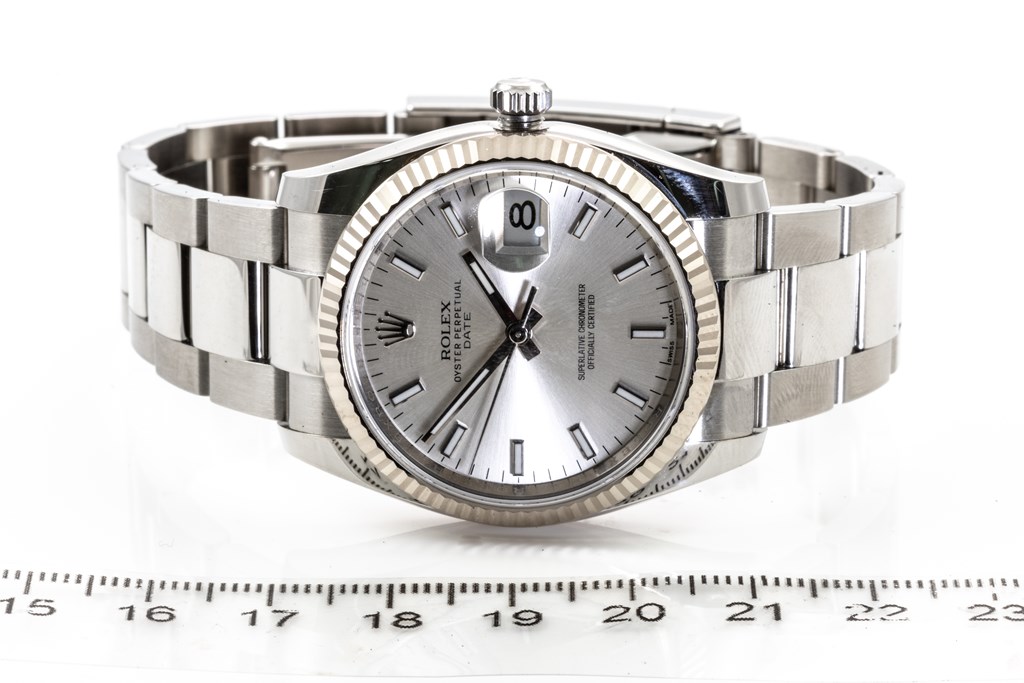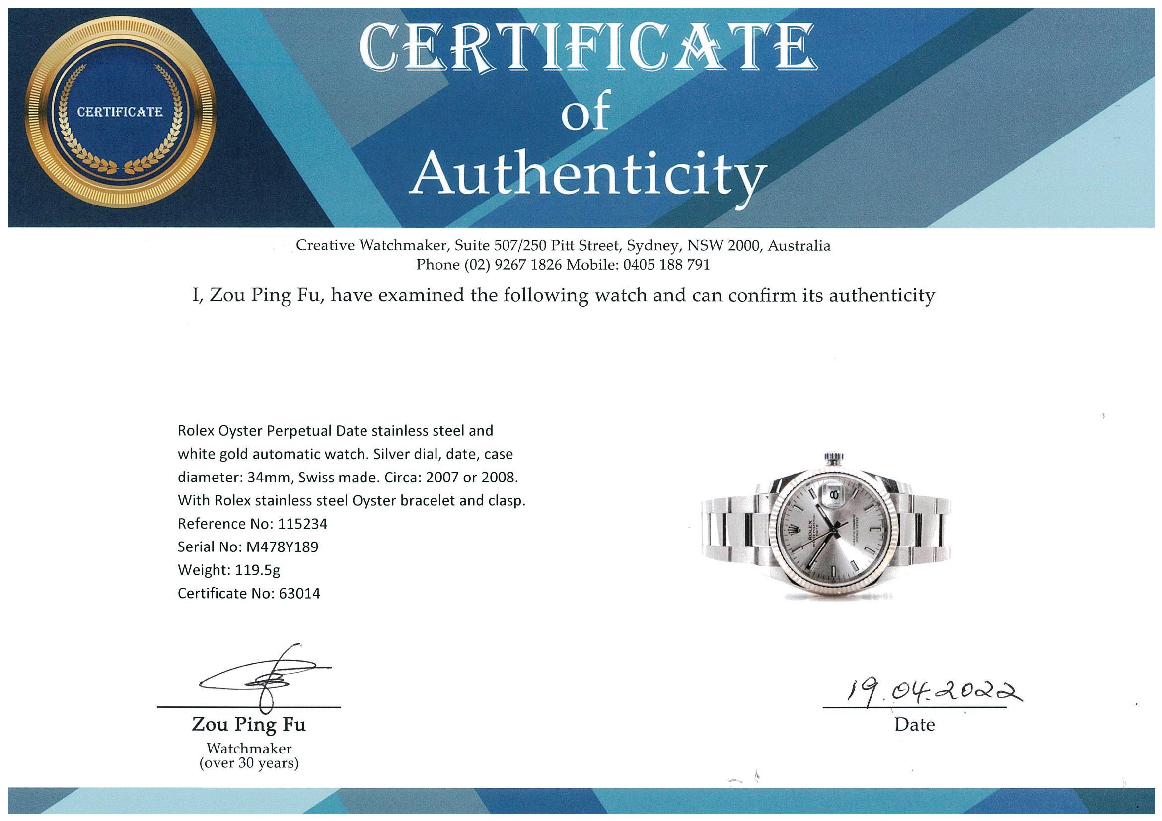 Rolex Oyster Perpetual Date stainless steel and 18ct white gold automatic watch. Silver dial, date, case diameter: 34mm, wrist size: 18cm, Swiss made. Ref# 115234. Circa: 2007 or 2008. With Rolex stainless steel Oyster bracelet and clasp. With Certificate of Authenticity, Rolex International Guarantee card dated 22/10/2020 and Rolex box. 3 month FSA warranty. (Pre-owned)