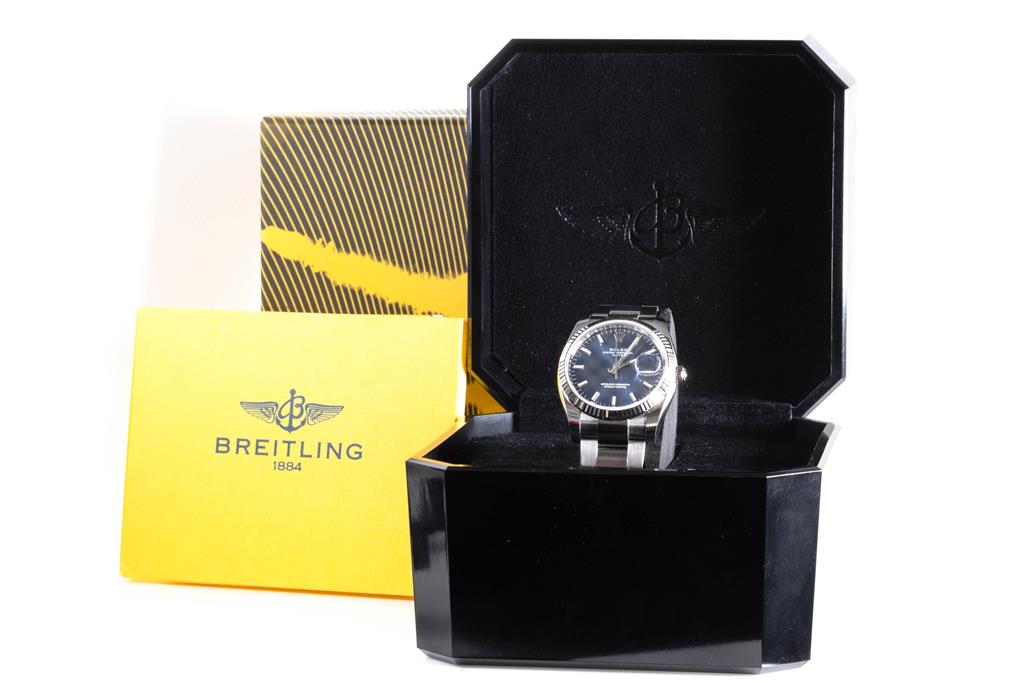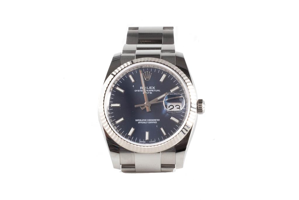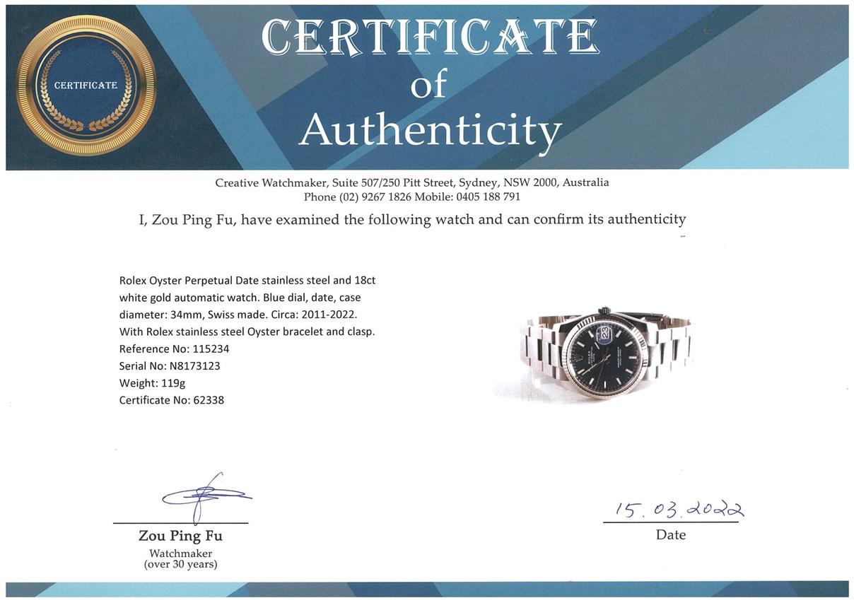 Rolex Oyster Perpetual Date stainless steel and 18ct white gold automatic watch. Blue dial, date, case diameter: 34mm, wrist size: 18cm, Swiss made. Ref# 115234. Circa: 2011-2022. With Rolex stainless steel Oyster bracelet and clasp. With Certificate of Authenticity, Rolex International Guarantee card dated 31/07/2021 and Rolex box. 3 month FSA warranty. (Pre-owned)