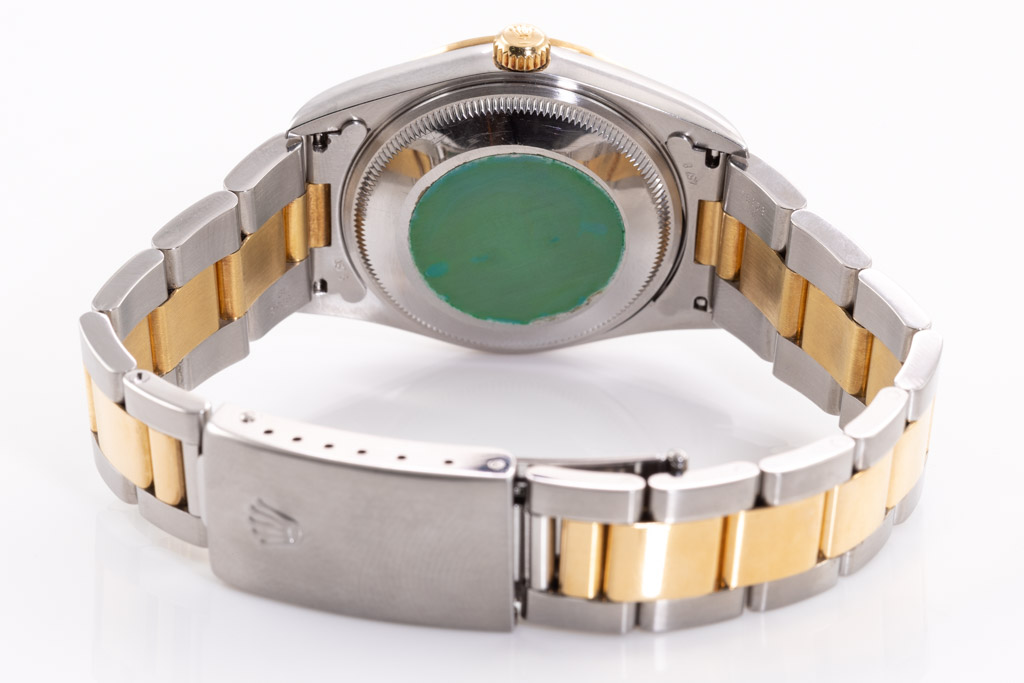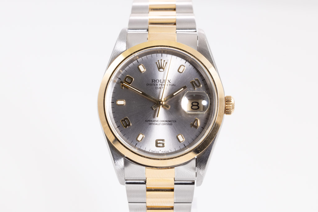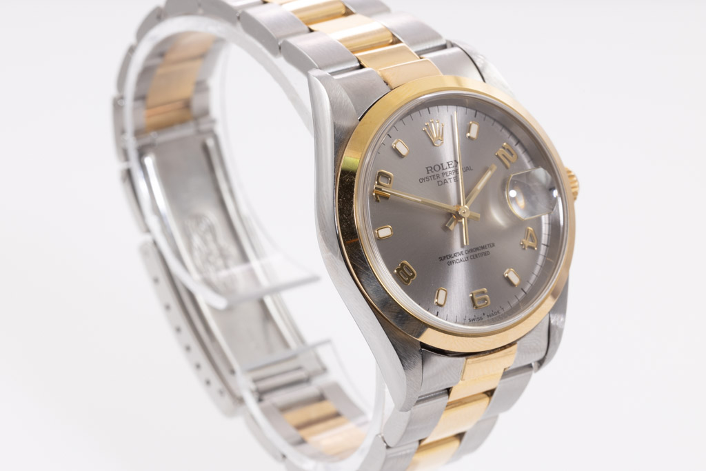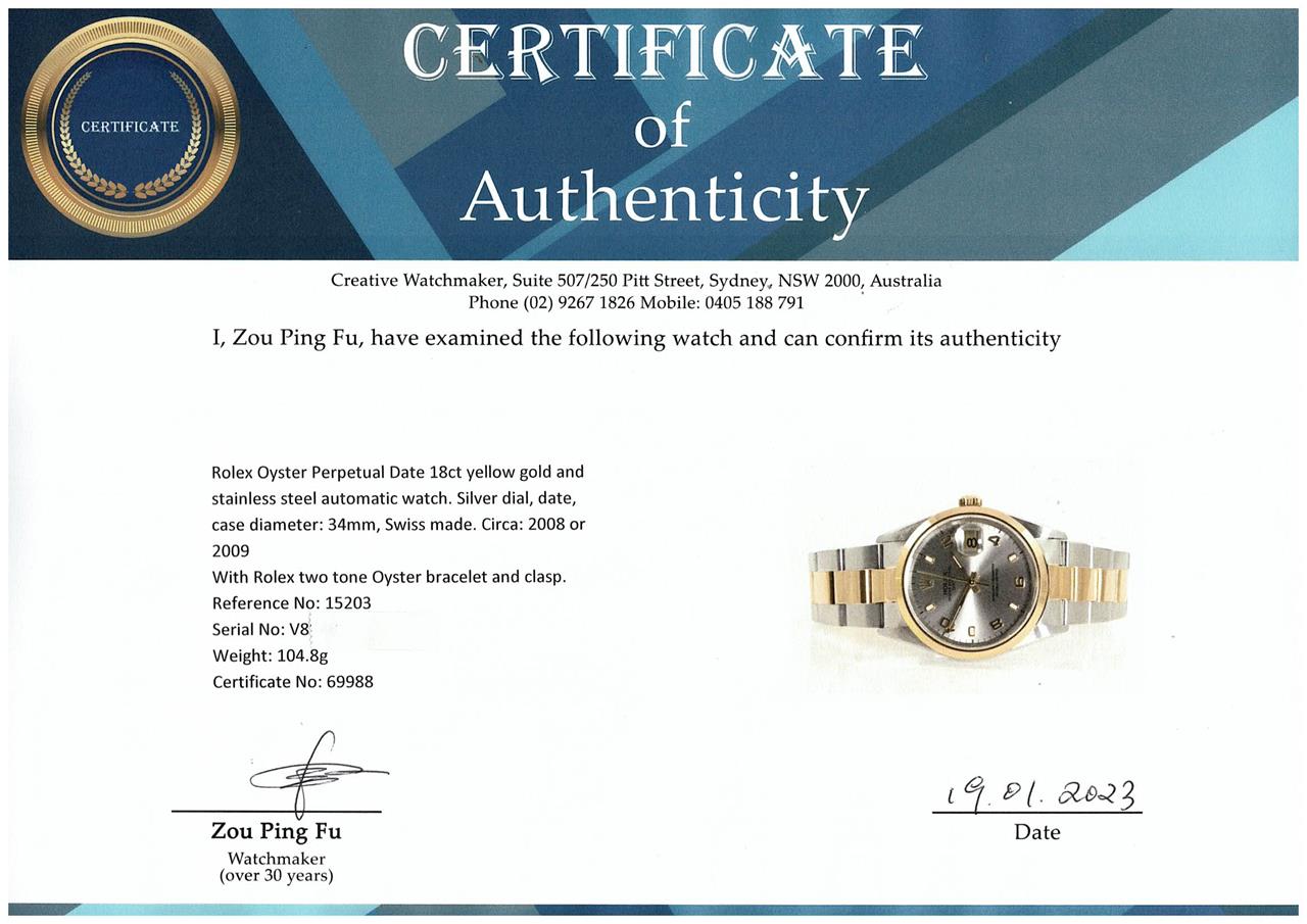 Rolex Oyster Perpetual Date 18ct yellow gold and stainless steel automatic watch. Silver dial, date, case diameter: 34mm, wrist size: 18.5cm, Swiss made. Ref# 15203. Circa: 2008 or 2009. With Rolex two tone Oyster bracelet and clasp. With Certificate of Authenticity and Rolex box. 3 month FSA warranty (Pre-owned)