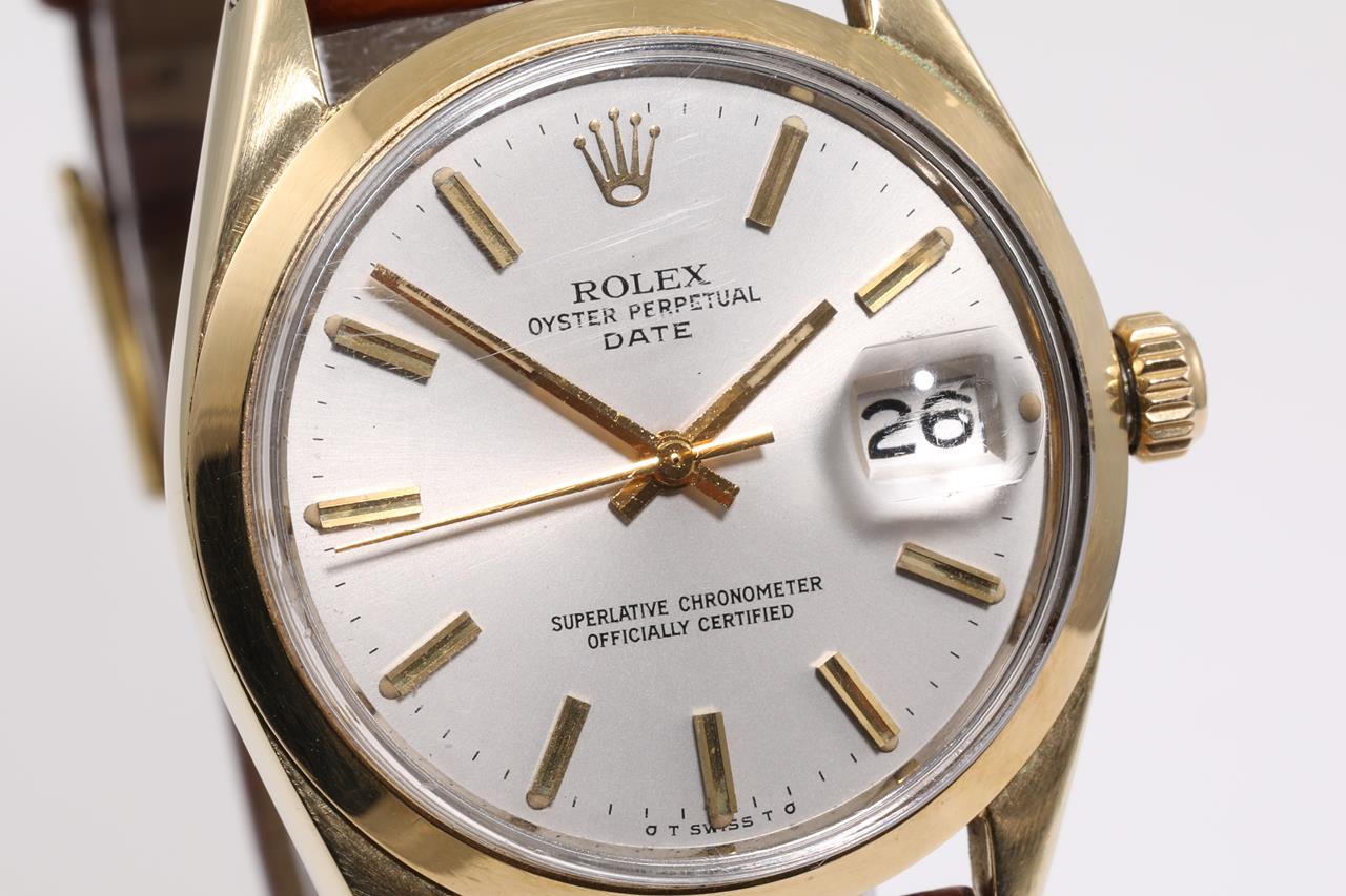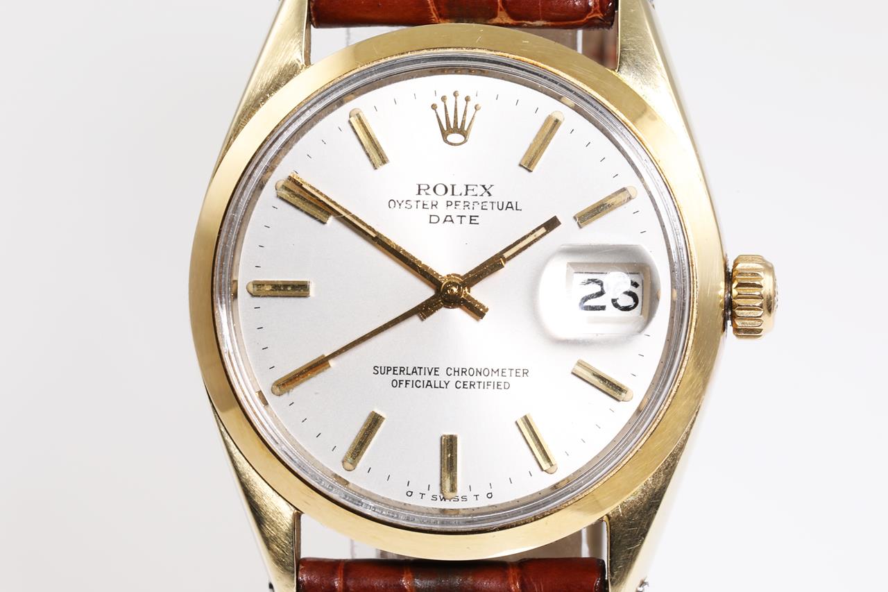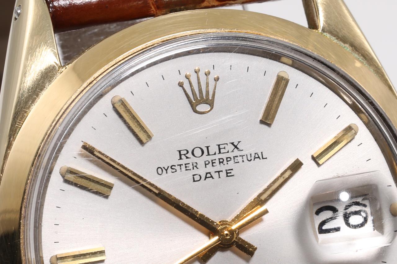 Rolex Oyster Perpetual Date gold plated stainless steel automatic watch. Silver dial, date, case diameter: 34mm, length: 21cm, Swiss made. Ref# 15505, Circa 1973. With unbranded brown leather strap and buckle. With Certificate of Authenticity. 3 month FSA warranty. (Pre-owned)