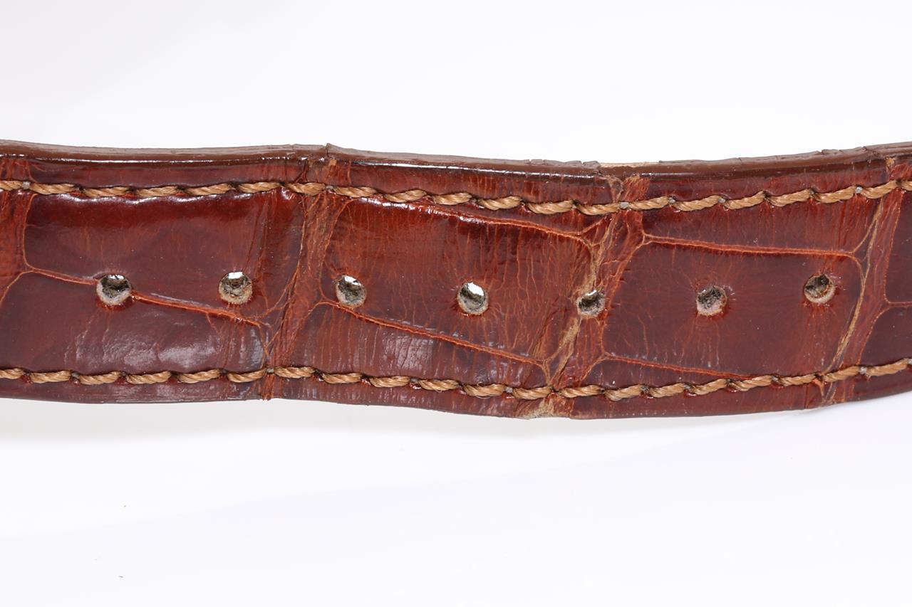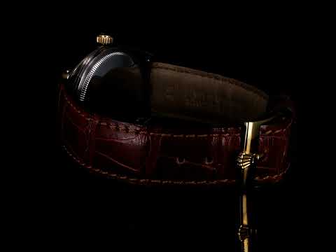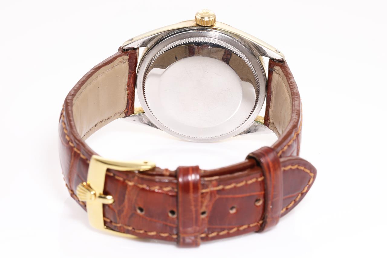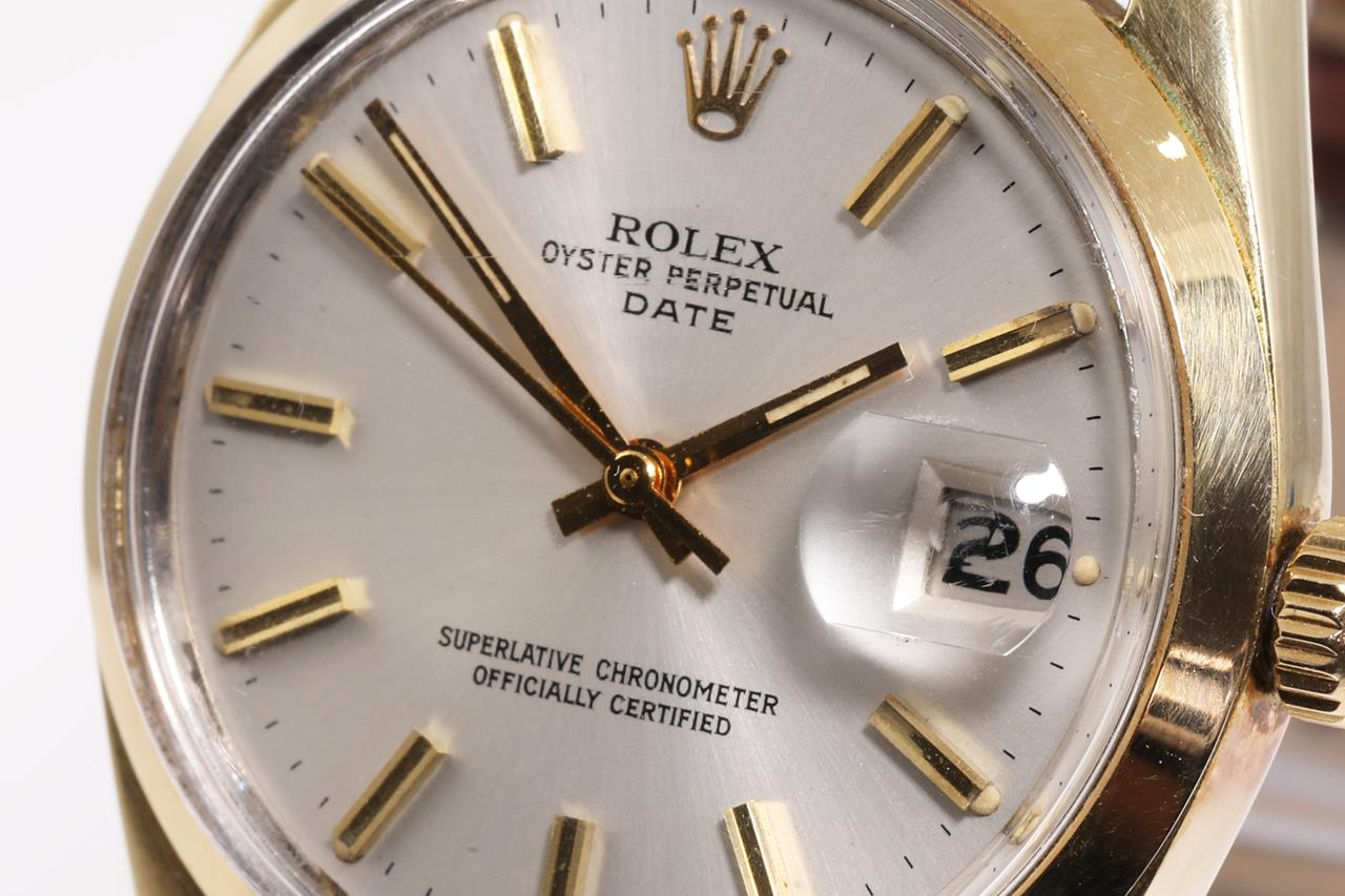 Rolex Oyster Perpetual Date gold plated stainless steel automatic watch. Silver dial, date, case diameter: 34mm, length: 21cm, Swiss made. Ref# 15505, Circa 1973. With unbranded brown leather strap and buckle. With Certificate of Authenticity. 3 month FSA warranty. (Pre-owned)
