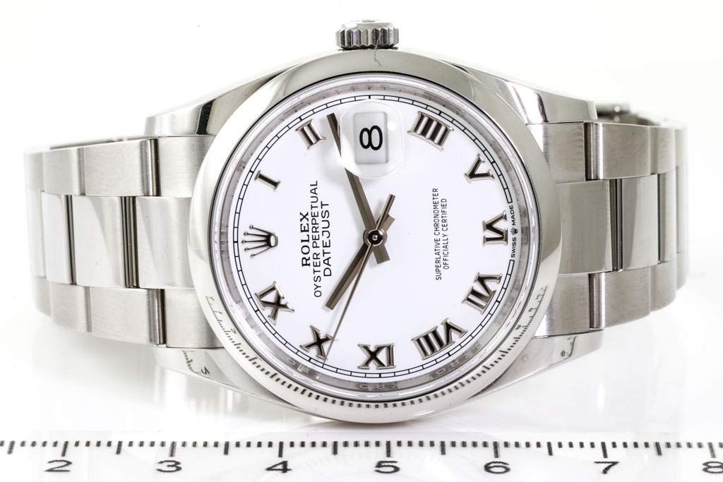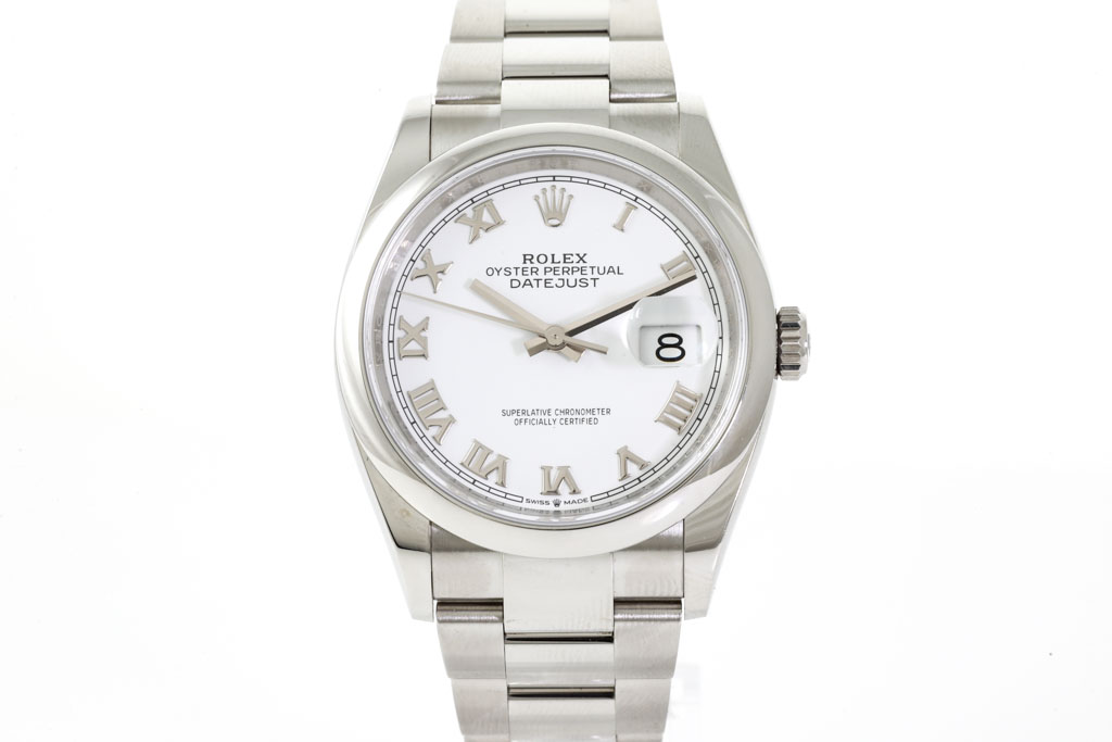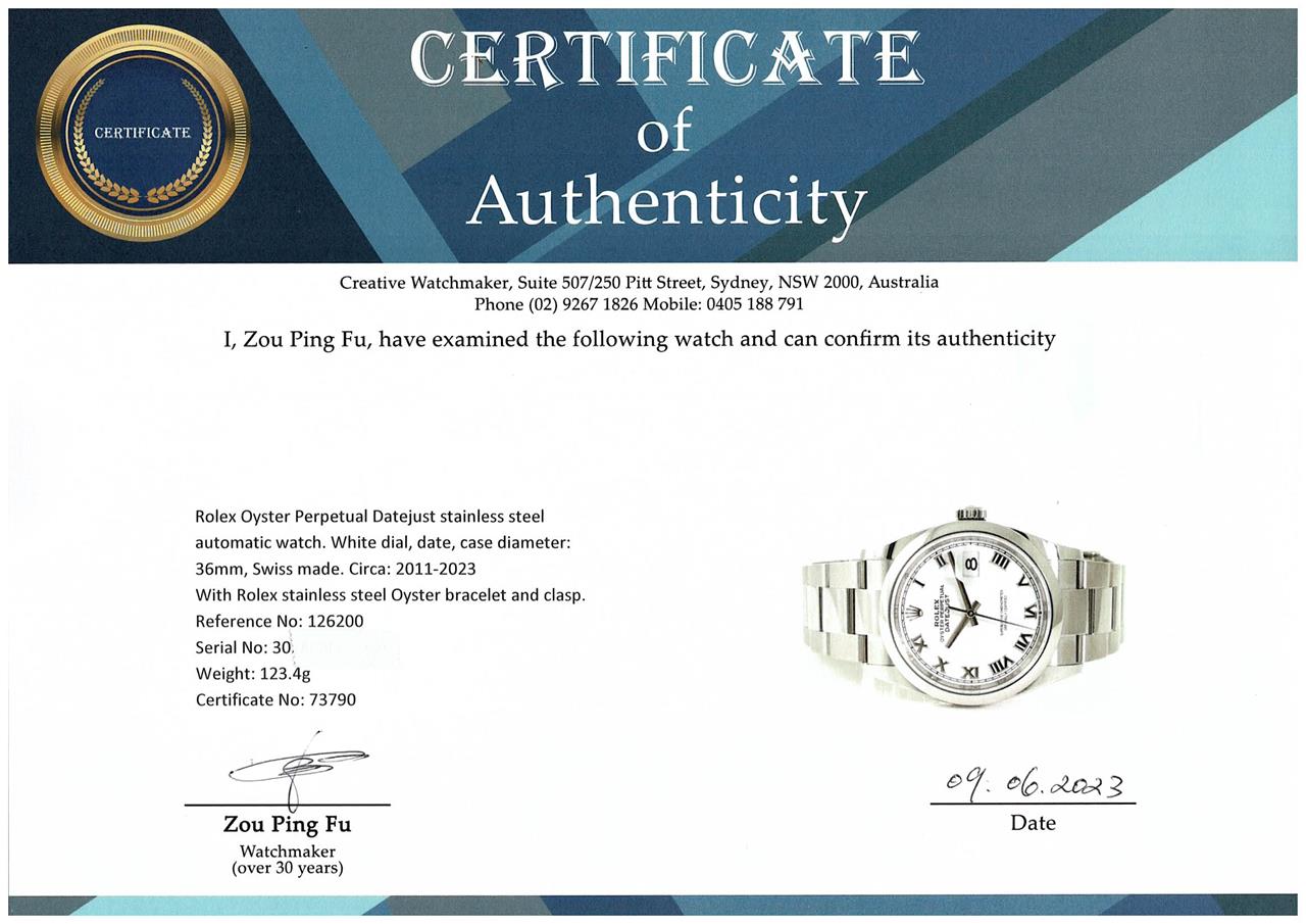 Rolex Oyster Perpetual Datejust stainless steel automatic watch. White dial, date, case diameter: 36mm, wrist size: 18.5cm, Swiss made. Ref# 126200, Circa: 2011-2023. With Rolex stainless steel Oyster bracelet and clasp. With Certificate of Authenticity, Rolex International Guarantee card dated 29/09/2019 and Rolex Box. 3 month FSA warranty. (Pre-owned)