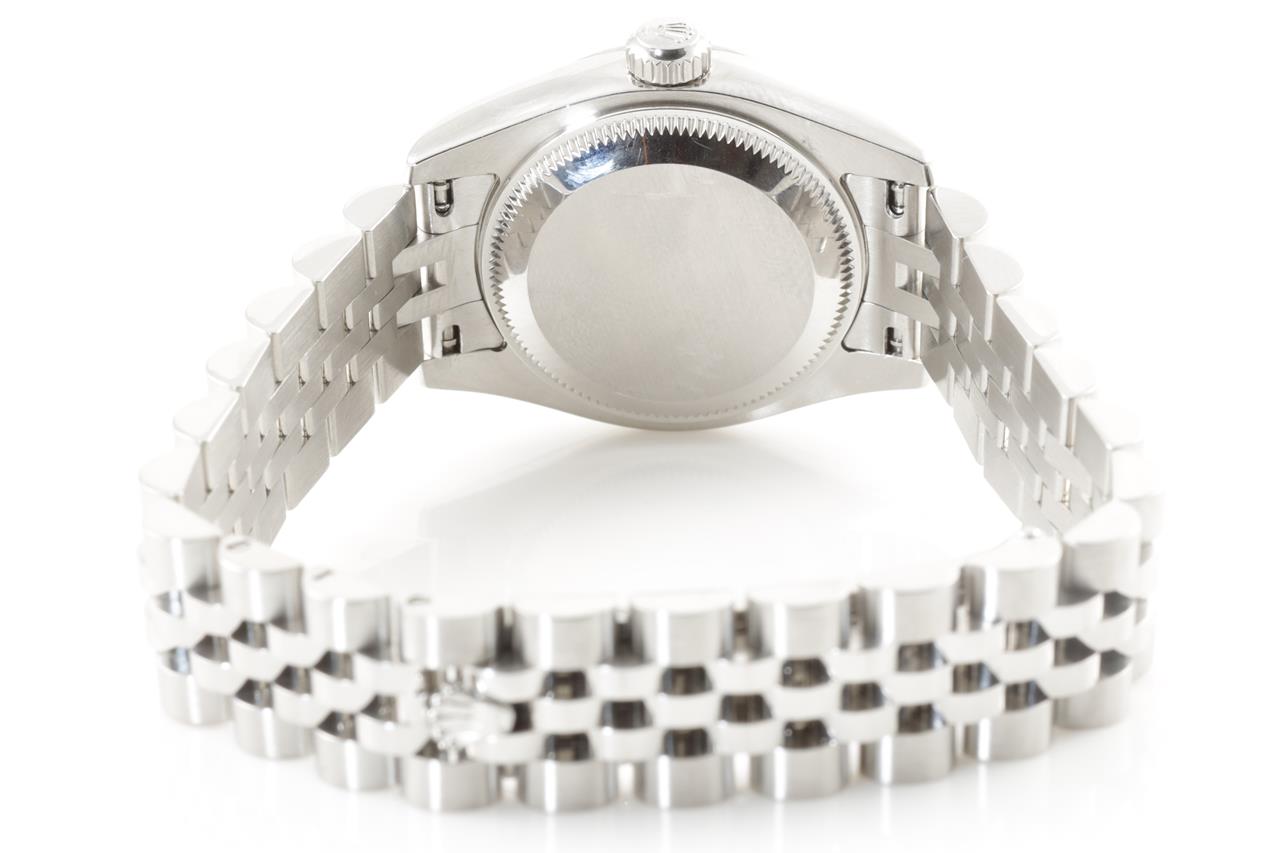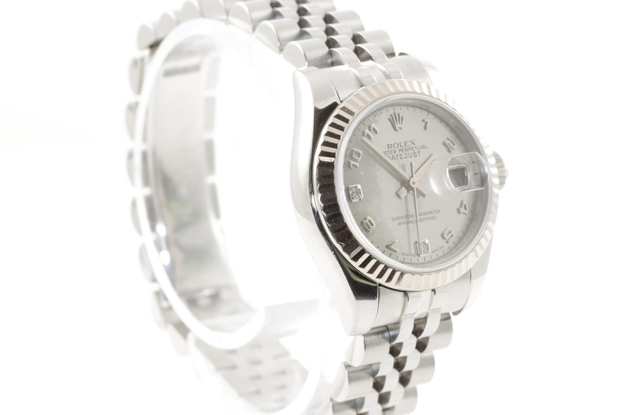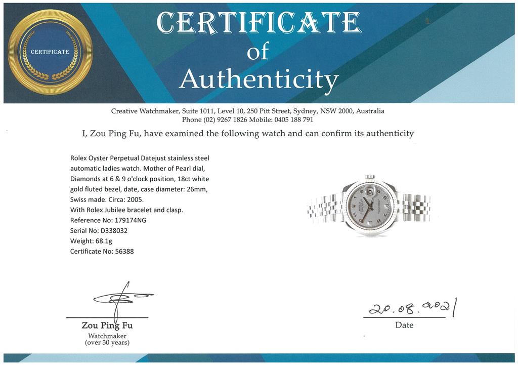 Rolex Oyster Perpetual Datejust stainless steel automatic ladies watch. Mother of Pearl dial, Diamonds at 6 & 9 o'clock position, 18ct white gold fluted bezel, date, case diameter: 26mm, wrist size: 15.5cm, Swiss made. Ref# 179174NG, Circa: 2005. With Rolex Jubilee bracelet and clasp. With certificate of authenticity, Rolex guarantee certificate dated 14/05/2006 and Rolex box. (Pre-owned)