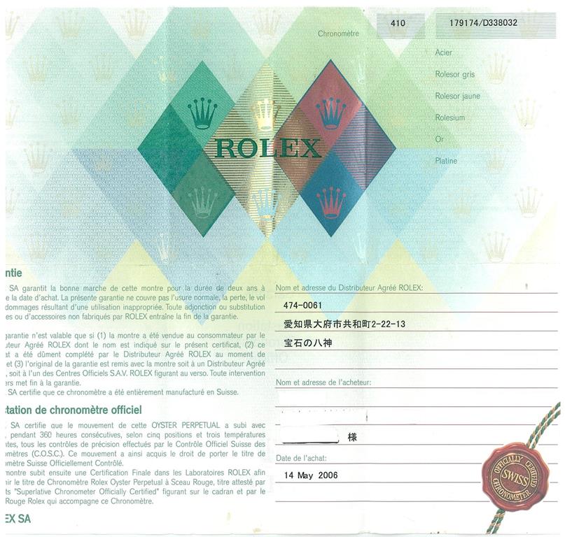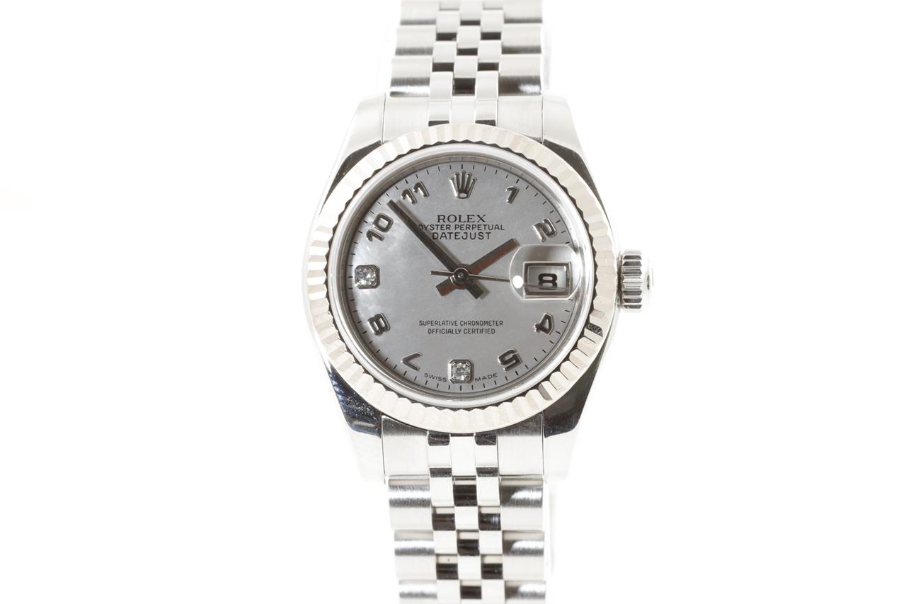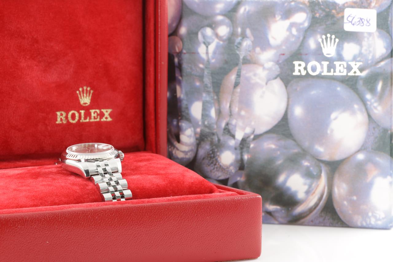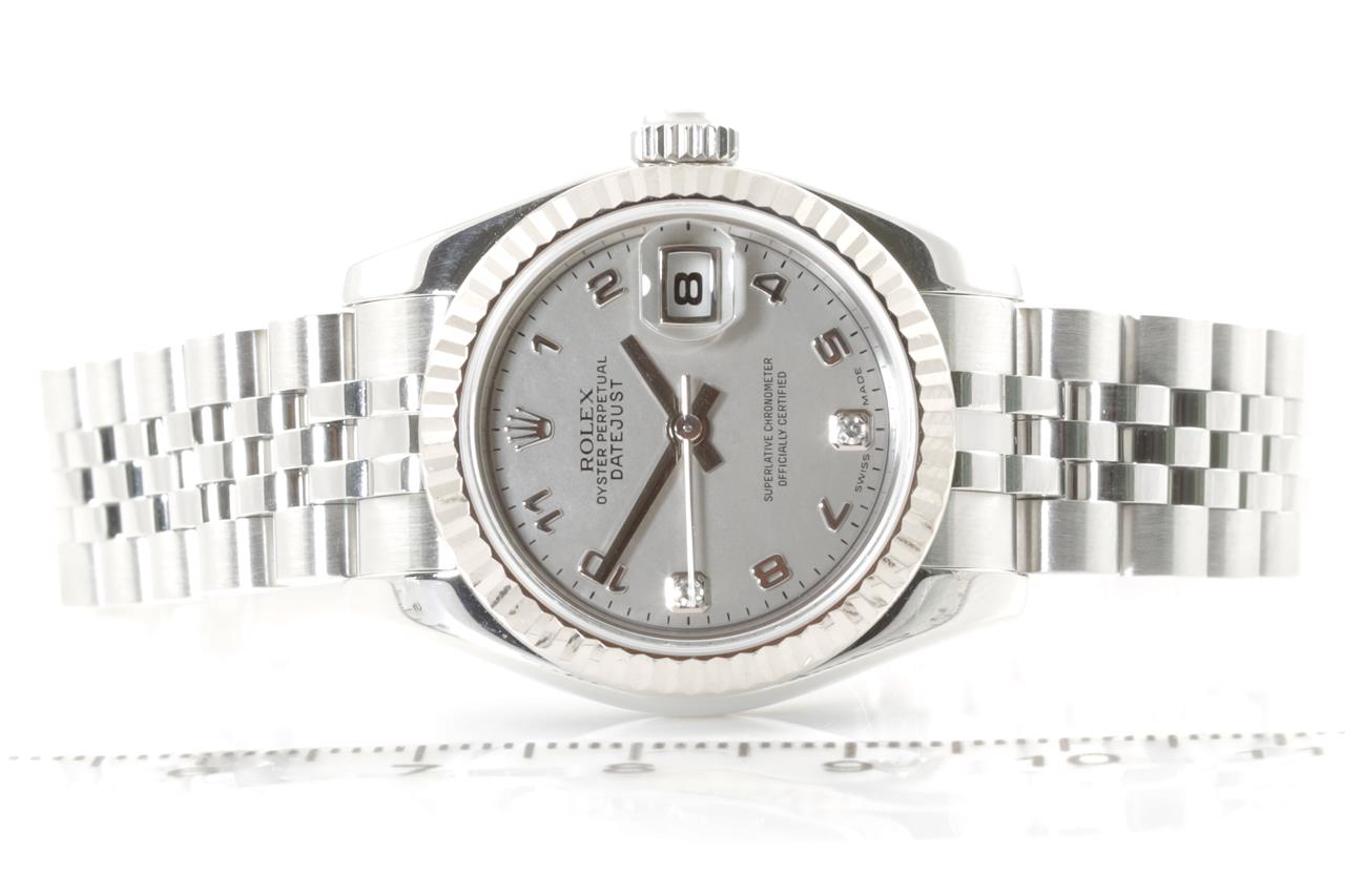 Rolex Oyster Perpetual Datejust stainless steel automatic ladies watch. Mother of Pearl dial, Diamonds at 6 & 9 o'clock position, 18ct white gold fluted bezel, date, case diameter: 26mm, wrist size: 15.5cm, Swiss made. Ref# 179174NG, Circa: 2005. With Rolex Jubilee bracelet and clasp. With certificate of authenticity, Rolex guarantee certificate dated 14/05/2006 and Rolex box. (Pre-owned)