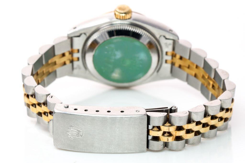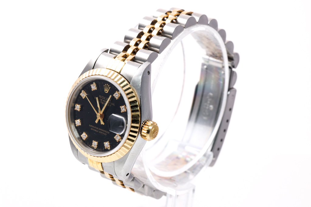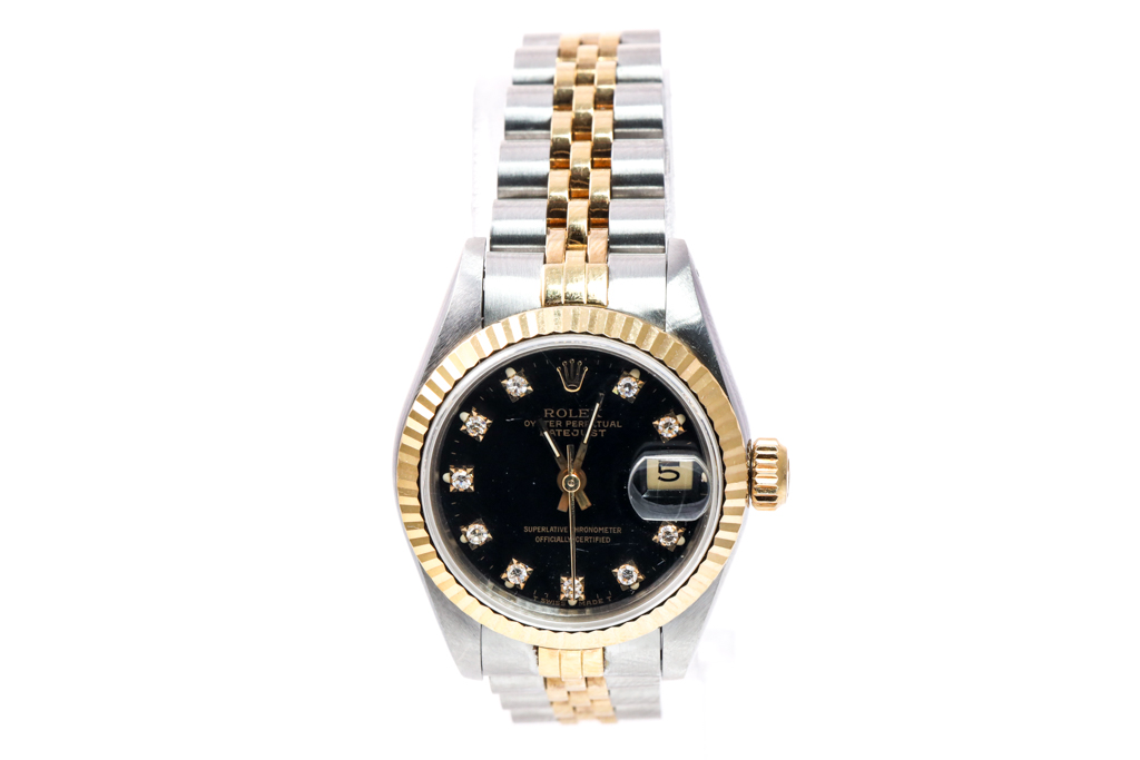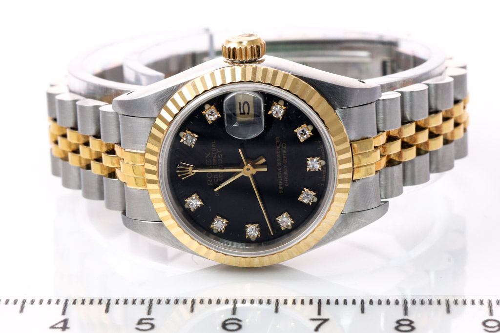 Rolex Oyster Perpetual Datejust 18ct yellow gold and stainless steel automatic ladies watch. Black dial, Diamond indicators, date, case diameter: 26mm, wrist size: 14.5cm, Swiss made. Ref# 69173G. Circa: 1988. With Rolex two tone Jubilee bracelet and clasp. With Certificate of Authenticity, Rolex Guarantee Certificate dated 25/01/1990 and Rolex box. 3 month FSA warranty (Pre-owned)