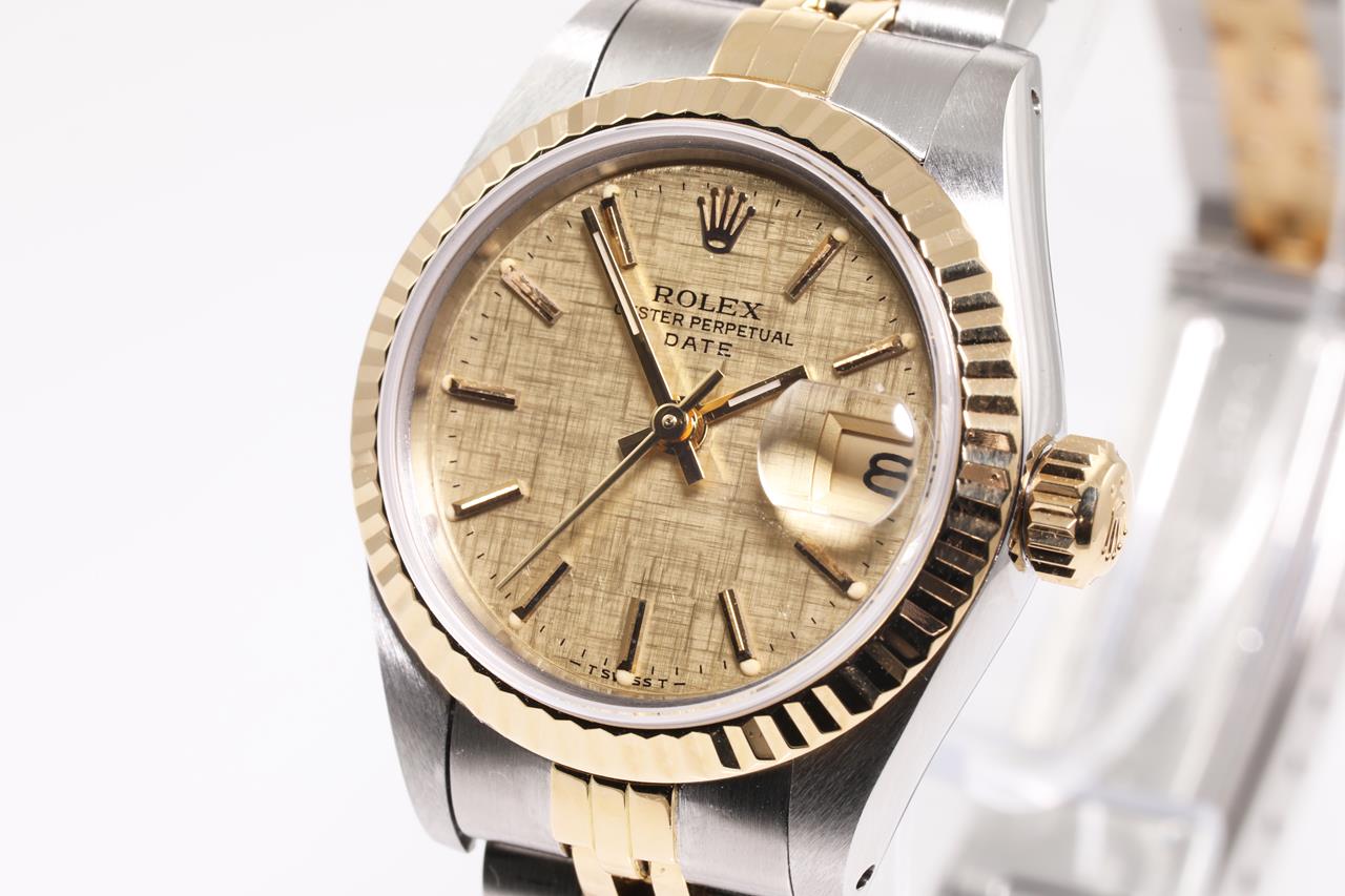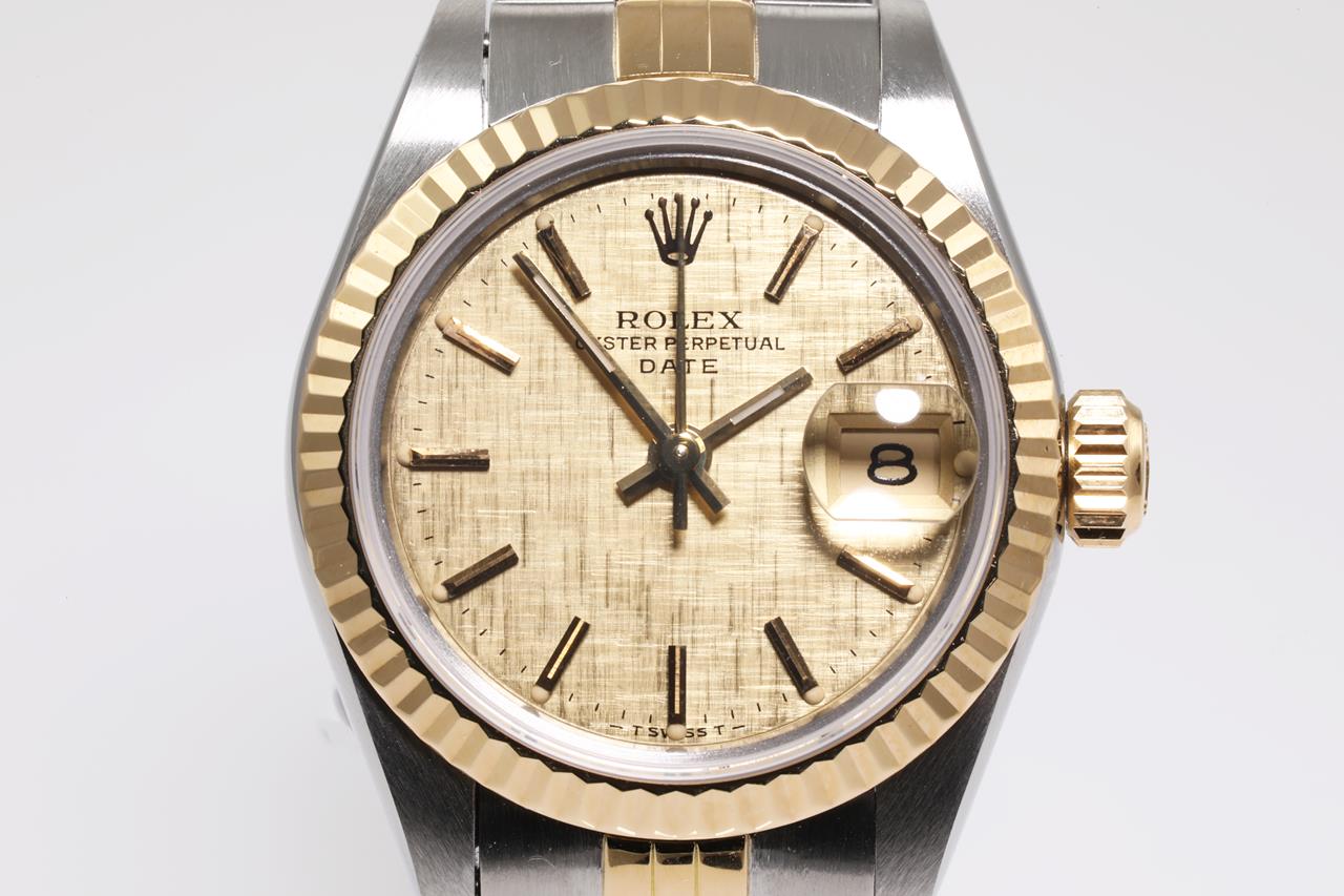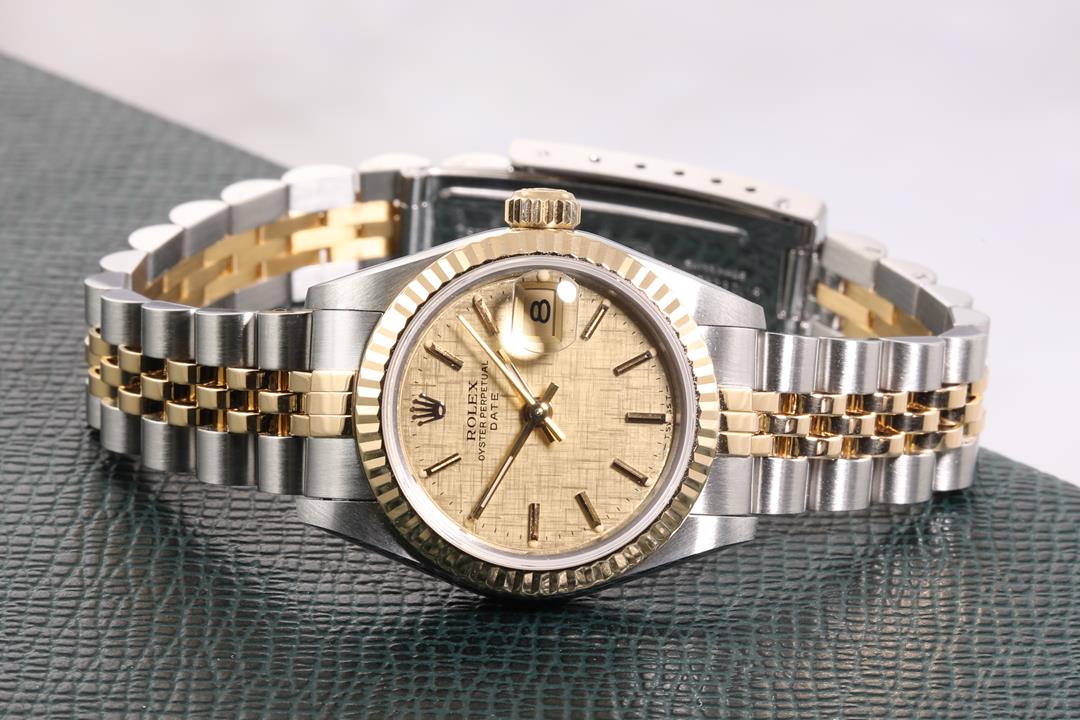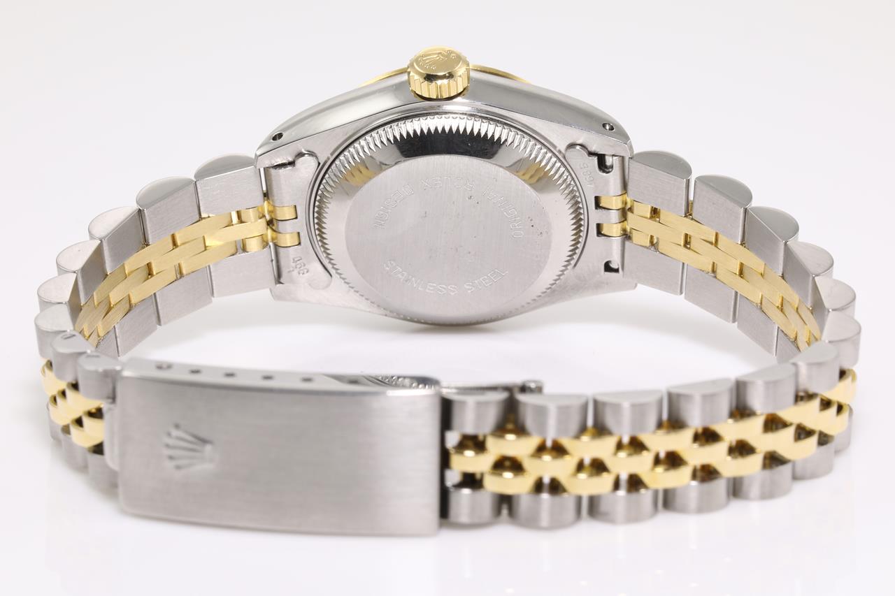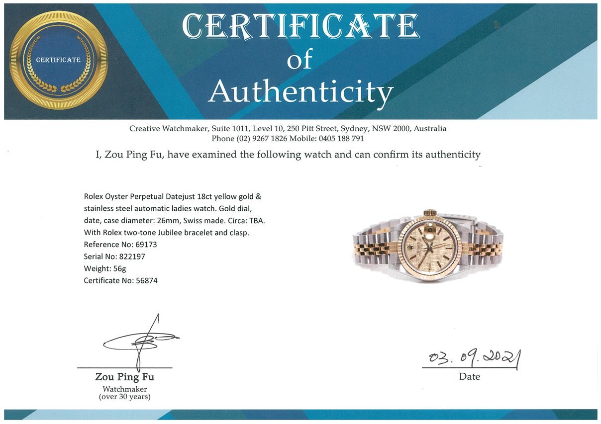 Rolex Oyster Perpetual Datejust 18ct yellow gold & stainless steel automatic ladies watch. Gold dial, date, case diameter: 26mm, wrist size: 15cm, Swiss made. Ref# 69173, Circa: 1962. With Rolex two-tone Jubilee bracelet and clasp. With certificate of authenticity, Rolex international service guarantee card dated 10/12/2020 and Rolex box with Rolex gift shopping bag. 3 month FSA warranty. (Pre-owned)