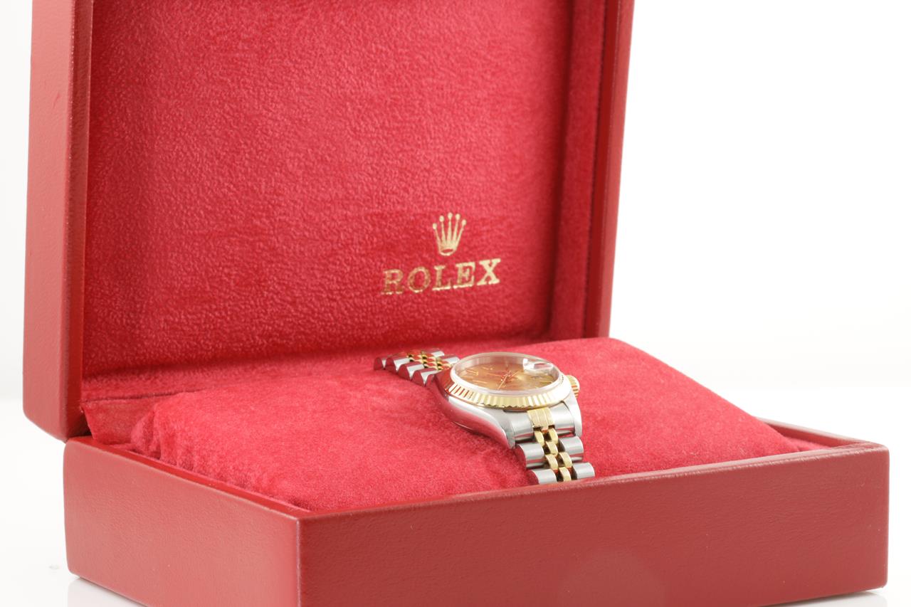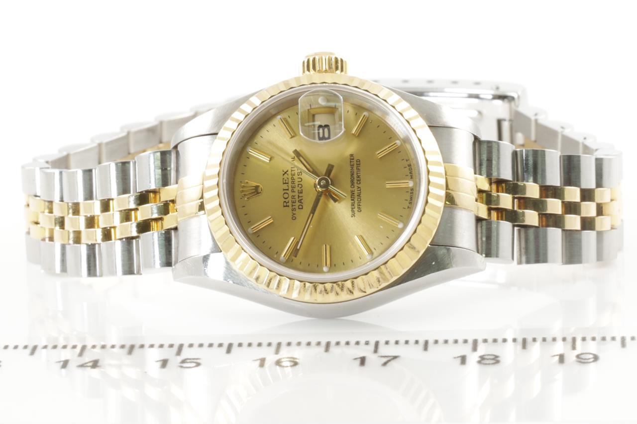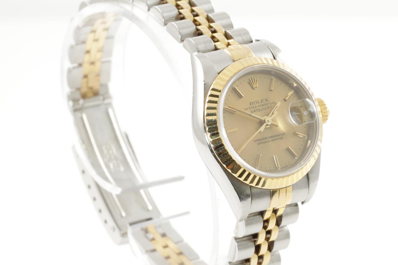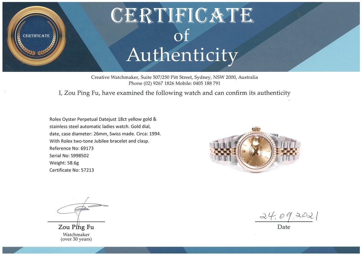 Rolex Oyster Perpetual Datejust 18ct yellow gold & stainless steel automatic ladies watch. Gold dial, date, case diameter: 26mm, wrist size: 16.5cm, Swiss made. Ref# 69173, Circa: 1994. With Rolex two-tone Jubilee bracelet and clasp. With certificate of authenticity and Rolex box with Rolex gift bag. 3 month FSA warranty. (Pre-owned)