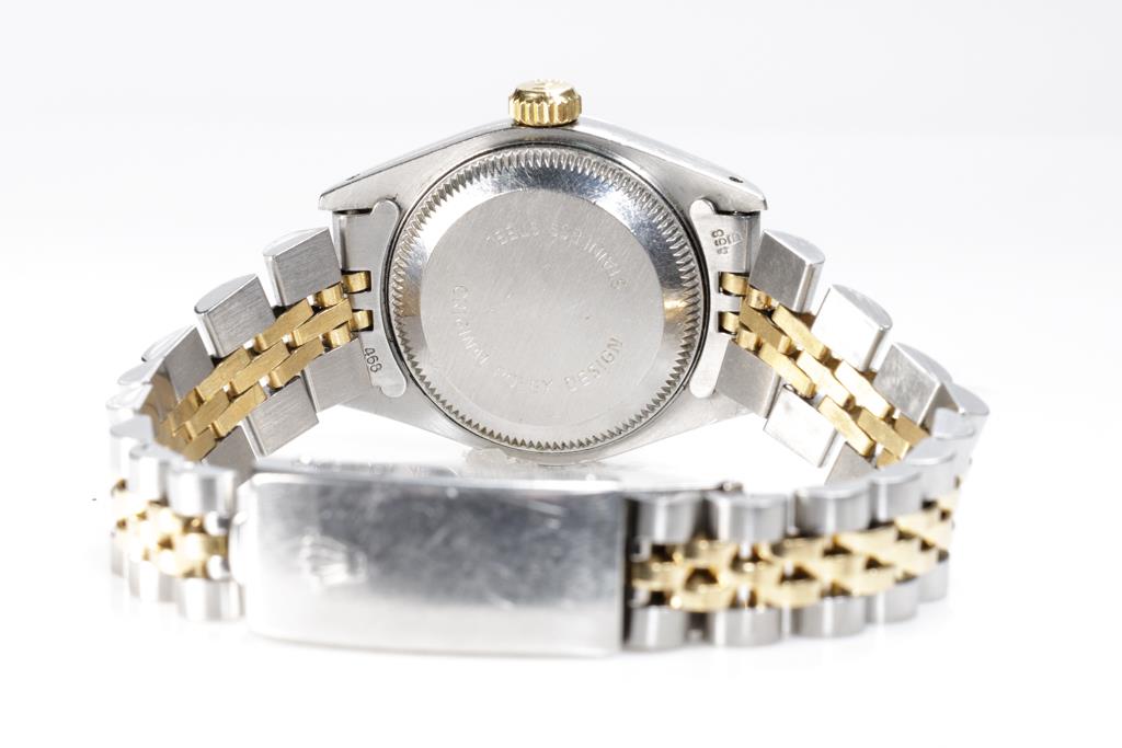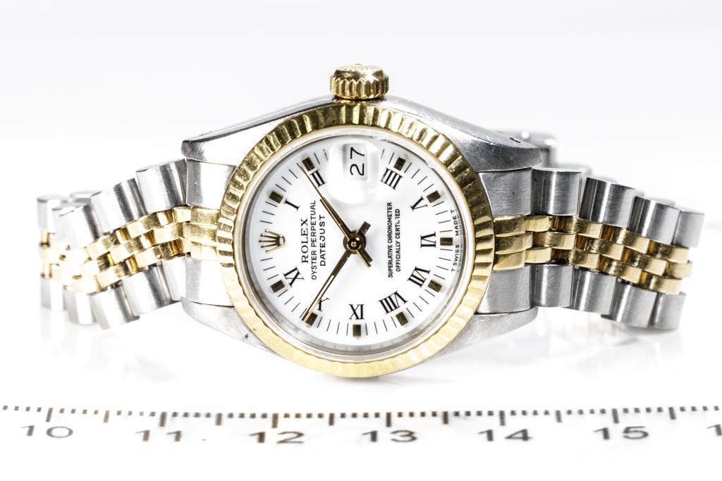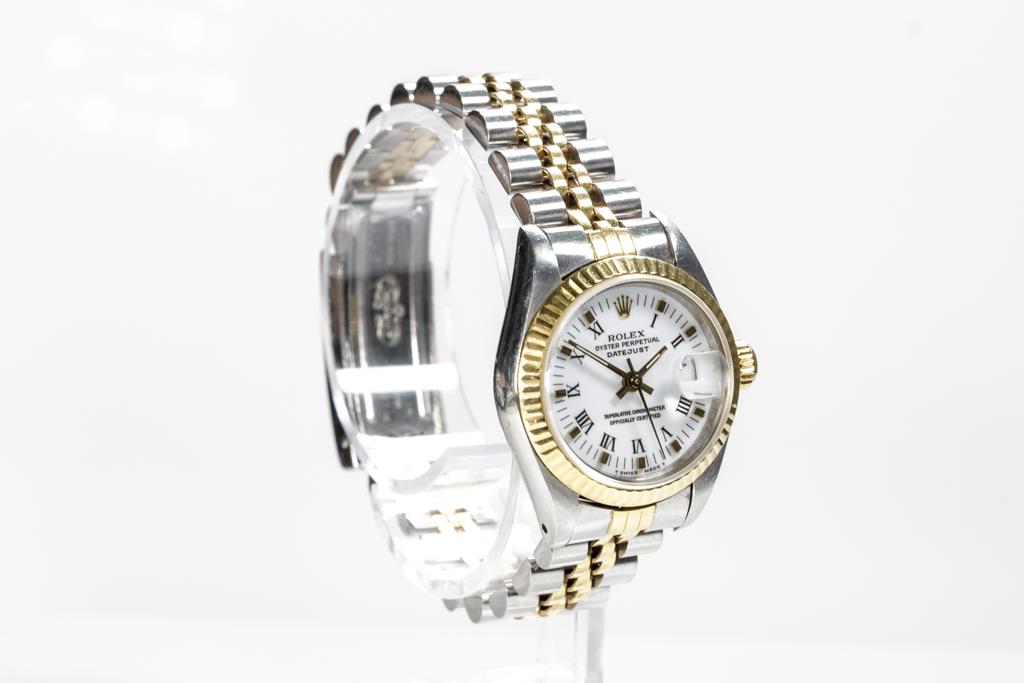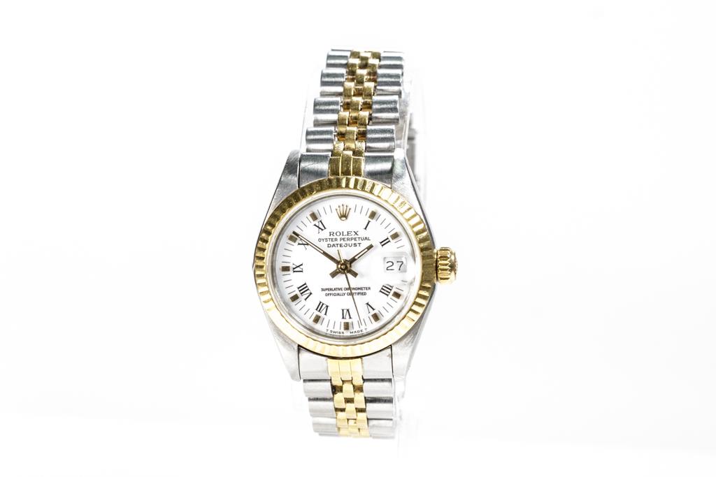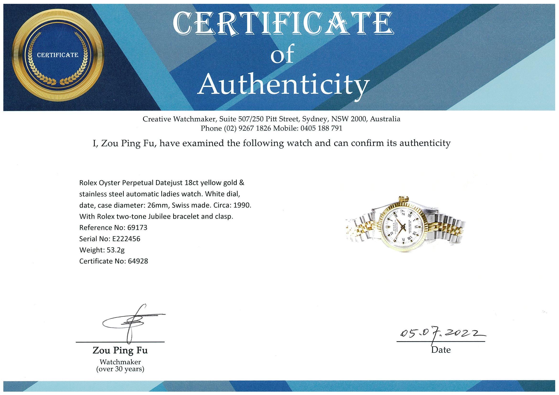 Rolex Oyster Perpetual Datejust 18ct yellow gold & stainless steel automatic ladies watch. White dial, date, case diameter: 26mm, wrist size: 16cm, Swiss made. Ref# 69173, Circa: 1990. With Rolex two-tone Jubilee bracelet and clasp. With Certificate of Authenticity, Rolex guarantee certificate dated 23/04/1996 and Rolex box. 6 month Creative watchmaker warranty from the date of full service. (Pre-owned)