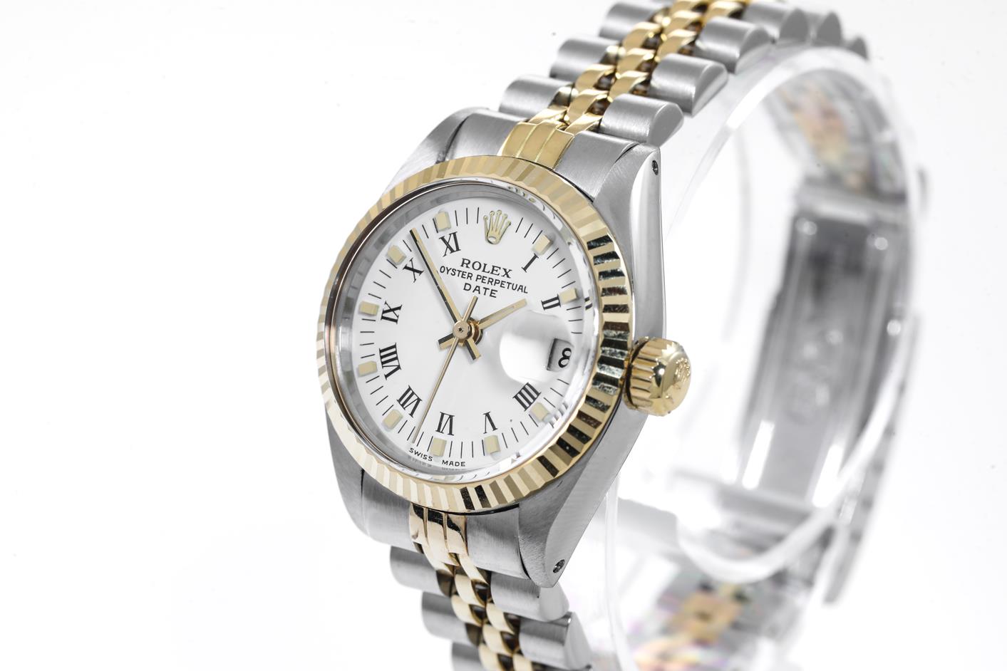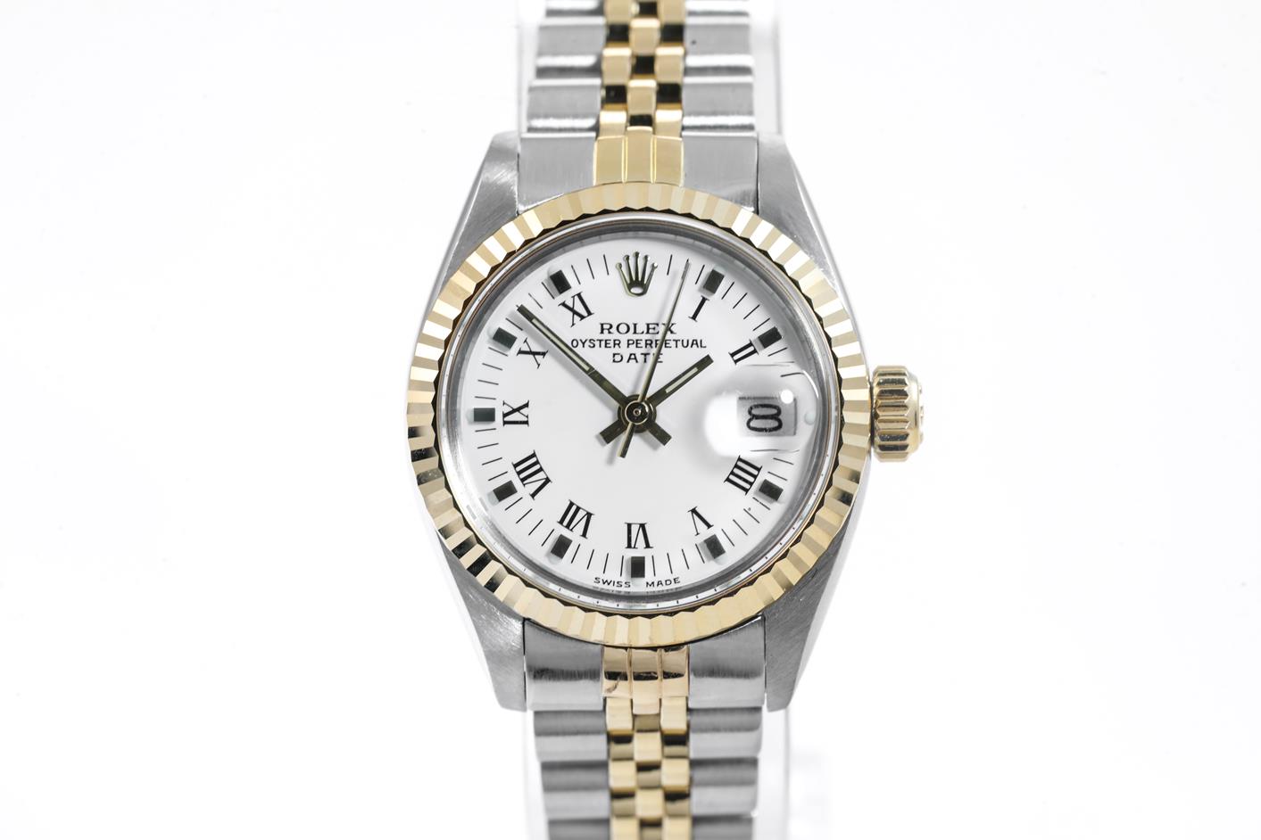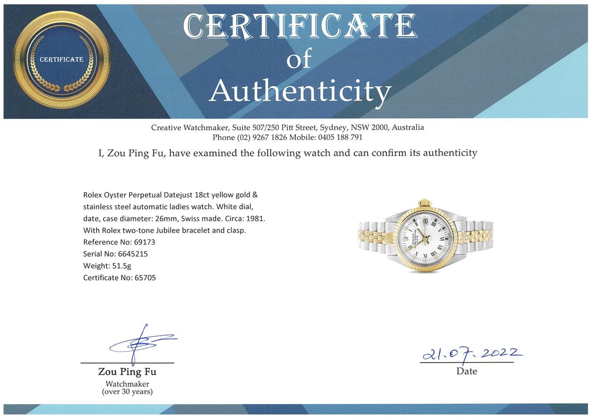 Rolex Oyster Perpetual Datejust 18ct yellow gold & stainless steel automatic ladies watch. White dial, date, case diameter: 26mm, wrist size: 15cm, Swiss made. Ref# 69173, Circa: 1981. With Rolex two-tone Jubilee bracelet and clasp. With Certificate of Authenticity, Rolex International Service Guarantee card dated 18/12/2012 and Rolex box. 3 month FSA warranty. (Pre-owned)