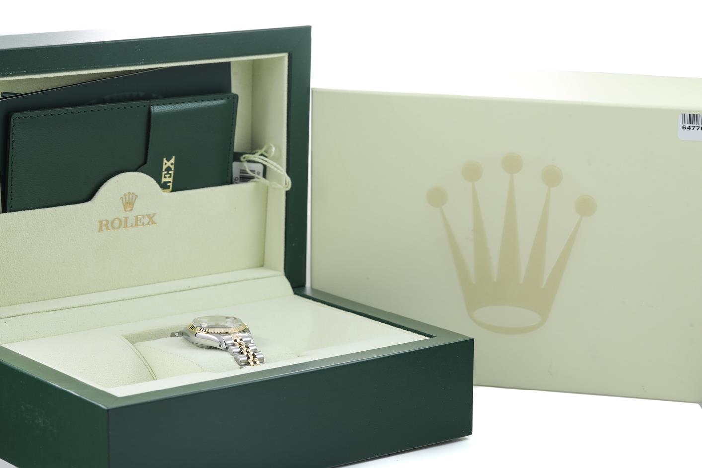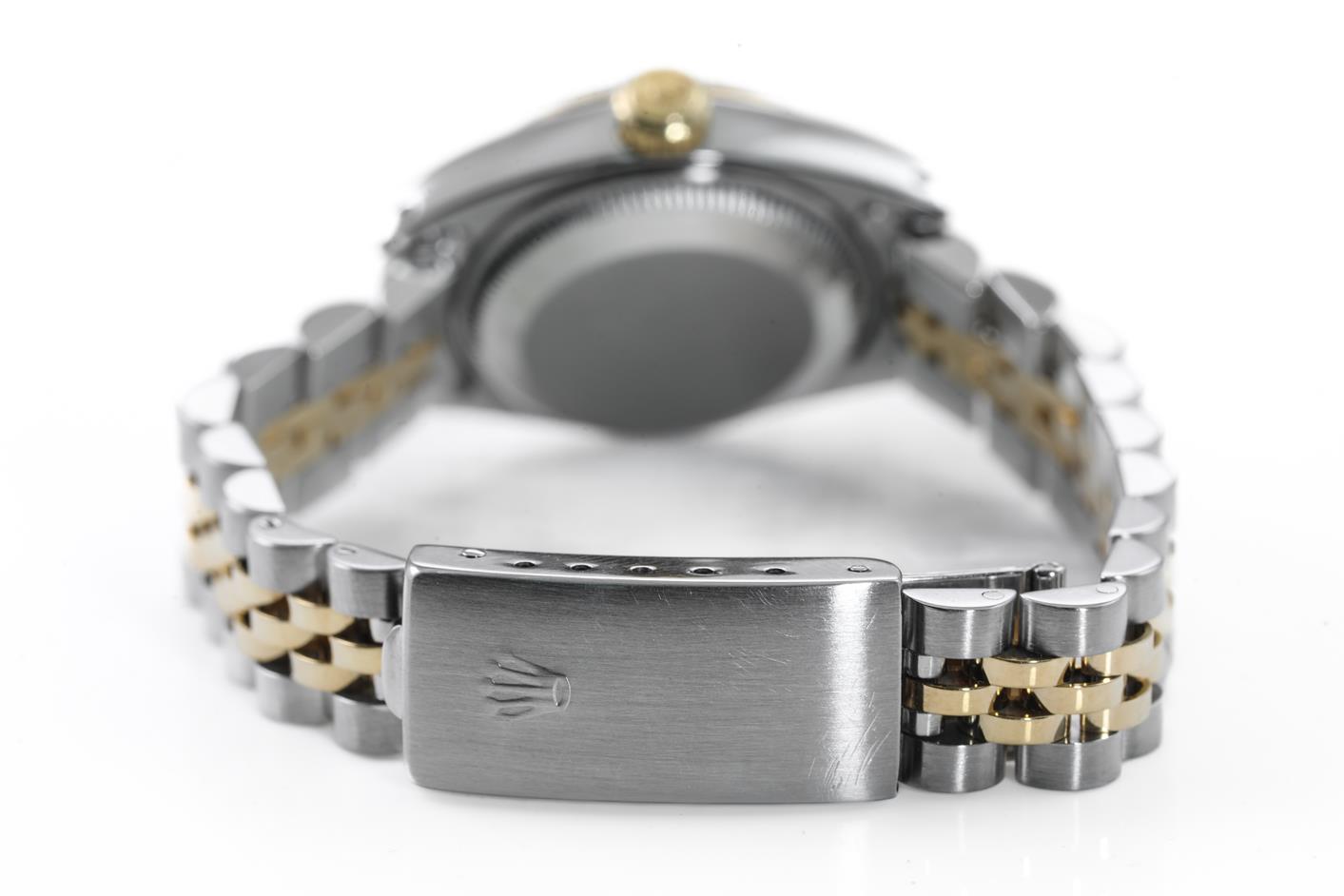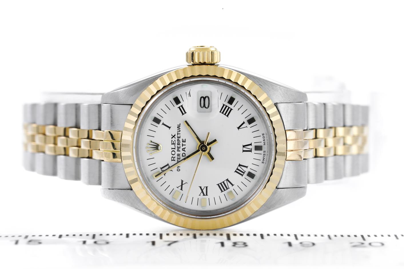 Rolex Oyster Perpetual Datejust 18ct yellow gold & stainless steel automatic ladies watch. White dial, date, case diameter: 26mm, wrist size: 15cm, Swiss made. Ref# 69173, Circa: 1981. With Rolex two-tone Jubilee bracelet and clasp. With Certificate of Authenticity, Rolex International Service Guarantee card dated 18/12/2012 and Rolex box. 3 month FSA warranty. (Pre-owned)