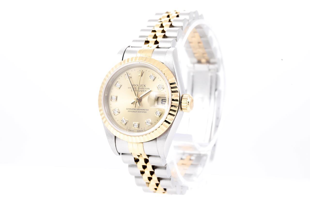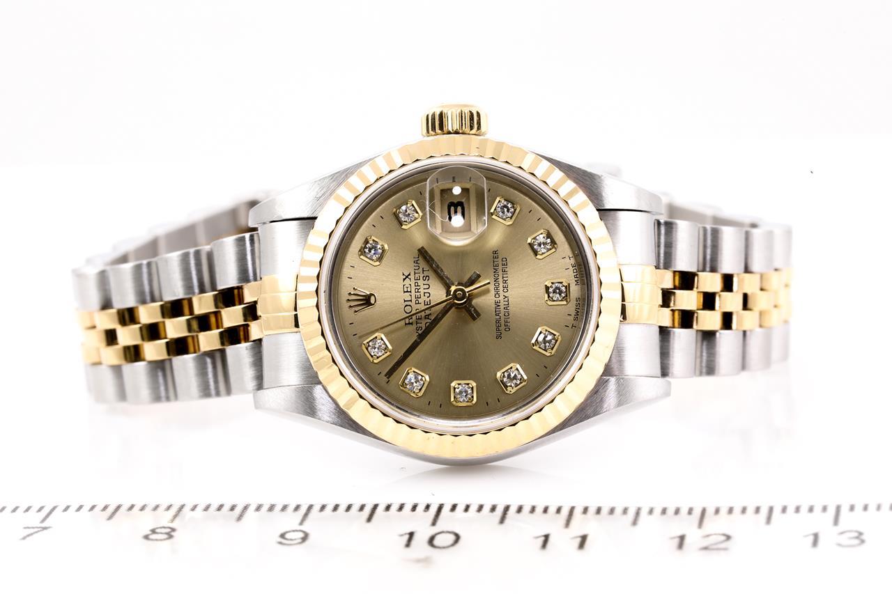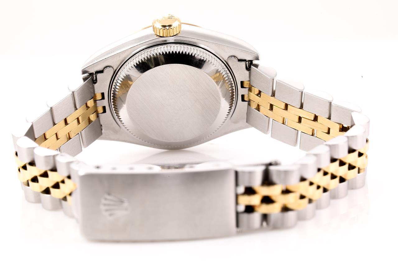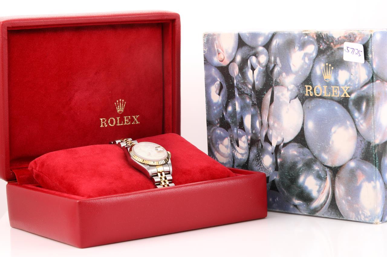 Rolex Oyster Perpetual Datejust 18ct yellow gold & stainless steel automatic ladies watch. Gold dial, date, case diameter: 26mm, wrist size: 14cm, Swiss made. Ref# 69173G. Circa 1995. With Rolex two-tone Jubilee bracelet and clasp. With certificate of authenticity and Rolex box. 6 month Prestige watchmaker warranty from the date of full service. (Pre-owned)