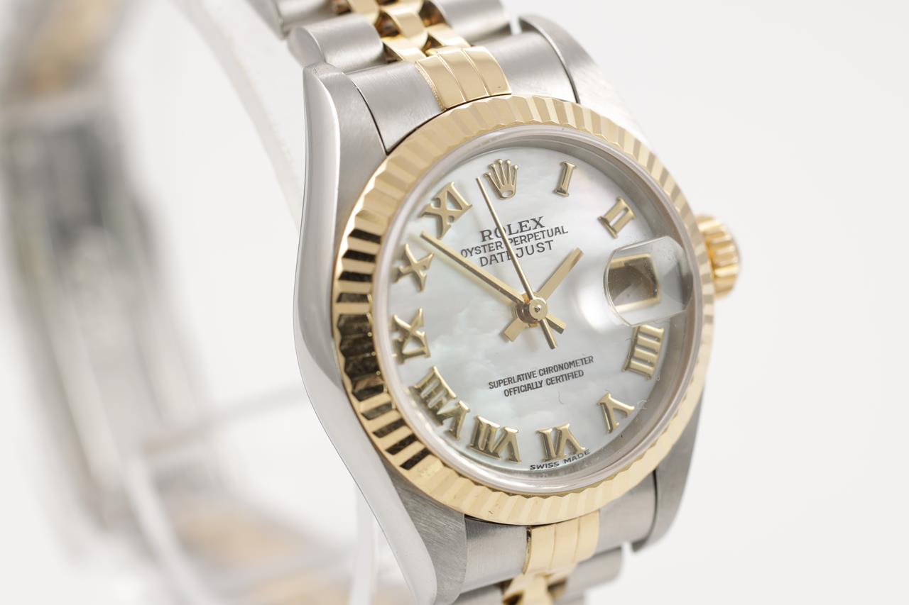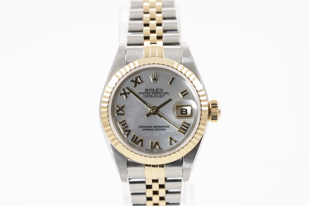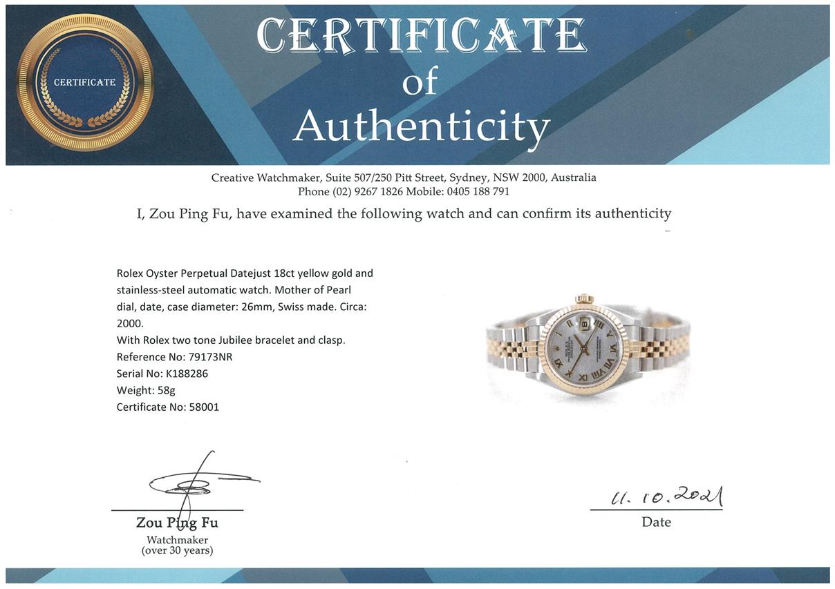Rolex Oyster Perpetual Datejust 18ct yellow gold and stainless steel automatic watch. Mother of Pearl dial, date, case diameter: 26mm, wrist size: 16cm, Swiss made. Ref# 79173NR, Circa: 2000. With Rolex two tone Jubilee bracelet and clasp. With certificate of authenticity and Rolex box. 3 month FSA warranty. (Pre-owned)