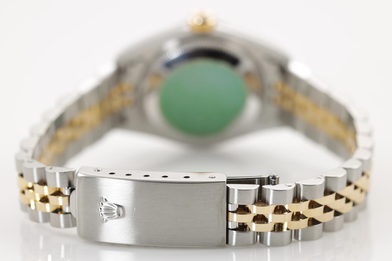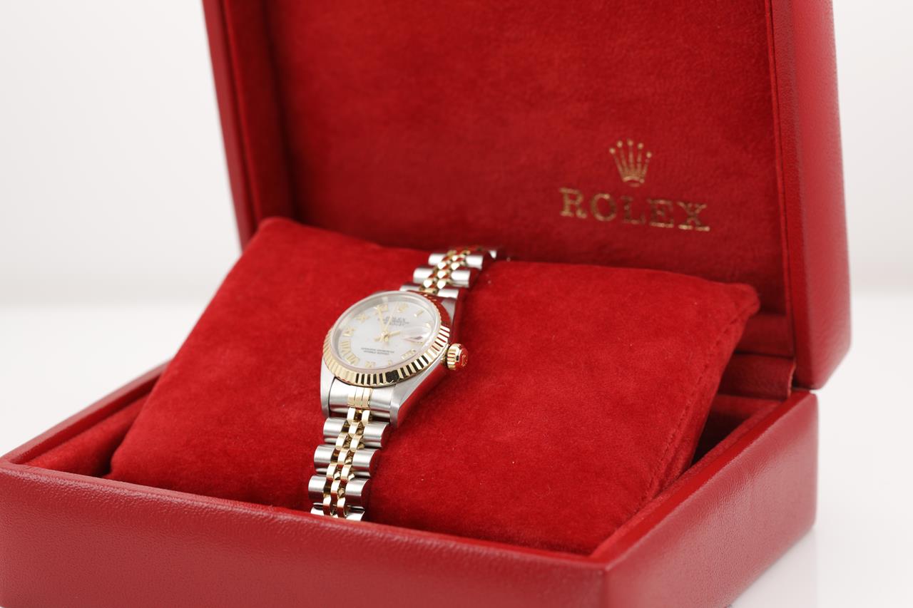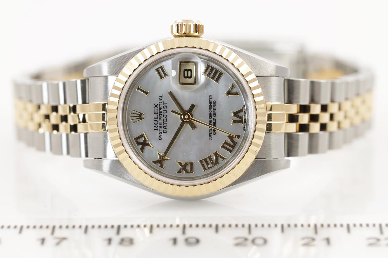 Rolex Oyster Perpetual Datejust 18ct yellow gold and stainless steel automatic watch. Mother of Pearl dial, date, case diameter: 26mm, wrist size: 16cm, Swiss made. Ref# 79173NR, Circa: 2000. With Rolex two tone Jubilee bracelet and clasp. With certificate of authenticity and Rolex box. 3 month FSA warranty. (Pre-owned)