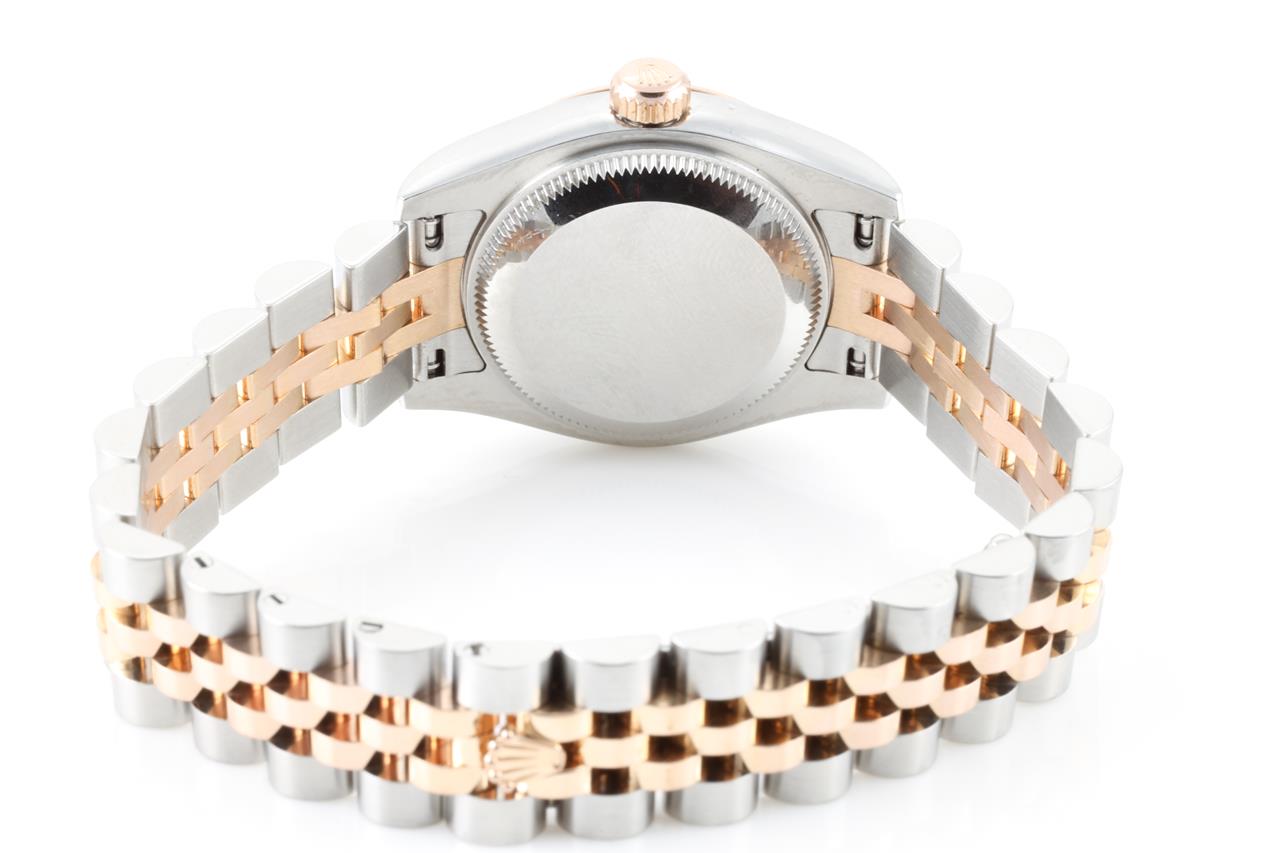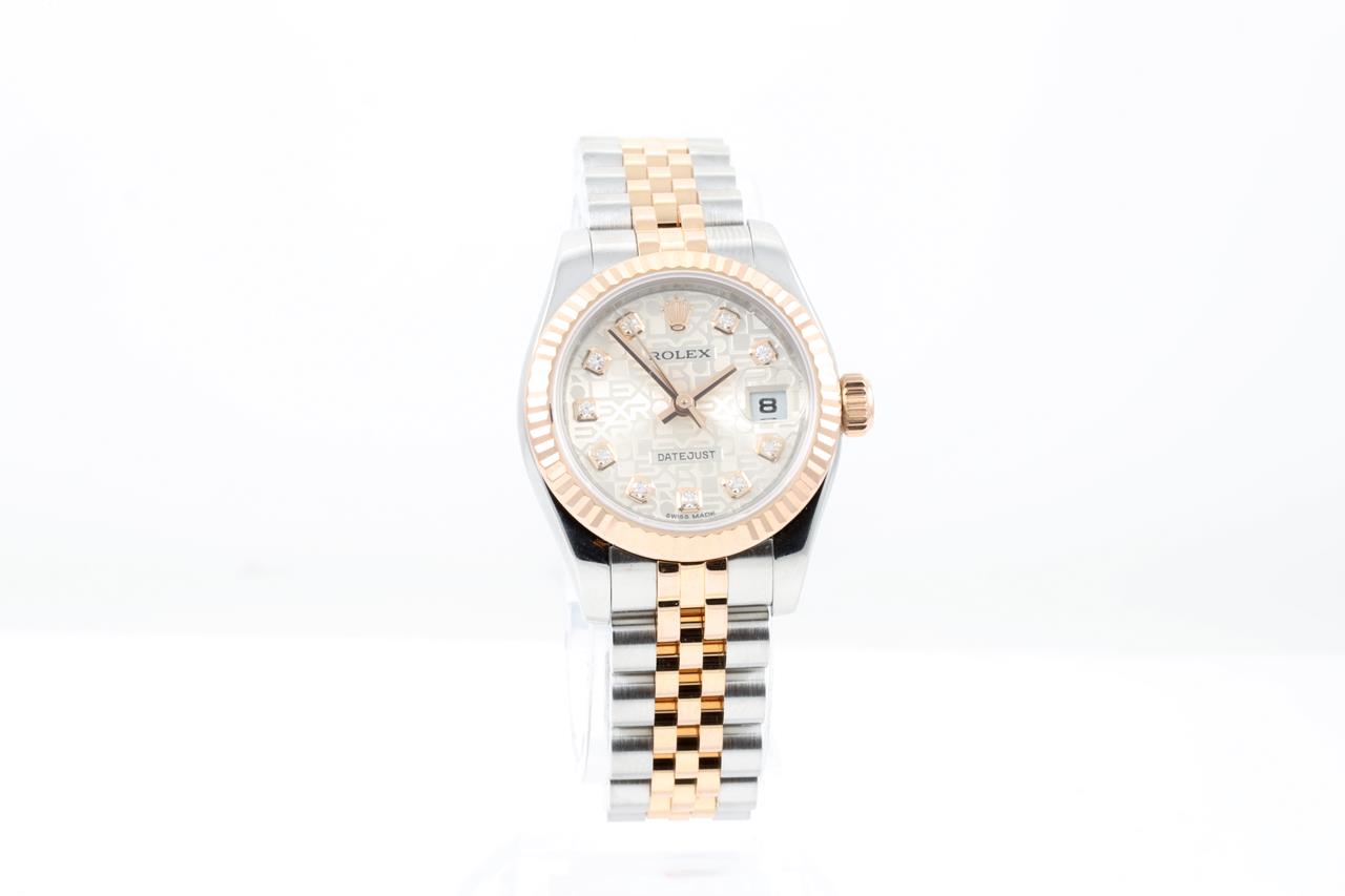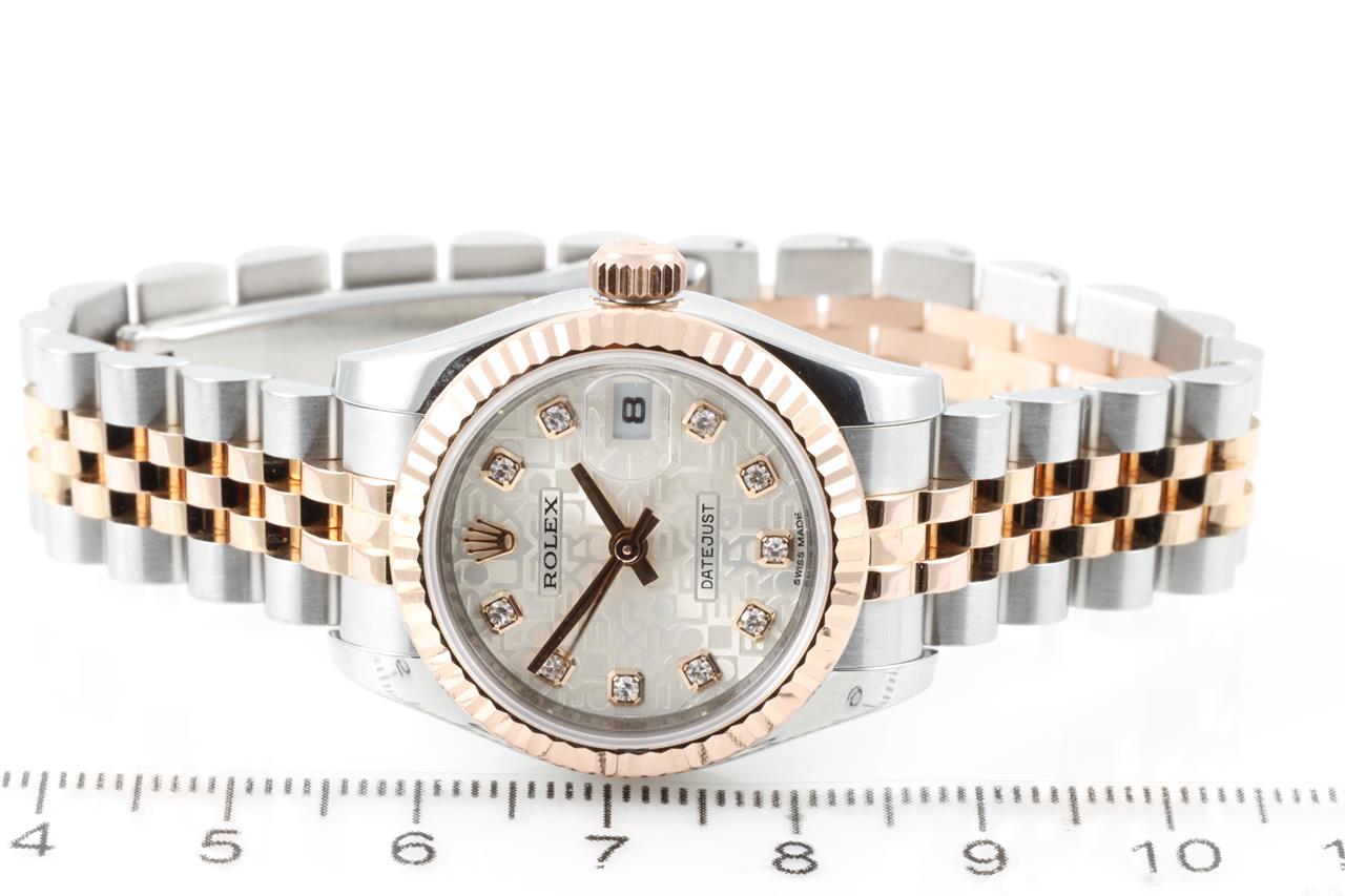 Rolex Oyster Perpetual Datejust 18ct rose gold and stainless steel automatic ladies watch. Silver monogram dial, date, Diamond indicators, case diameter: 26mm, wrist size: 15.5cm, Swiss made. Ref# 179171G, Circa: 1996. With two-tone Rolex Jubilee bracelet and clasp. Ref# 179171G, Circa: 2011-2021. With certificate of authenticity. With Rolex Guarantee card dated 17 Dec 2016 inside Rolex box. 3 month FSA warranty. (Pre-owned)